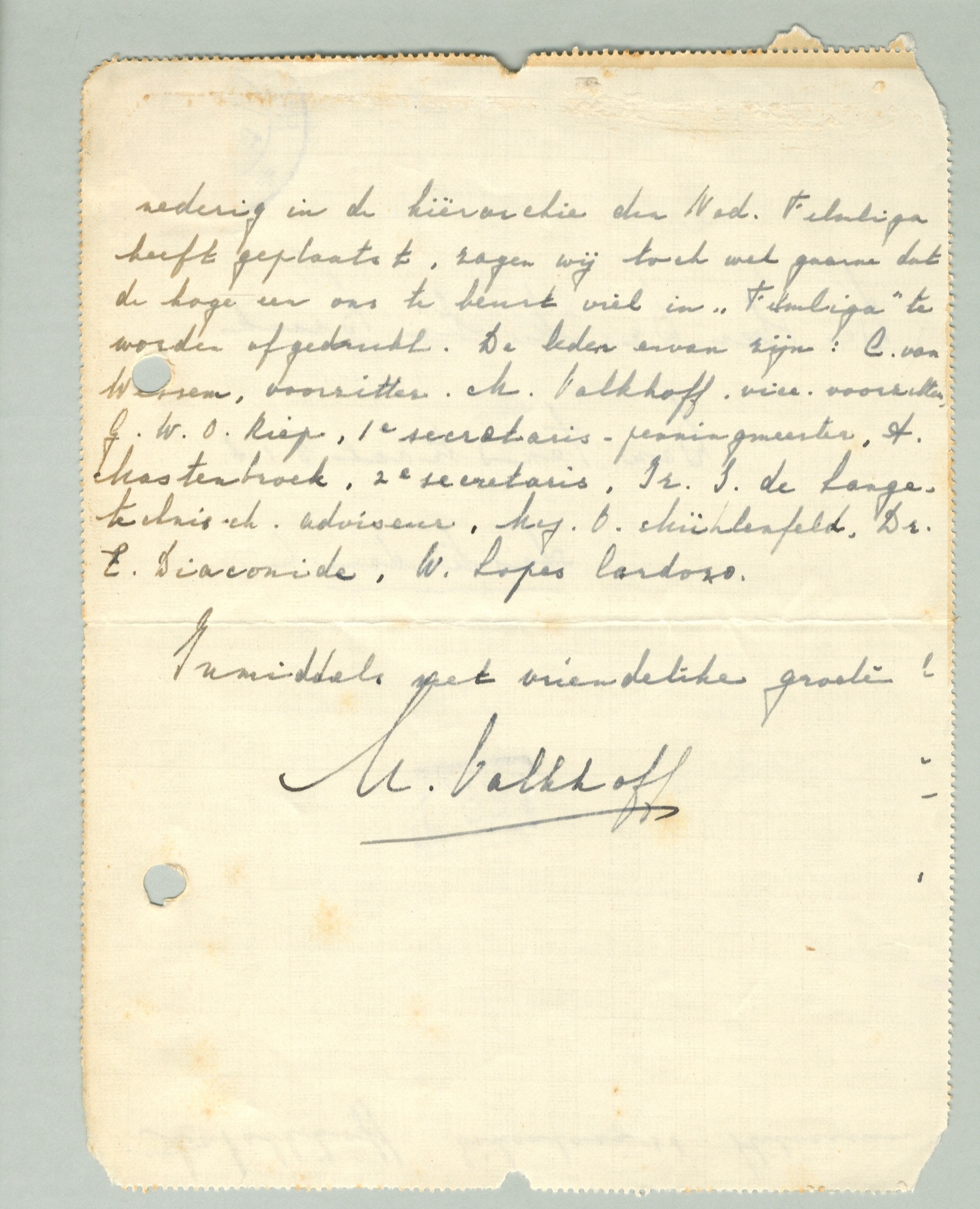 Verder is nog nooit ons bestuur in zijn volle glorie in Filmliga afgedrukt. Daar 't toch wettig gekozen is en de afdeling zich nederig in de hiërarchie der Ned. Filmliga heeft geplaatst, zagen wij toch wel gaarne dat de hoge eer ons te beurt viel in Filmliga te worden afgedrukt. De leden ervan zijn: C. van Wessem, voorzitter. H. Valkhoff, vice-voorzitter. G.W.O. Riep, 1e secretaris-penningmeester, A. Mastenbroek, 2e secretaris, Ir. I. De Lange, technisch-adviseur, Mej. O. Muhlenfeld, Dr. I. Diaconide, W. Lopes Cardozo.