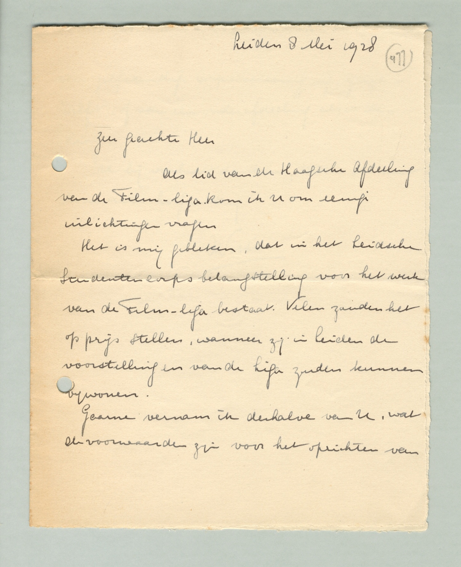 Het is mij gebleken, dat in het Leidsch Studenten Corps belangstelling voor het werk van de Film-liga bestaat. Velen zouden het op prijs stellen, wanneer zij in Leiden de voorstellingen van de Liga zouden kunnen bijwonen.