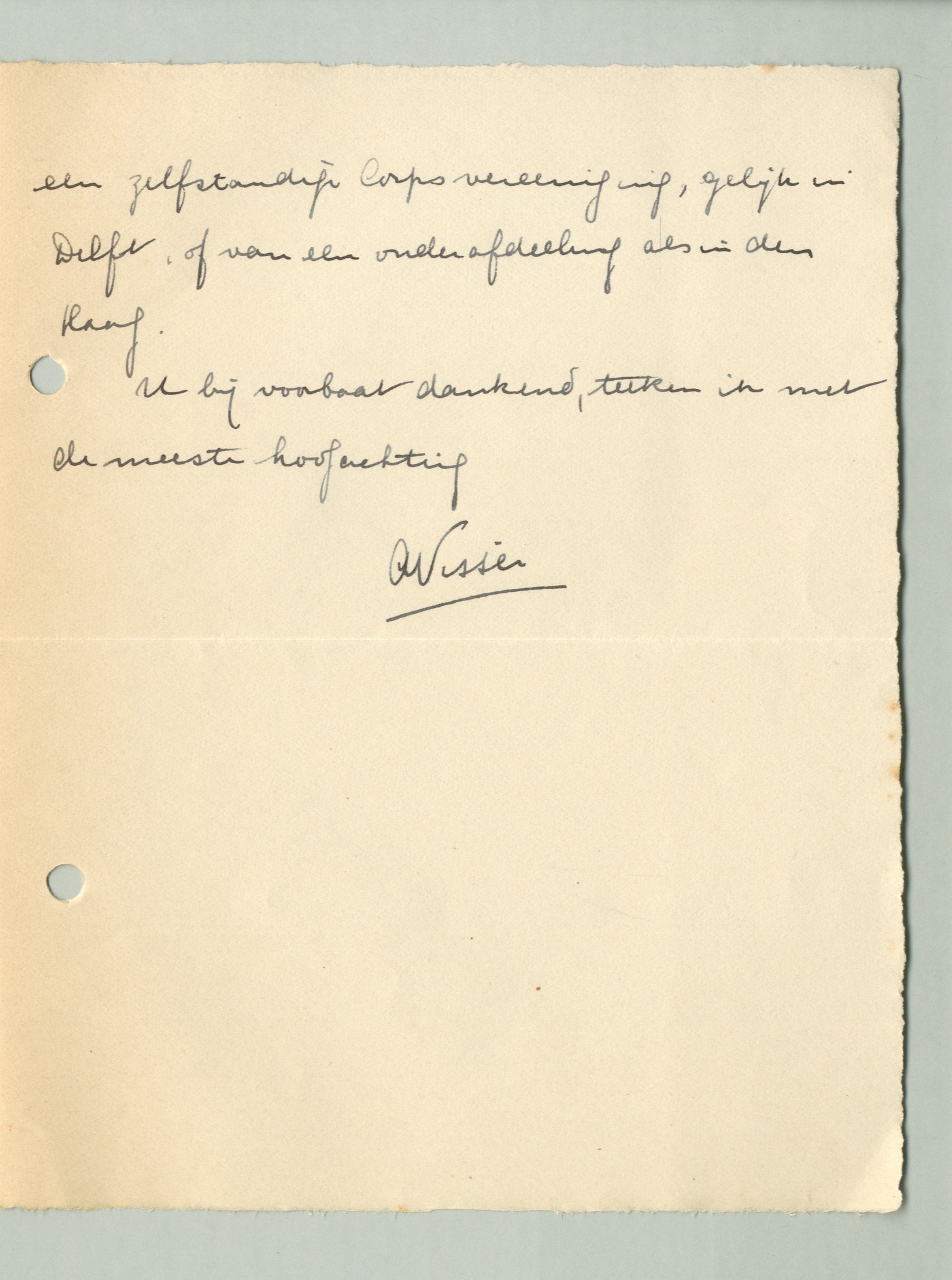 Gaarne vernam ik derhalve van U, wat de voorwaarden zijn voor het oprichten van een zelfstandige Corpsvereeniging, gelijk in Delft, of van een onderafdeeling als in den Haag.