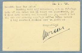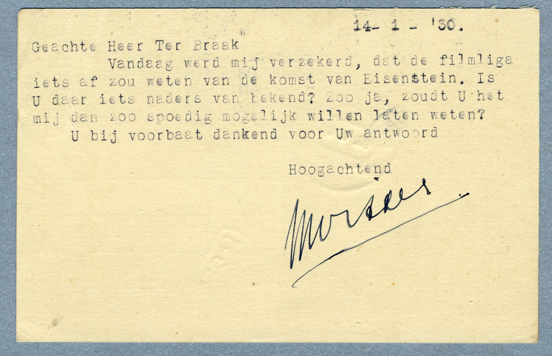 Vandaag werd mij verzekerd, dat de filmliga iets af zou weten van de komst van Eisenstein. Is U daar iets naders van bekend? Zoo ja, zoudt U het mij dan zoo spoedig mogelijk willen laten weten?