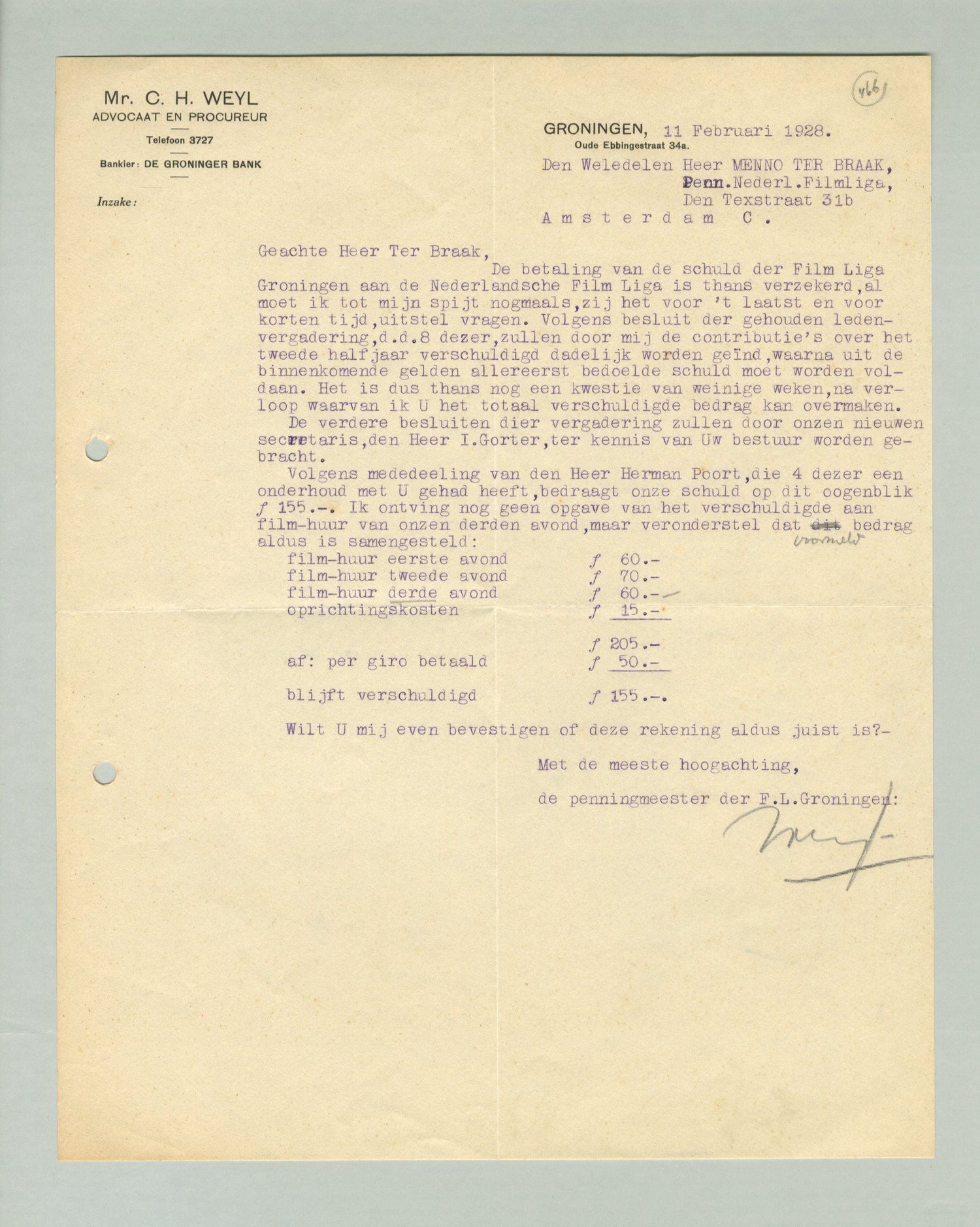 De betaling van de schuld der Film Liga Groningen aan de Nederlandsche Film Liga is thans verzekerd, al moet ik tot mijn spijt nogmaals, zij het voor 't laatst en voor korten tijd, uitstel vragen. Volgens besluit der gehouden ledenvergadering, d.d. 8 dezer, zullen door mij de contributie's over het tweede halfjaar verschuldigd dadelijk worden geïnd, waarna uit de binnenkomende gelden allereerst bedoelde schuld moet worden voldaan. Het is dus thans nog een kwestie van weinige weken, na verloop waarvan ik U het totaal verschuldigde bedrag kan overmaken.