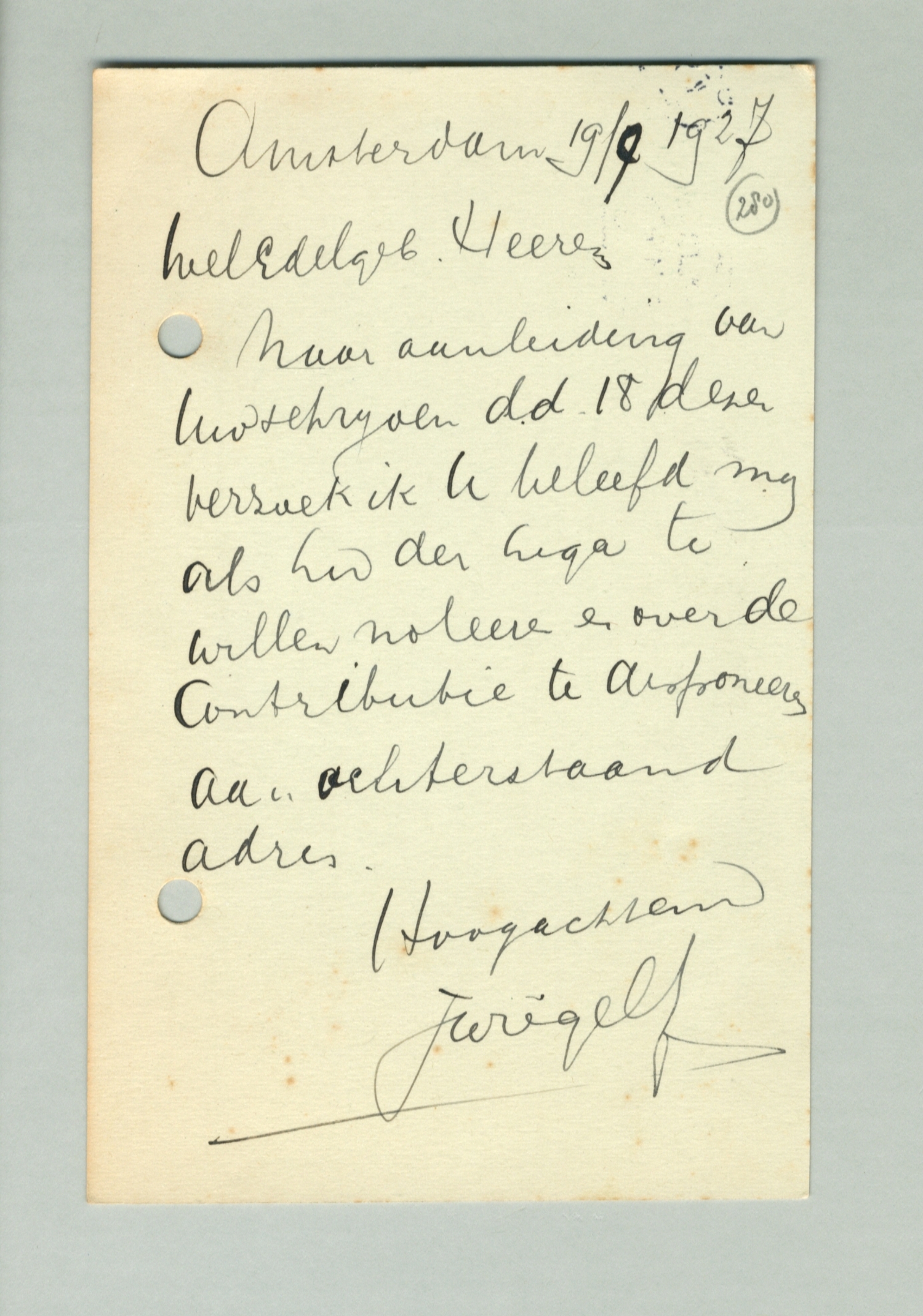 Naar aanleiding van Uw schrijven d.d. 18 dezer verzoek ik U beleefd mij als lid der Liga te willen noteeren en over de contributie te disponeeren aan achterstaand adres.