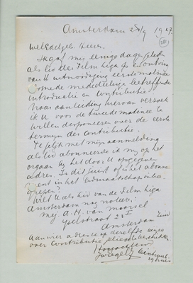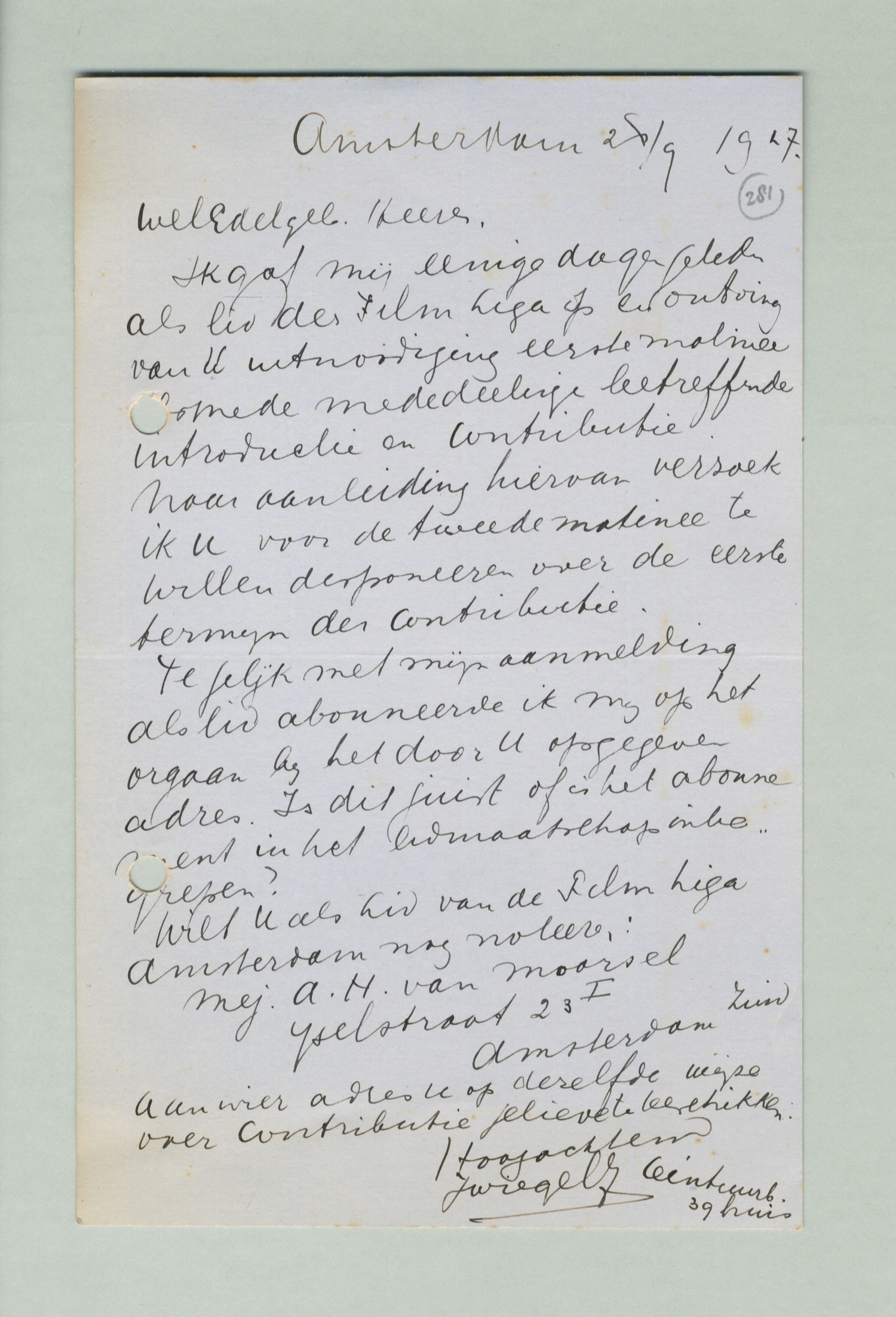 Ik gaf mij eenige dagen geleden als lid der Film Liga op en ontving van U uitnoodiging eerste matinee alsmede mededeelingen betreffende introductie en contributie. Naar aanleiding hiervan verzoek ik U voor de tweede matinee te willen disponeeren over de eerste termijn der contributie.