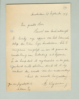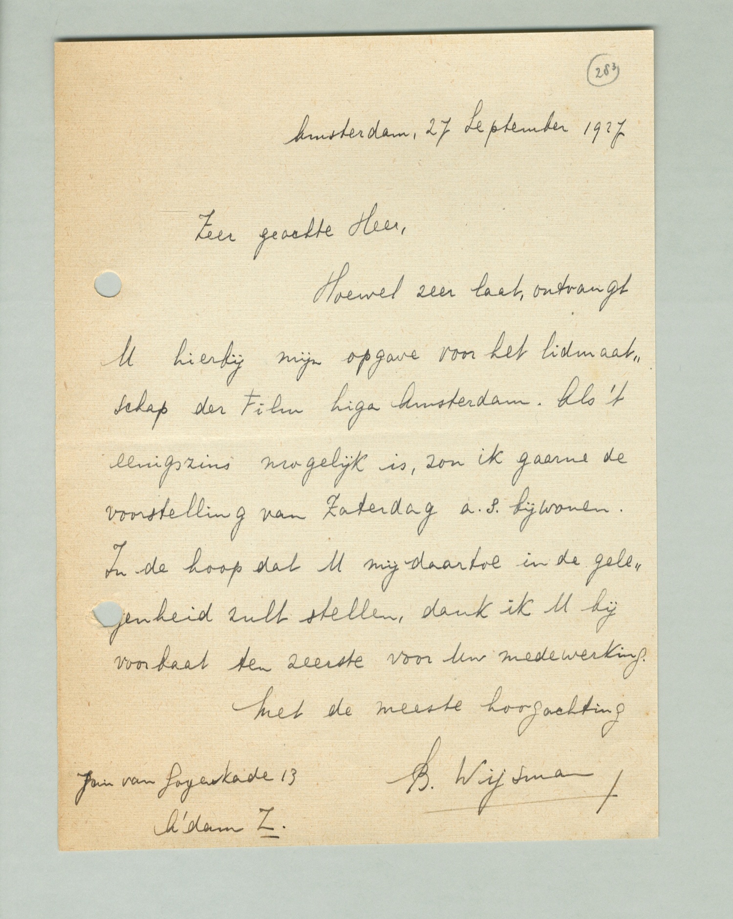 Hoewel zeer laat, ontvangt U hierbij mijn opgave voor het lidmaatschap der Film Liga Amsterdam. Als 't eenigszins mogelijk is, zou ik gaarne de voorstelling van Zaterdag a.s. bijwonen. In de hoop dat U mij daartoe in de gelegenheid zult stellen, dank ik U bij voorbaat ten zeerste voor Uw medewerking.