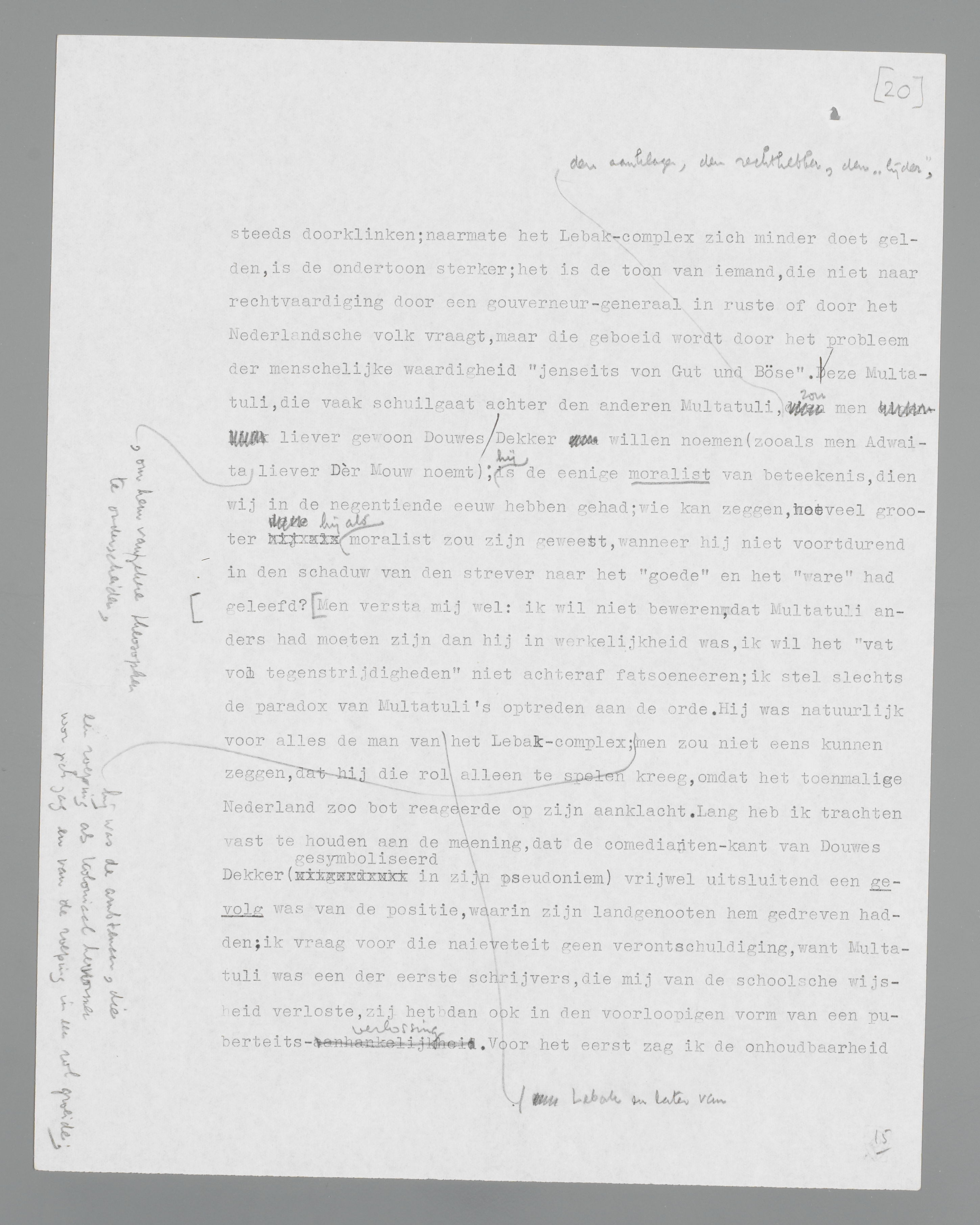 Door de Lebak-affaire is bij Douwes Dekker-Multatuli inderdaad zooiets ontstaan als een ‘complex’. Een complex: want hoewel ik er nog altijd niet aan twijfel, dat Multatuli in deze Nederlandsche Dreyfus-zaak het recht aan zijn zijde had, is het juist dit recht, dat zich bij Douwes Dekker tot een Multatuli-Lebak-complex verdicht. En toch is ook in Max Havelaar reeds een man aan het woord, die iets anders wil dan alleen aanklagen. Men dient niet te vergeten, dat de man, die Max Havelaar schreef, veertig jaar was, dat het boek hem van ambtenaar tot schrijver maakte, dat de martelaar Havelaar later veel meer een simplistisch symbool werd dan hij het in het boek is; en men hèèft stelselmatig vergeten, dat reeds in den Havelaar de paradox van Multatuli's persoonlijkheid compleet gegeven is. Iemand, die alleen wil beschuldigen, die den leugen wil bestrijden om de waarheid te doen triomfeeren, zal zich den tijd niet gunnen om een roman te schrijven als den Havelaar, waarin het wemelt van dialogen, die op zijwegen gaan, van problemen, die niet eens zijdelings met de ‘zaak’ te maken hebben. De inhoud van Sjaalman's pak, dien de dwerg van de N.R.C. voor een teeken van Multatuli's ‘oppervlakkigheid’ verslijt, is b.v. reeds een duidelijk praeludium op de Specialiteiten. In de latere werken van Multatuli blijft die ondertoon steeds doorklinken; naarmate het Lebak-complex zich minder doet gelden, is de ondertoon sterker; het is de toon van iemand, die niet naar rechtvaardigheid door een gouverneur-generaal in ruste of door het Nederlandsche volk vraagt, maar die geboeid wordt door het probleem der menschelijke waardigheid ‘jenseits von Gut und Böse’. Deze Multatuli, die vaak schuil gaat achter den anderen Multatuli, den aanklager, den rechthebber, den ‘lijder’, zou men liever gewoon Douwes Dekker willen noemen (zooals men Adwaita, om hem van zekere theosophen te onderscheiden, liever Dèr Mouw noemt); hij is de eenige moralist van beteekenis, dien wij in de negentiende eeuw hebben gehad; wie kan zeggen, hoeveel grooter hij