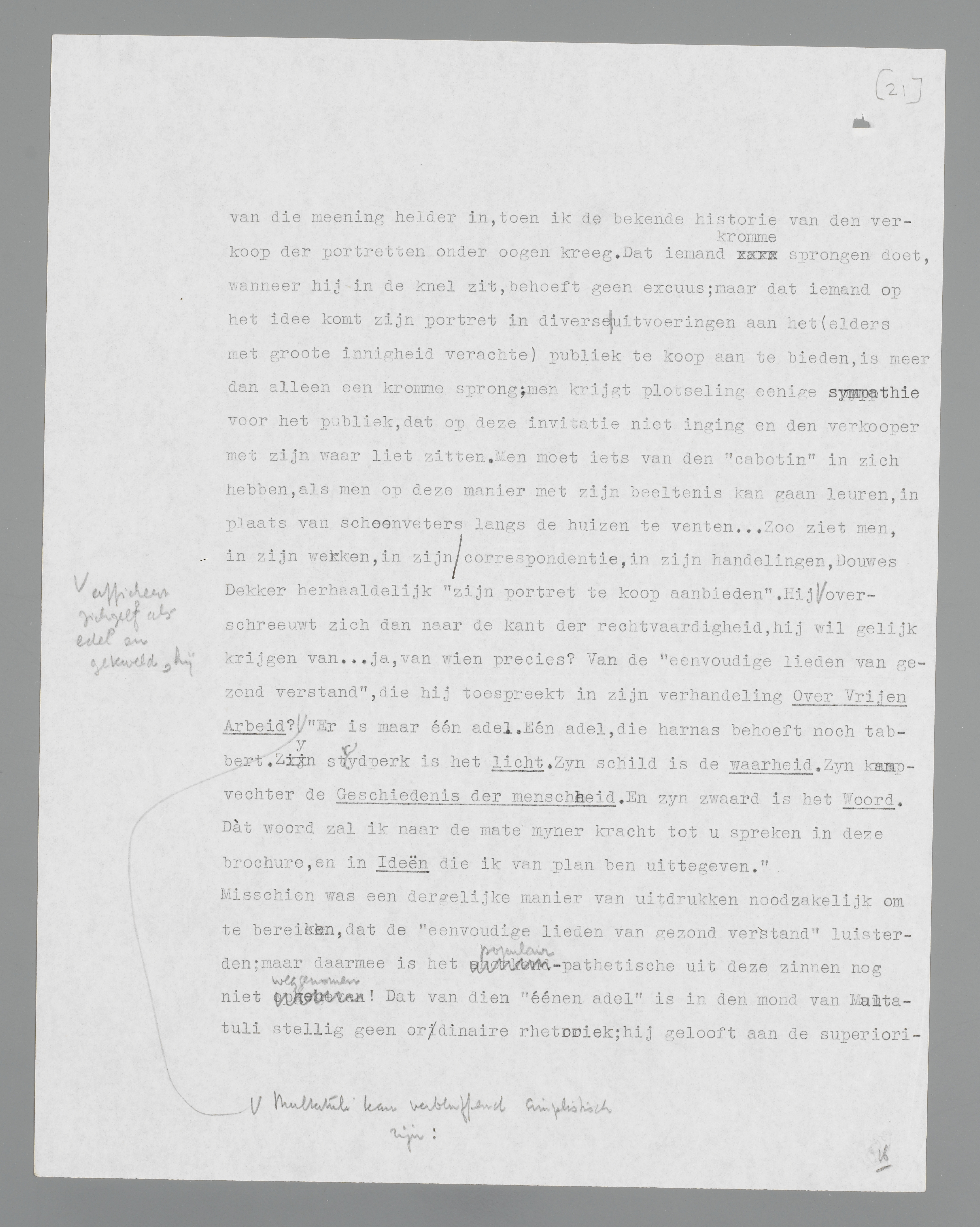 precies? Van de ‘eenvoudige lieden van gezond verstand’, die hij toespreekt in zijn verhandeling Over Vrijen Arbeid? Multatuli kan verbluffend simplistisch zijn: ‘Er is maar één adel. Eén adel, die harnas behoeft noch tabbert. Zyn strydperk is het licht. Zyn schild is de waarheid. Zyn kampvechter de Geschiedenis der menschheid. En zyn zwaard is het Woord. Dàt woord zal ik naar de mate myner kracht tot u spreken in deze brochure, en in Ideën die ik van plan ben uittegeven.’ Misschien was een dergelijke manier van uitdrukken noodzakelijk om te bereiken, dat de ‘eenvoudige lieden van gezond verstand’ luisterden; maar daarmee is het populair-pathetische uit deze zinnen nog niet weggenomen! Dat van dien ‘éénen adel’ is in den mond van Multatuli stellig geen ordinaire rhetoriek; hij gelooft aan de superioriteit van zijn maatstaf; hij heeft het ‘licht’, de ‘waarheid’ en het ‘woord’ noodig, om zijn temperament voor de lieden zonder zijn temperament te motiveeren... die echter tevens de ‘eenvoudige lieden van gezond verstand’ moeten zijn! Wil men den strijd van Multatuli consequent doordenken, dan zou men aan de renaissance van het eenvoudige verstand moeten gelooven, die hem voor oogen heeft gezweefd, die hem, in ‘diepste wezen’ veeleer een moralist ‘jenseits von Gut und Böse’, telkens verleidde tot houdingen, die bij een man van minder talent (b.v. bij zijn epigonen onder de vrijdenkers) alleen maar rhetorisch zouden kunnen werken. Wie met het ‘licht’ en de ‘waarheid’ opereert, opereert met de fictie van een wereld, waarin men licht en waarheid kan afzonderen van duisternis en onwaarheid, werkt ook met een abstract begrip van gerechtigheid, dat in zonderlinge tegenspraak is met de realiteit van de macht. Niemand heeft meer dan Dekker zelf aan den lijve gevoeld, wat het wil zeggen, macht uit te oefenen; de koloniseerende mogendheid tegenover de gekoloniseerde inboorlingen, waarvan hij de vertegenwoordiger is geweest, stelt onverbiddelijk het probleem van het gewordene, dat niet meer ongedaan is te maken, zelfs al wordt aan alle assistent-residenten van alle Lebaks, die er in Indië zijn, volledig recht gedaan. Zelfs de losmaking van