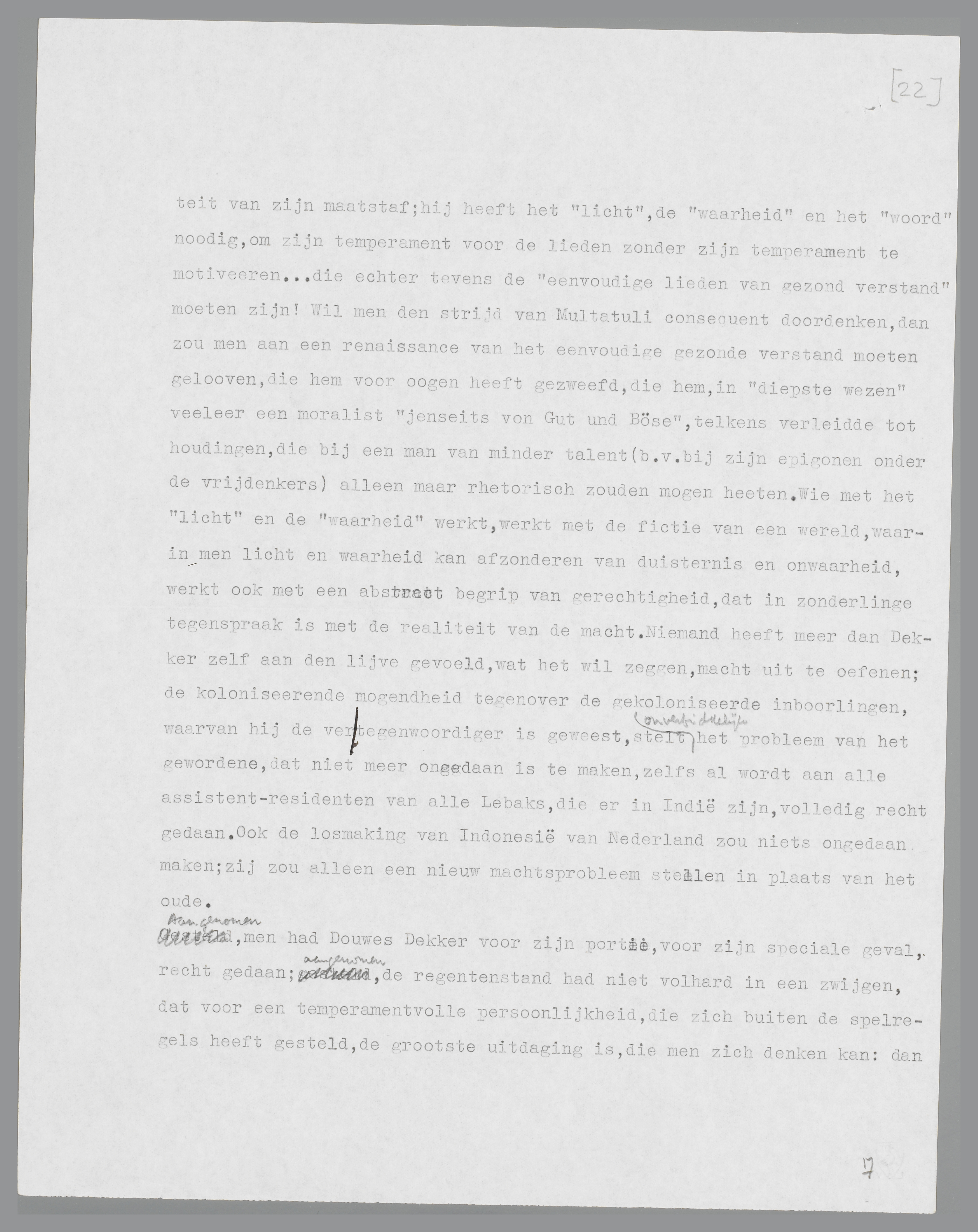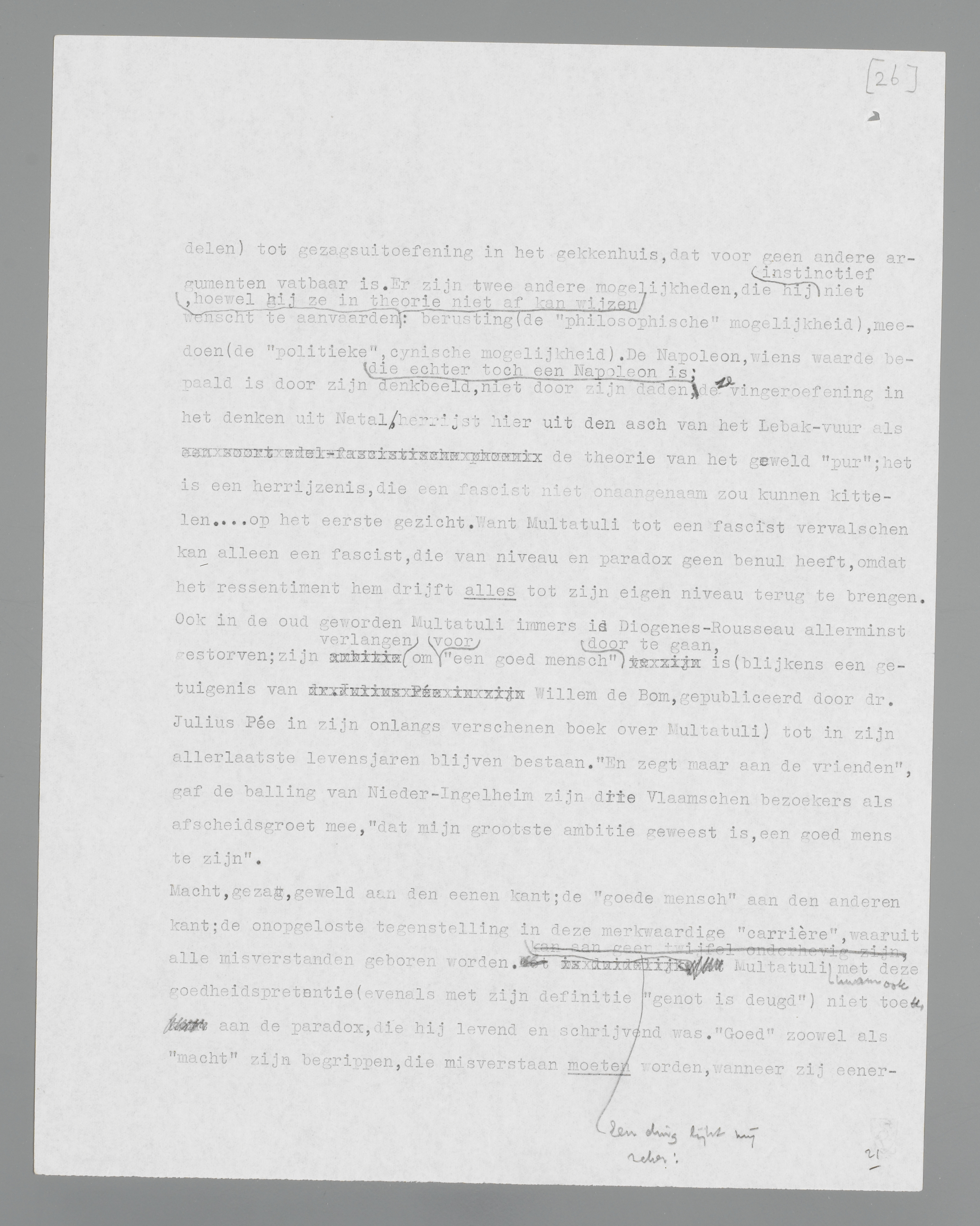 Tegen het einde van zijn leven schijnt Multatuli een desperado van het geweld. Het is duidelijk, dat hij het niet wordt uit overdreven enthousiasme voor de geweldpleging als zoodanig; het is duidelijk, dat hij teleurgesteld is in de macht van het woord, en nu wil overgaan (maar zonder middelen) tot gezagsuitoefening in het gekkenhuis, dat voor geen andere argumenten vatbaar is. Er zijn twee andere mogelijkheden, die hij instinctief niet wenscht te aanvaarden, hoewel hij ze in theorie niet af kan wijzen: berusting (de ‘philosophische’ mogelijkheid), meedoen (de ‘politieke’, cynische mogelijkheid). De Napoleon, wiens waarde bepaald is door zijn denkbeeld, niet