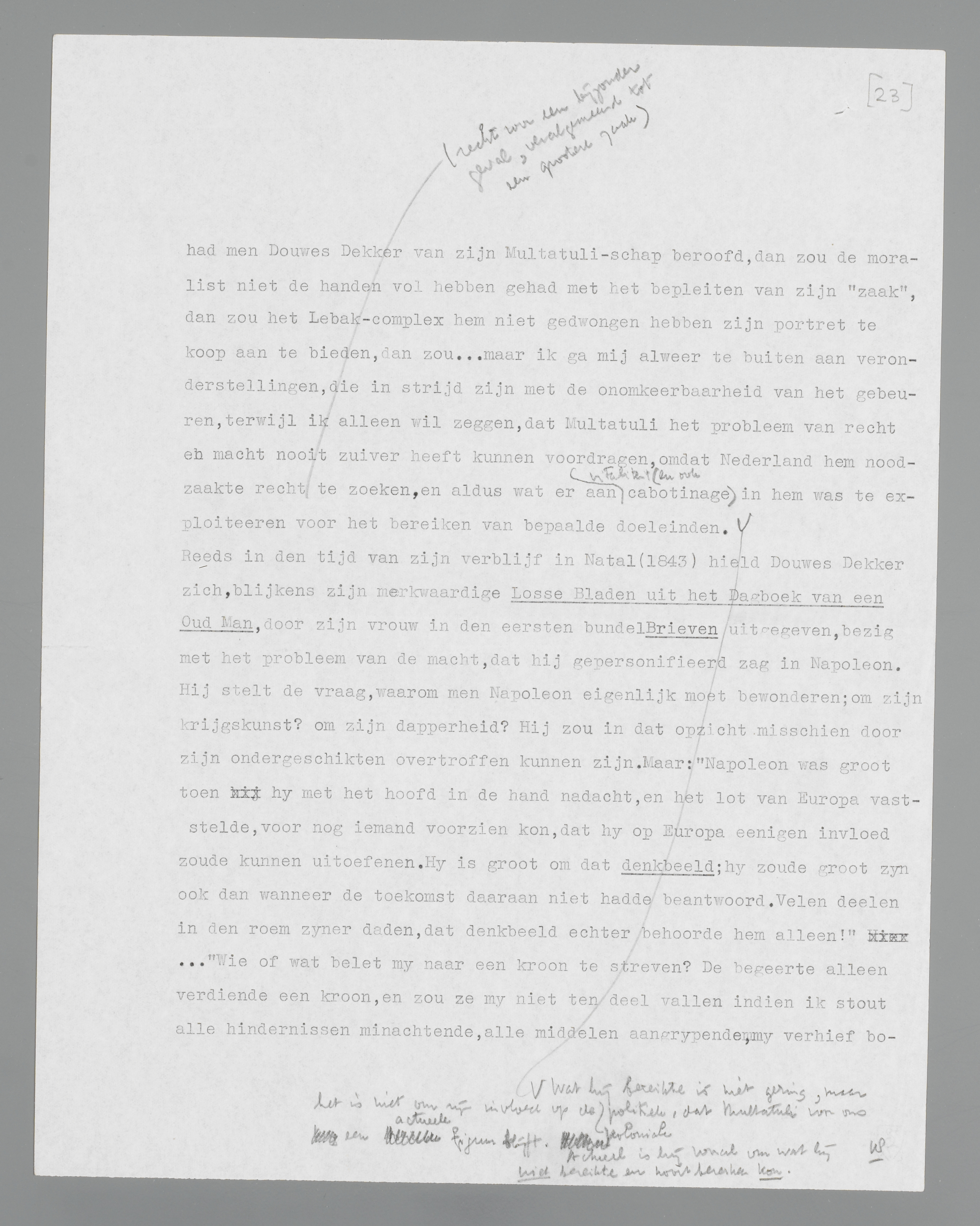 Reeds in den tijd van zijn verblijf in Natal (1843) hield Douwes Dekker zich, blijkens zijn merkwaardige Losse Bladen uit het Dagboek van een Oud Man, door zijn vrouw in den eersten bundel Brieven uitgegeven, bezig met het probleem van de macht, die hij gepersonifieerd zag in Napoleon. Hij stelt de vraag, waarom men Napoleon eigenlijk moet bewonderen; om zijn krijgskunst? om zijn dapperheid? Hij zou in dat opzicht misschien door zijn ondergeschikten overtroffen kunnen zijn. Maar: ‘Napoleon was groot toen hy met het hoofd in de hand nadacht, en het lot van Europa vaststelde, voor nog iemand voorzien kon, dat hy op Europa eenigen invloed zoude kunnen uitoefenen. Hy is groot om dat denkbeeld; hy zoude groot zyn
