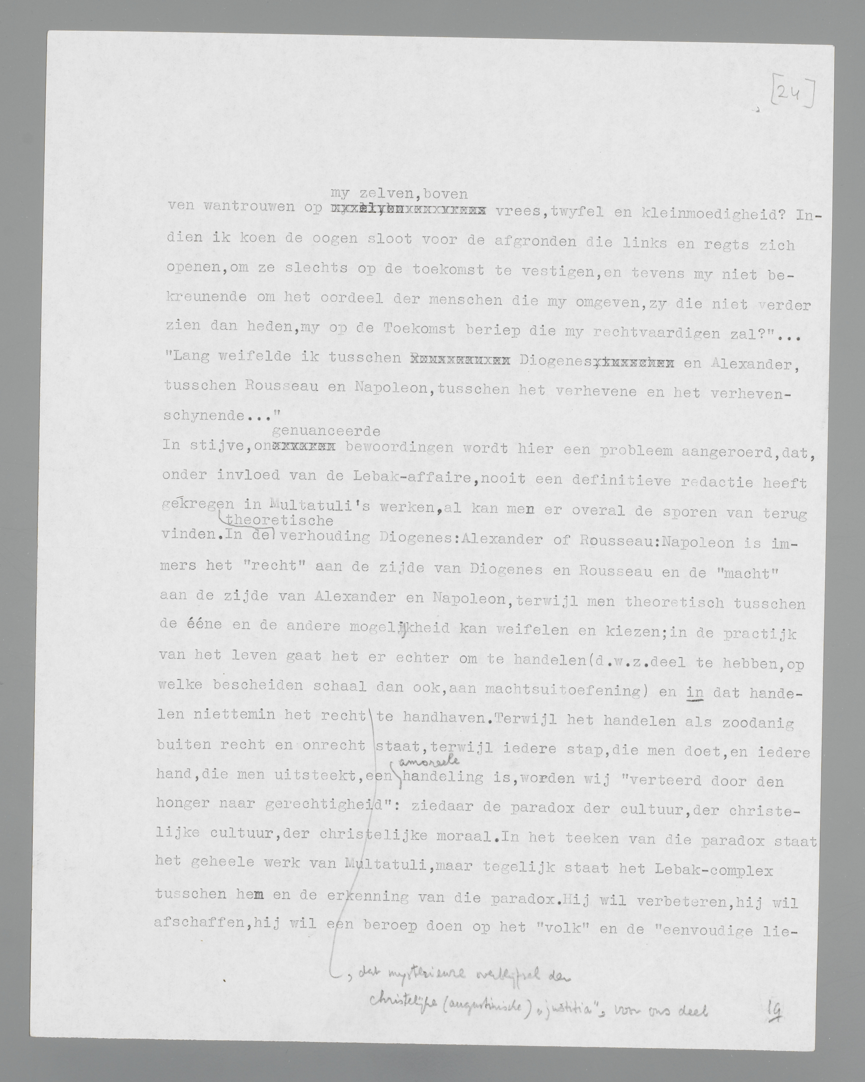 In stijve, ongenuanceerde bewoordingen wordt hier een probleem aangeroerd, dat, onder invloed van de Lebak-affaire, nooit een definitieve redactie heeft gekregen in Multatuli's werken, al kan men er overal de sporen van terug vinden. In de theoretische verhouding Diogenes: Alexander of Rousseau: Napoleon is immers het ‘recht’ aan de zijde van Diogenes en Rousseau en de ‘macht’ aan de zijde van Alexander en Napoleon, terwijl men theoretisch tusschen de ééne en de andere mogelijkheid kan weifelen en kiezen; in de practijk van het leven gaat het er echter om te handelen (d.w.z. deel te hebben, op welke bescheiden schaal dan ook, aan machtsuitoefening) en in dat handelen niettemin het recht, dat mysterieuze overblijfsel der christelijke (augustinische) ‘justitia’, voor ons deel te handhaven. Terwijl het handelen als zoodanig buiten recht en onrecht staat, terwijl iedere stap, die men doet, en iedere hand, die men uitsteekt, een amoreele handeling is, worden wij ‘verteerd door den honger naar gerechtigheid’: ziedaar de paradox der cultuur, der christelijke cultuur, der christelijke moraal. In het teeken van die paradox staat het geheele werk van Multatuli, maar tegelijk staat het Lebak-complex tusschen hem en de erkenning van die paradox. Hij wil verbeteren, hij