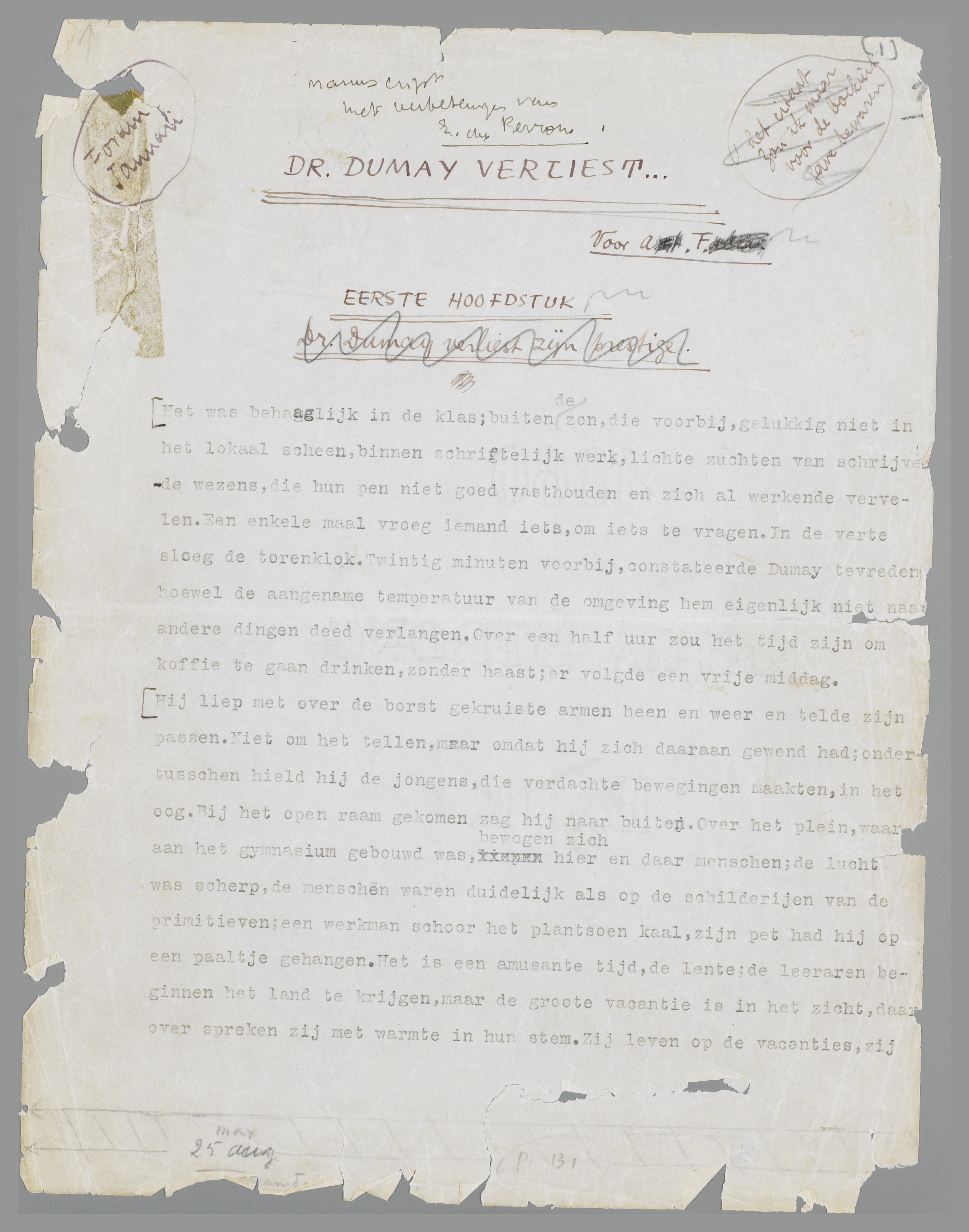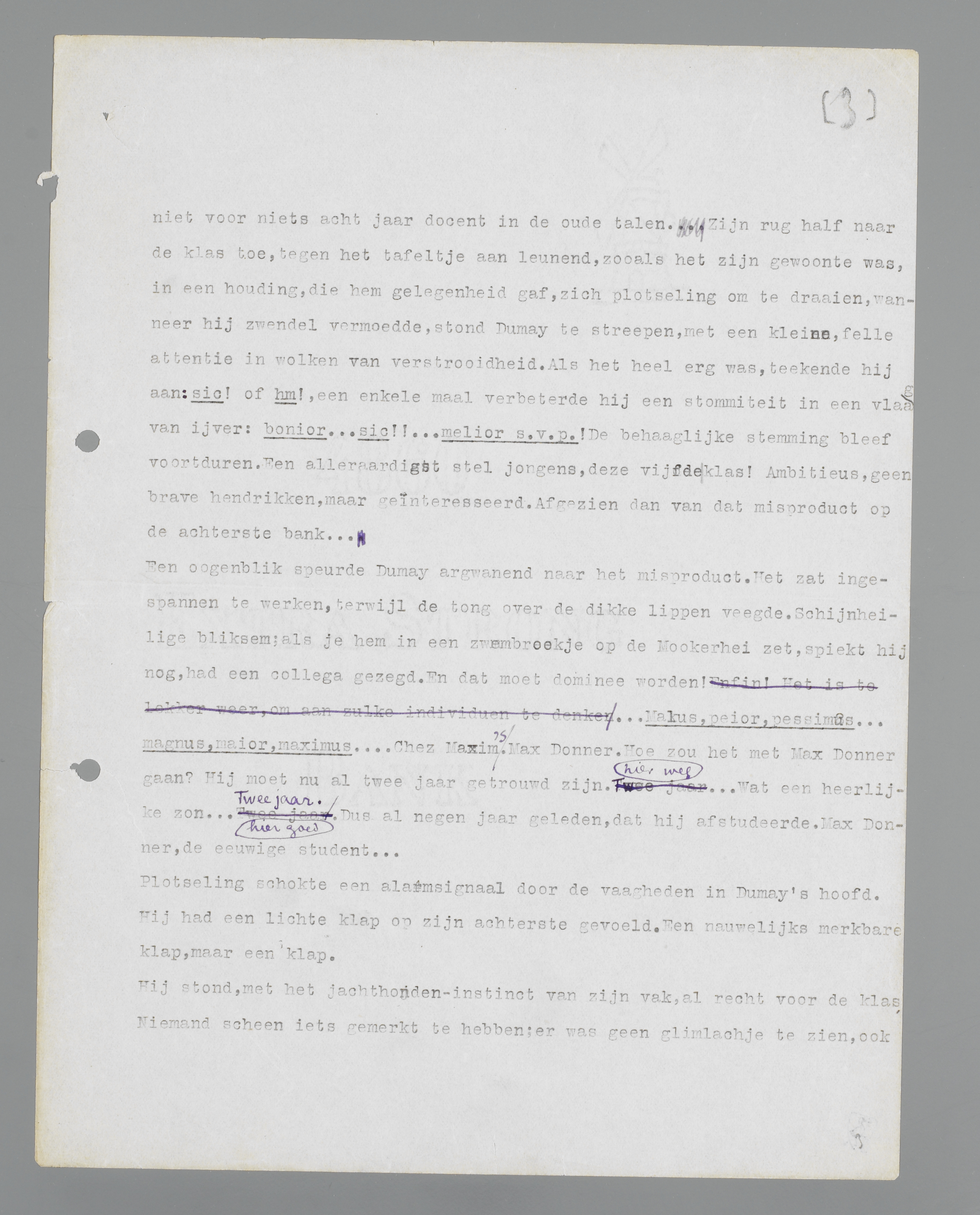 Een oogenblik speurde Dumay argwanend naar het misproduct. Het zat ingespannen te werken, terwijl de tong over de dikke lippen veegde. Schijnheilige bliksem; als je hem in een zwembroekje op de Mookerhei zet, spiekt hij nog, had een collega gezegd. En dat moet dominee worden!... Malus, peior, pessimus... magnus, maior, maximus... Chez Maxim's. Max Donner. Hoe zou het met Max Donner gaan? Hij moet nu al twee jaar getrouwd zijn... Wat een heerlijke zon... Twee jaar. Dus al negen jaar geleden, dat hij afstudeerde. Max Donner, de eeuwige student...
