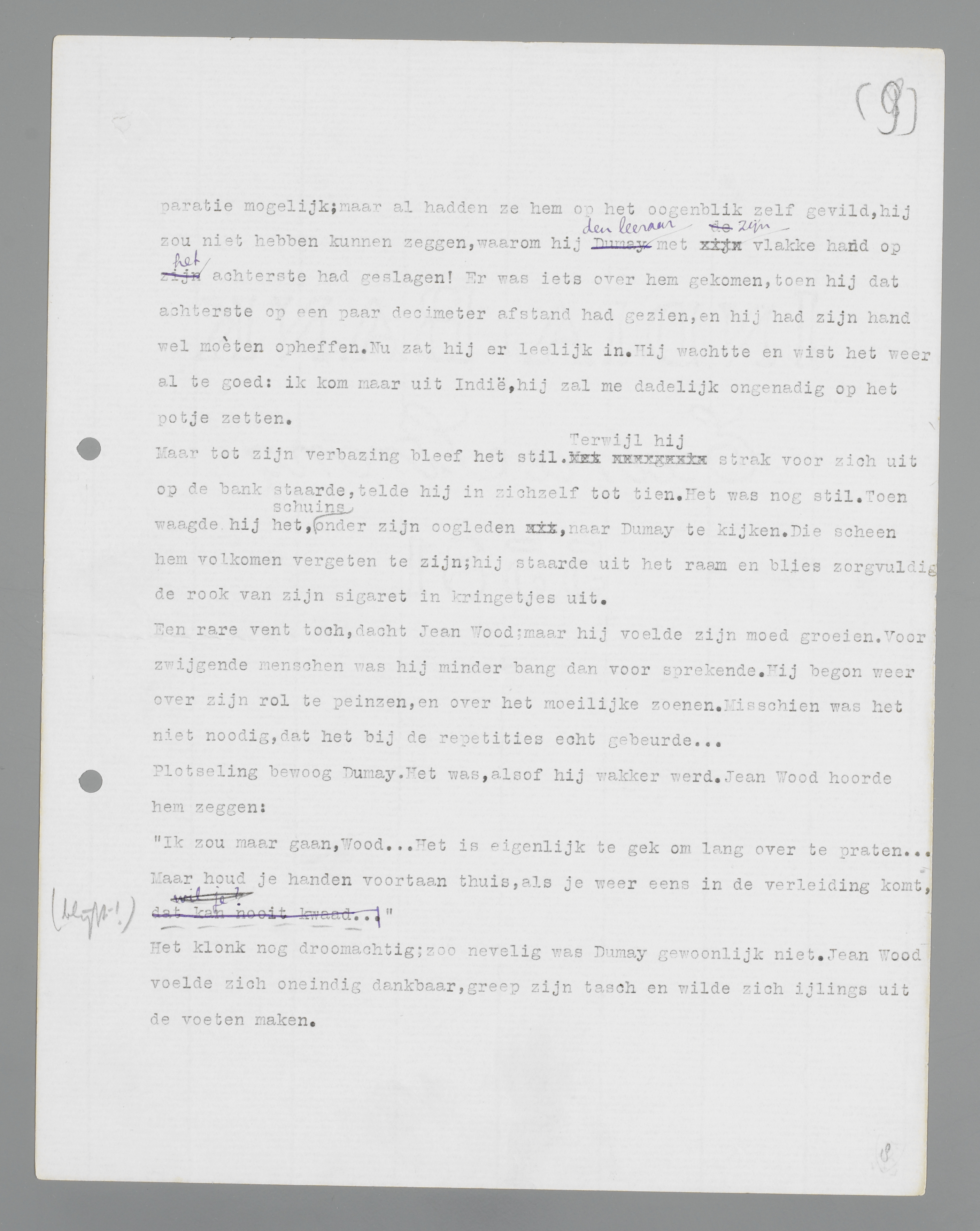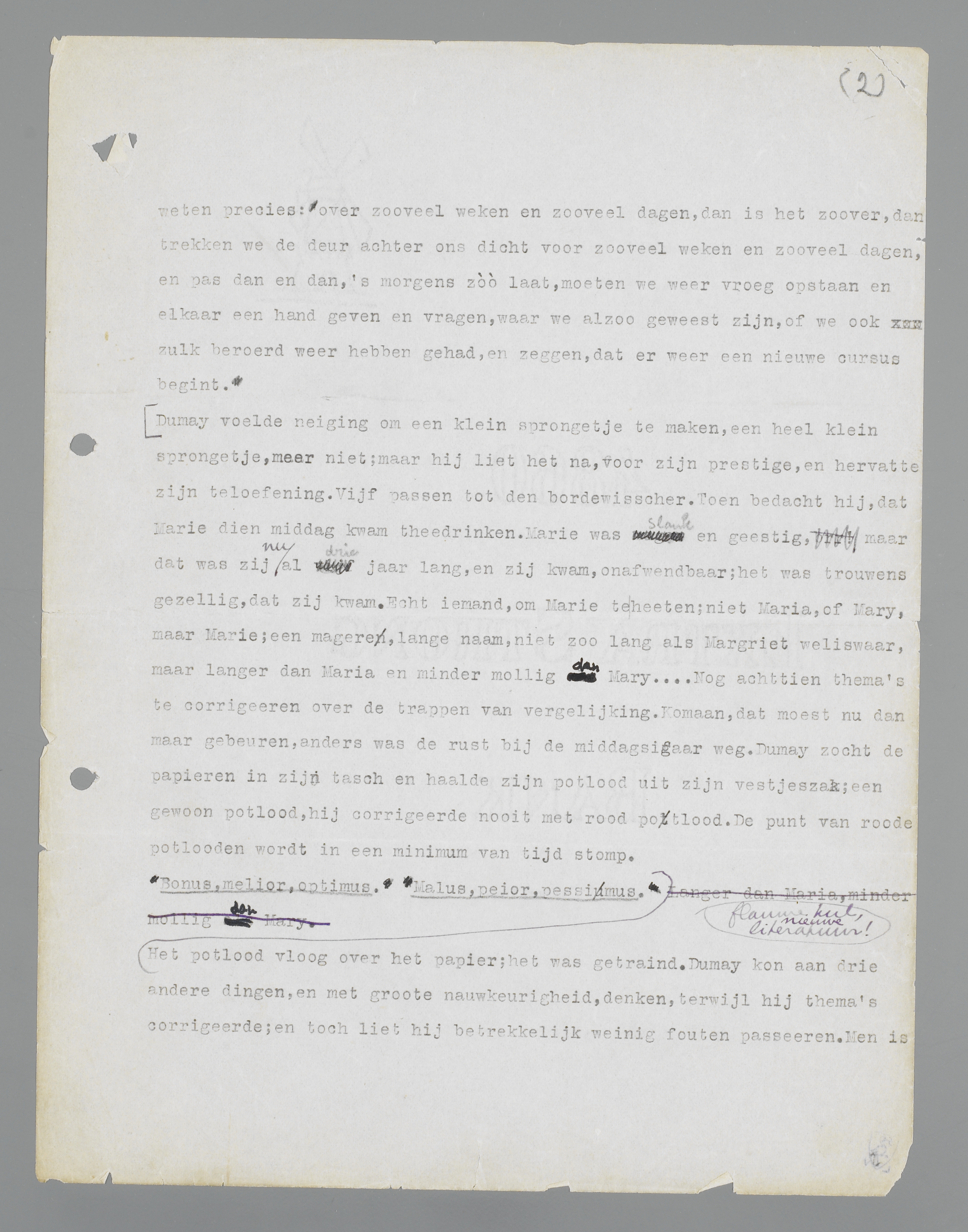Dumay voelde neiging om een klein sprongetje te maken, een heel klein sprongetje, meer niet; maar hij liet het na, voor zijn prestige, en hervatte zijn teloefening. Vijf passen tot den bordewisscher. Toen bedacht hij, dat Marie dien middag kwam theedrinken. Marie was slank en geestig, maar dat was zij nu al drie jaar lang, en zij kwam, onafwendbaar; het was trouwens gezellig, dat zij kwam. Echt iemand, om Marie te heeten; niet Maria, of Mary, maar Marie; een magere, lange naam, niet zoo lang als Margriet weliswaar, maar langer dan Maria en minder mollig dan Mary.... Nog achttien thema's te corrigeeren over de trappen van vergelijking. Komaan, dat moest nu dan maar gebeuren, anders was de rust bij de middagsigaar weg. Dumay zocht de papieren in zijn tasch en haalde zijn potlood uit zijn vestjeszak; een gewoon potlood, hij corrigeerde nooit met rood potlood. De punt van roode potlooden wordt in een minimum van tijd stomp.