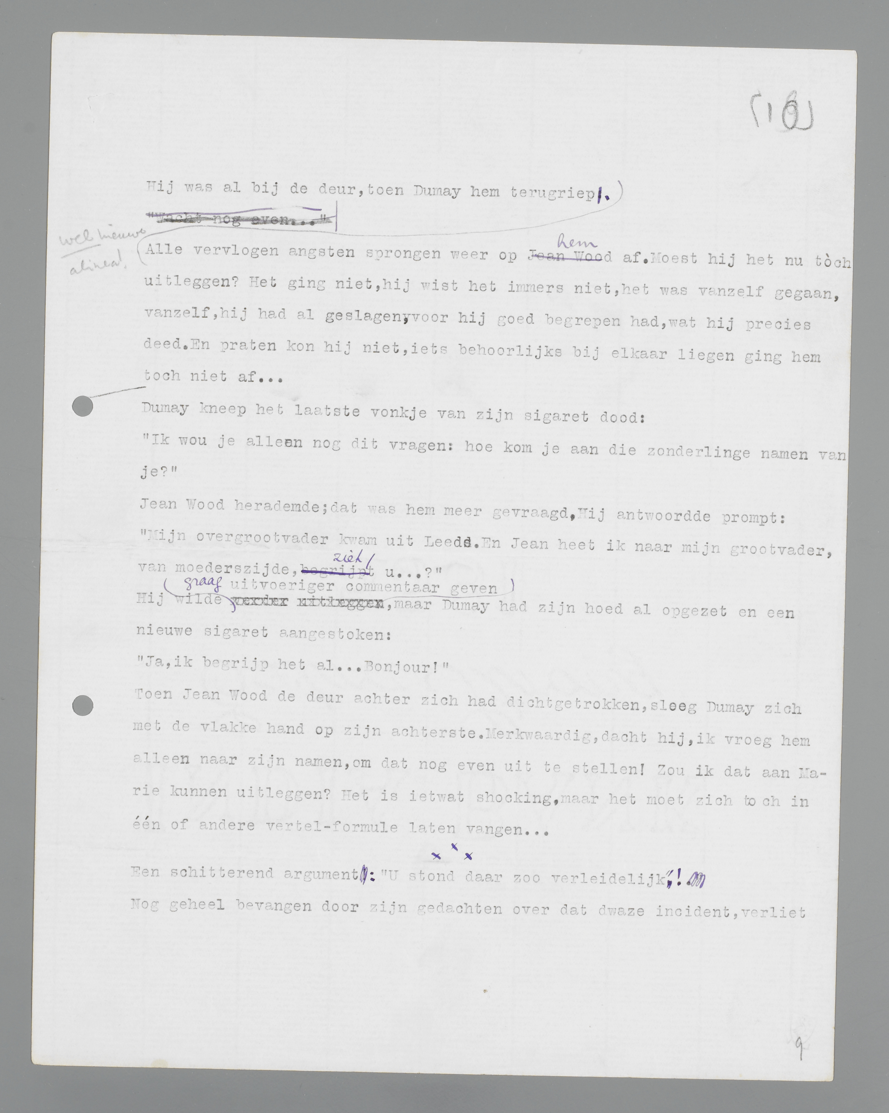 ken, sloeg Dumay zich met de vlakke hand op zijn achterste. Merkwaardig, dacht hij, ik vroeg hem alleen naar zijn namen, om dat nog even uit te stellen! Zou ik dat aan Marie kunnen uitleggen? Het is ietwat shocking, maar het moet zich toch in één of andere vertel-formule laten vangen...
