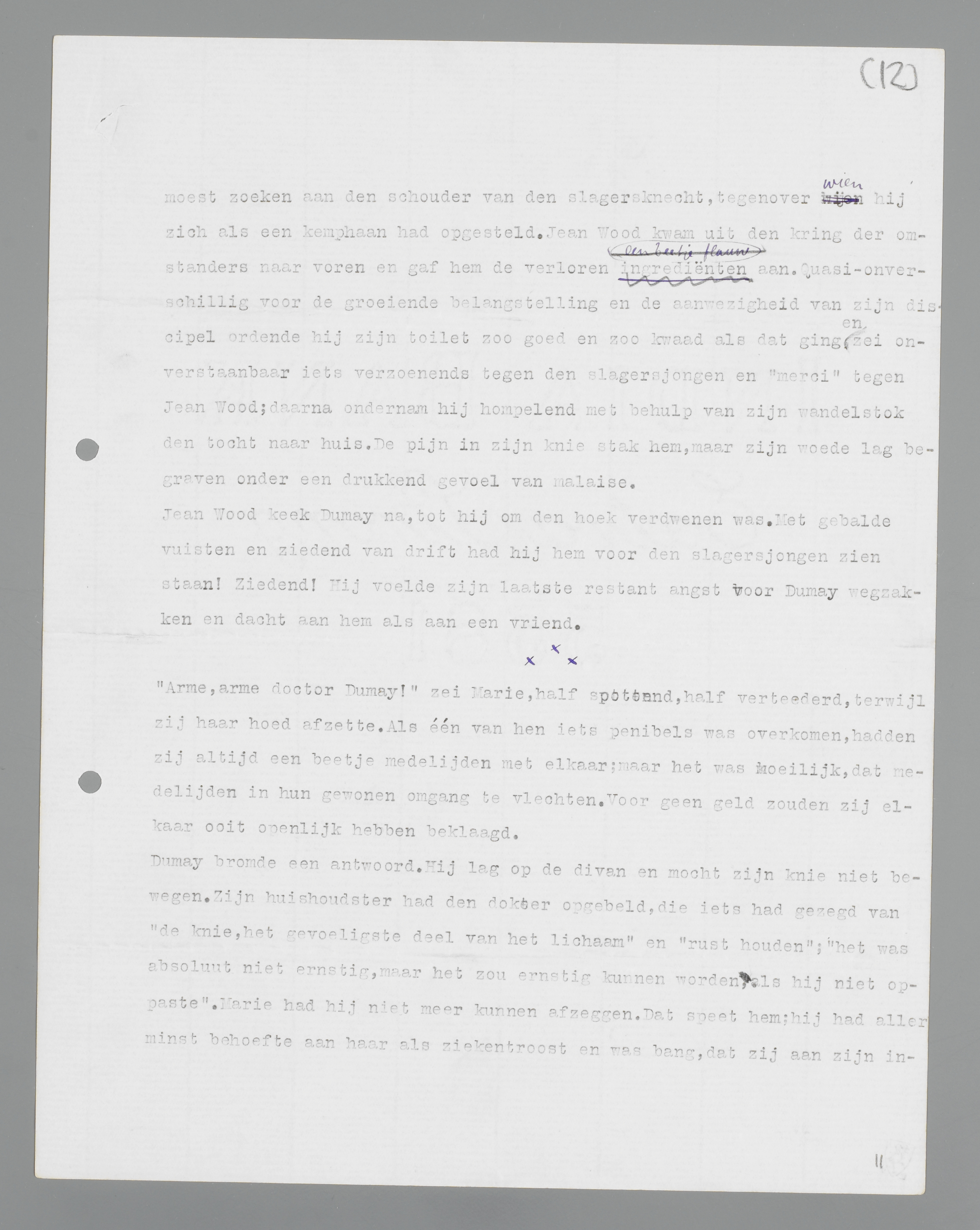 Dumay bromde een antwoord. Hij lag op de divan en mocht zijn knie niet bewegen. Zijn huishoudster had den dokter opgebeld, die iets had gezegd van ‘de knie, het gevoeligste deel van het lichaam’ en ‘rust houden’; ‘het was absoluut niet ernstig, maar het zou ernstig kunnen worden, als hij niet oppaste.’ Marie had hij niet meer kunnen afzeggen. Dat speet hem; hij had allerminst behoefte aan haar als ziekentroost en was bang, dat zij aan zijn invaliditeit het recht zou ontleenen om anders te zijn dan anders; een zieke is nu eenmaal geen gelijkwaardige tegenpartij.