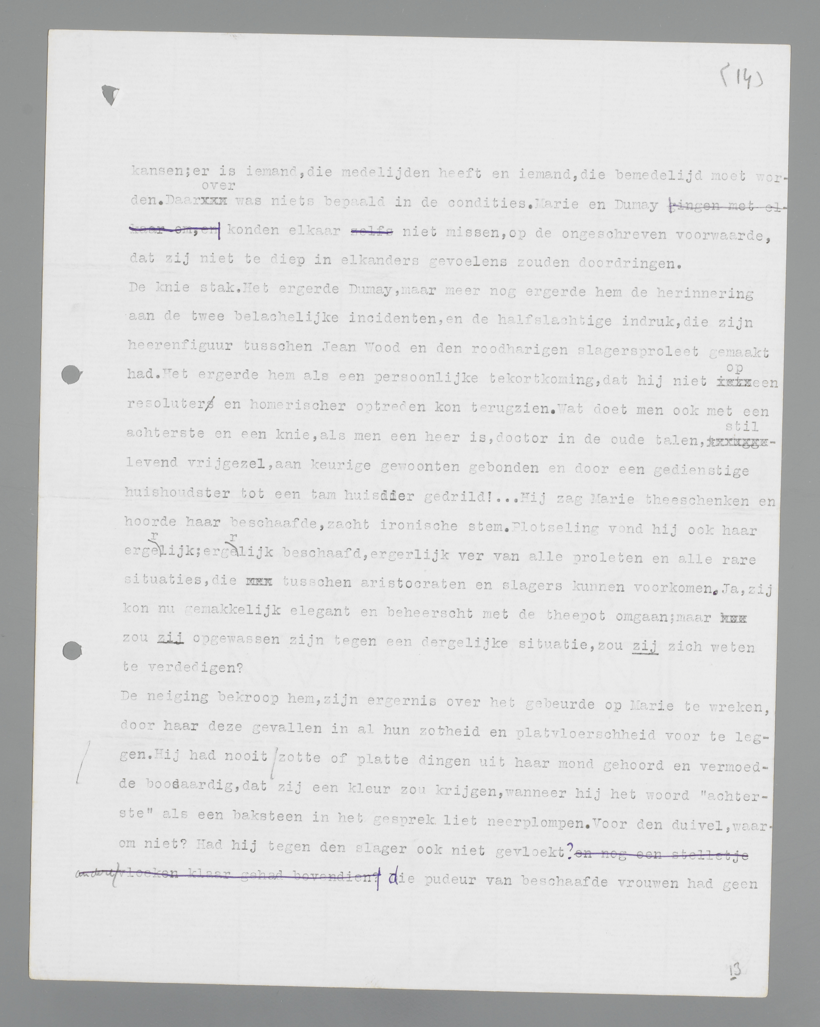 De neiging bekroop hem, zijn ergernis over het gebeurde op Marie te wreken, door haar deze gevallen in al hun zotheid en platvloerschheid voor te leggen. Hij had nooit zotte of platte dingen uit haar mond gehoord en vermoedde boosaardig, dat zij een kleur zou krijgen, wanneer hij het woord ‘achterste’ als een baksteen in het gesprek liet neerplompen. Voor den duivel, waarom niet? Had hij tegen den slager ook niet gevloekt? die pudeur van beschaafde vrouwen had geen enkelen zin! Door hun schijn-aristocratie handhaafden zij zich maar op een peil, waartoe zij niet het geringste recht hadden! En hij begon: