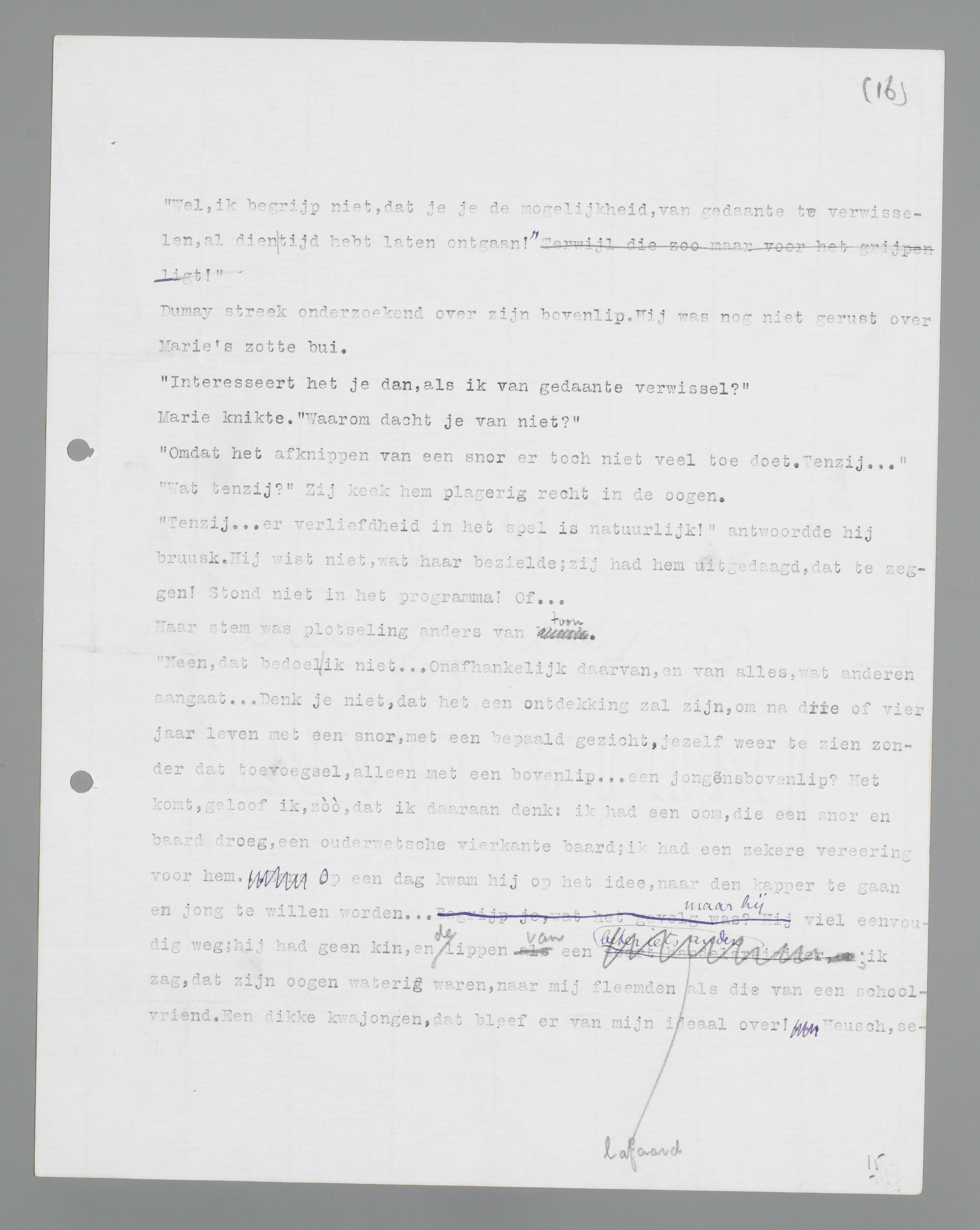 ‘Victor, luister eens. Misschien vind je me erg kinderachtig; maar ik waag het erop. Er zijn altijd heele grachten van afstand tusschen ons; wij tweeën hebben nooit... iets geks gedaan, iets zoomaar gedaan. Dat zal ook wel zoo moeten, alleen... laat je snor eens afknippen! Voor mijn pleizier! Ik zou je graag zien zonder dat ding, ik geloof, dat het mijn meening over je weer totaal anders zou kleuren, dat het je zelf anders zou maken, dat je... hoe zal ik het zeggen... uit je gewone vel zou kruipen en... een zot, nieuw iemand zou zijn, iemand, die ik nog niet ken...’