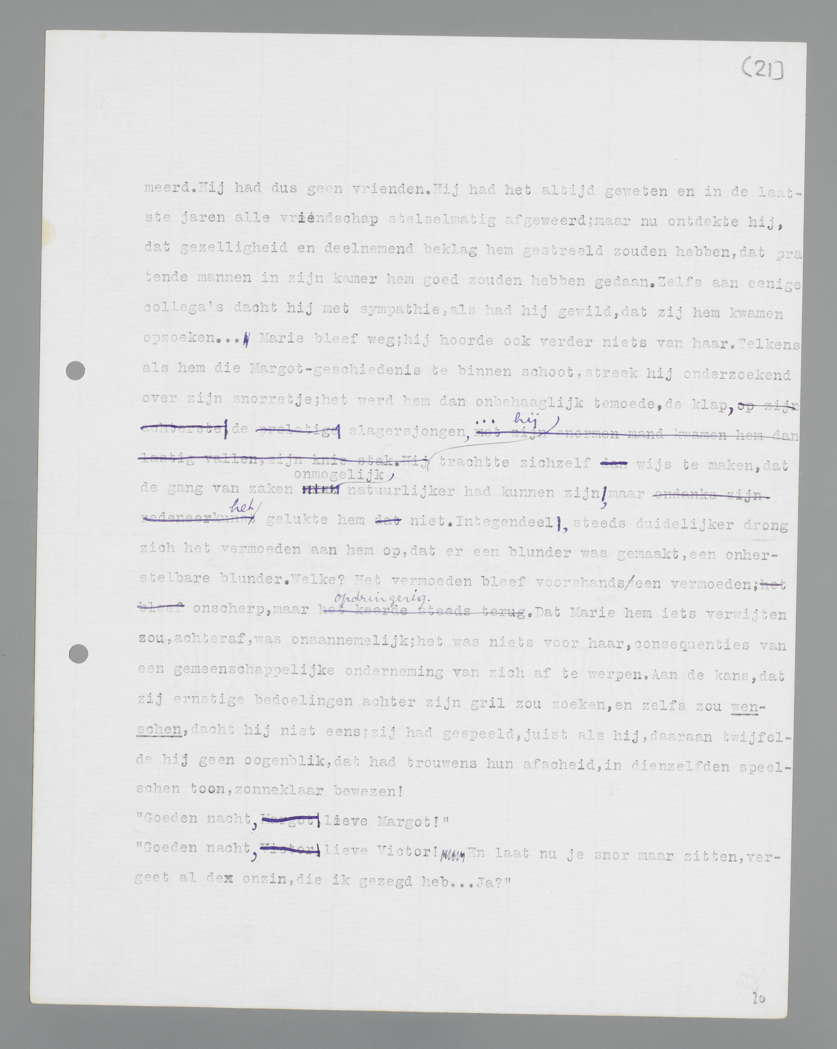 ontdekte hij, dat gezelligheid en deelnemend beklag hem gestreeld zouden hebben, dat pratende mannen in zijn kamer hem goed zouden hebben gedaan. Zelfs aan eenige collega's dacht hij met sympathie, als had hij gewild, dat zij hem kwamen opzoeken... Marie bleef weg; hij hoorde ook verder niets van haar. Telkens als hem die Margot-geschiedenis te binnen schoot, streek hij onderzoekend over zijn snorretje; het werd hem dan onbehaaglijk temoede; de klap, de slagersjongen,... hij trachtte zichzelf wijs te maken, dat de gang van zaken onmogelijk natuurlijker had kunnen zijn, maar het gelukte hem niet. Integendeel, steeds duidelijker drong zich het vermoeden aan hem op, dat er een blunder was gemaakt, een onherstelbare blunder. Welke? Het vermoeden bleef voorshands een vermoeden; onscherp, maar opdringerig. Dat Marie hem iets verwijten zou, achteraf, was onaannemelijk; het was niets voor haar, consequenties van een gemeenschappelijke onderneming van zich af te werpen. Aan de kans, dat zij ernstige bedoelingen achter zijn gril zou zoeken, en zelfs zou wenschen, dacht hij niet eens; zij had gespeeld, juist als hij, daaraan twijfelde hij geen oogenblik, dat had trouwens hun afscheid, in dienzelfden speelschen toon, zonneklaar bewezen!