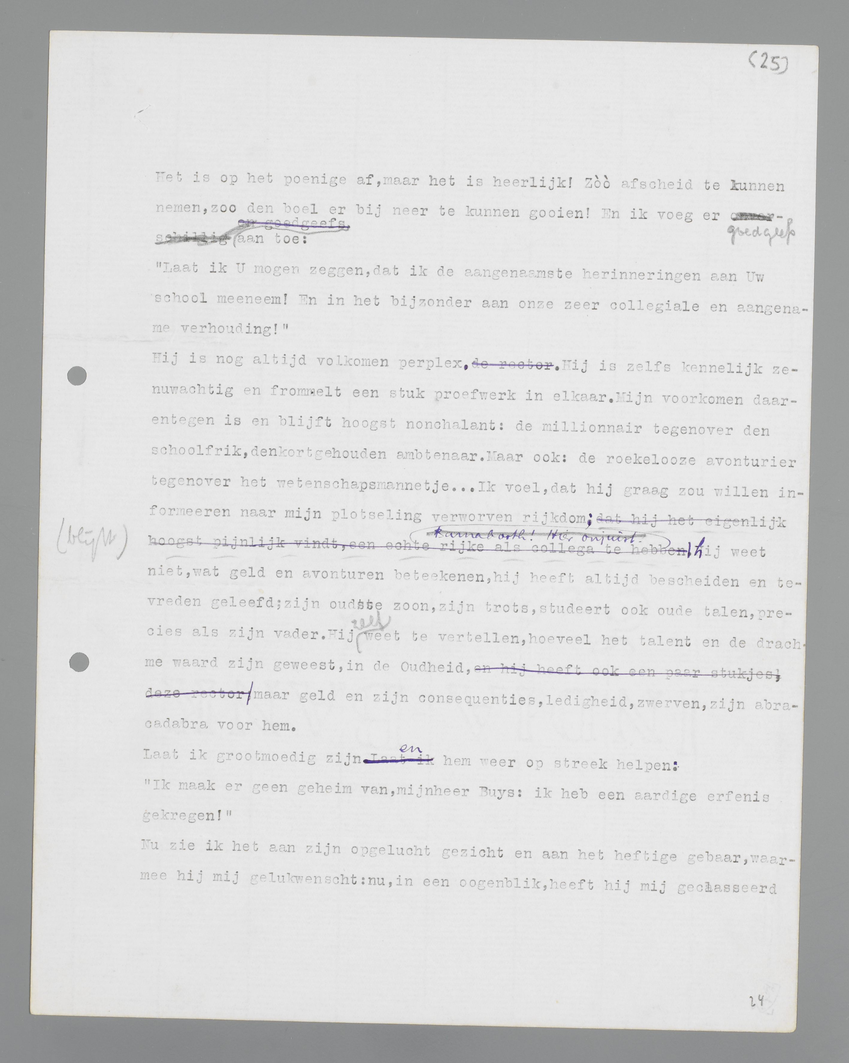 Nu zie ik het aan zijn opgelucht gezicht en aan het heftige gebaar, waarmee hij mij gelukwenscht: nu, in een oogenblik, heeft hij mij geclasseerd volgens zijn beschaafde armeluismoraal, als een geluksvogel, een onverantwoordelijken boffer, een metgezel van bankiers, fabrikanten en andere ongestudeerde rijkaards. Misschien is hij nog even verwonderd, omdat ik zoo ongegêneerd met mijn confidentie voor den dag ben gekomen; over een groote erfenis spreekt men toch eigenlijk niet. Hij is ook een beetje jaloersch, maar niet erg; daarvoor is zijn academische trots immers weer goed; liever arm mèt een academischen graad, dan rijk zonder... en zelfs rijk mèt. Kortom liever dr. Buys, arm rector, dan dr. Dumay, leeraar met een onverantwoordelijk geluk! Maior sum quam cui possit Fortuna nocere!