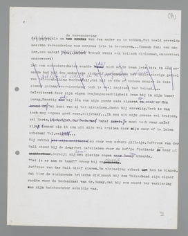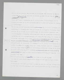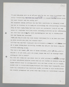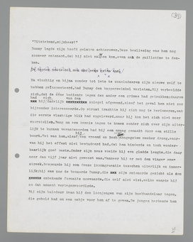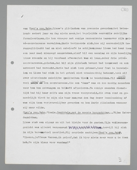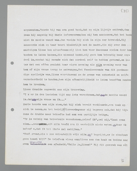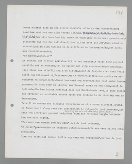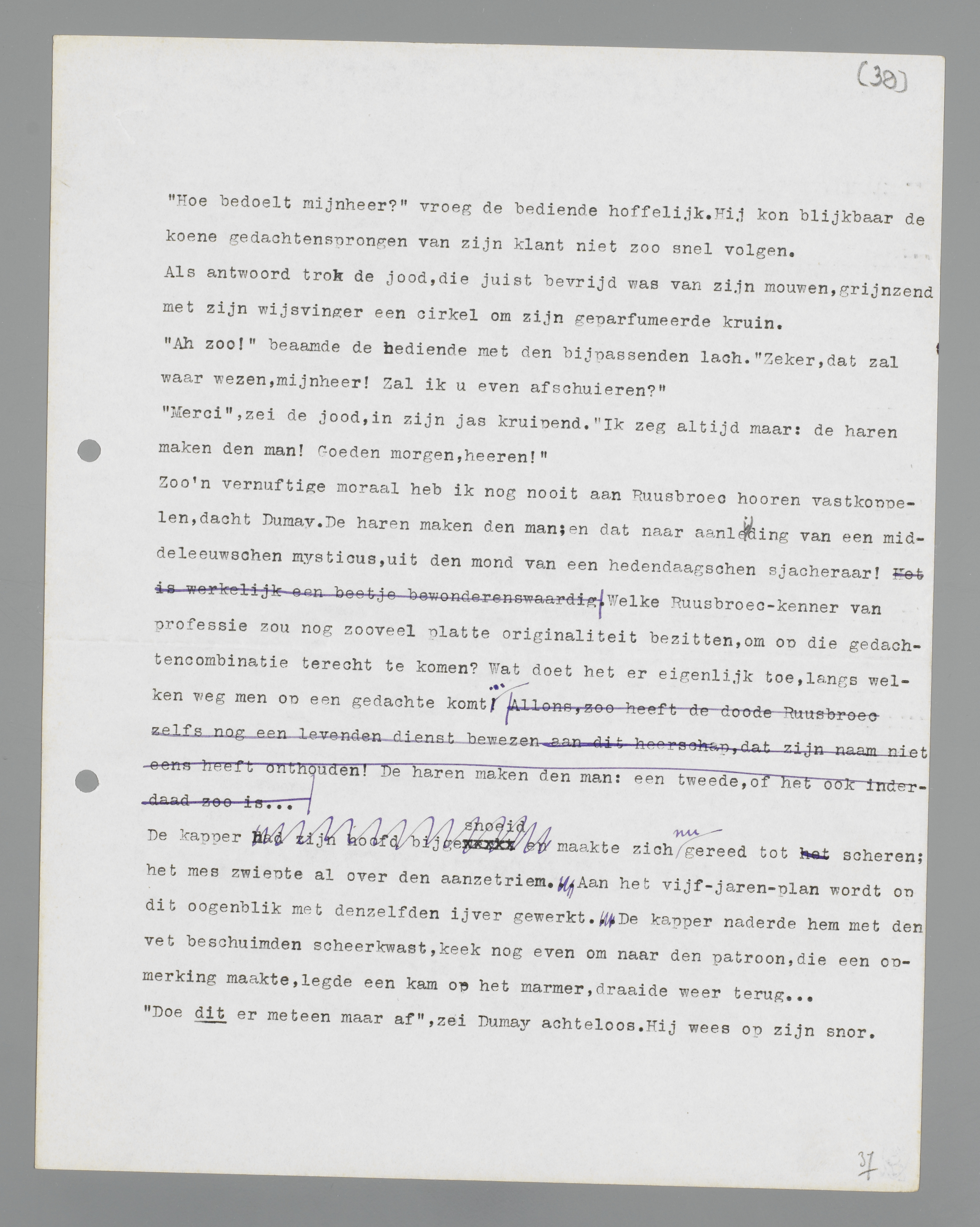 De spiegel gaf getrouw weer, hoe hij in het onnoozele witte hemd gesjord geduldig zat te wachten, tot de kapper met zijn voorbereidende manipulaties klaar zou zijn. Hij zag zich zitten, alsof de Sovjets niet druk bezig waren een kolossaal vijf-jaren-plan te verwerkelijken, zoo goedig en afwachtend en onpartijdig. Naast hem werd een vervaarlijke jood onder handen genomen, die druk over de ligging van Brussel sprak op een toon, alsof de bediende, die hem knipte, geregeld door het Soniënbosch reed. De baas schoor een officier en pruttelde achter diens rug telkens in de richting van de damessalon.