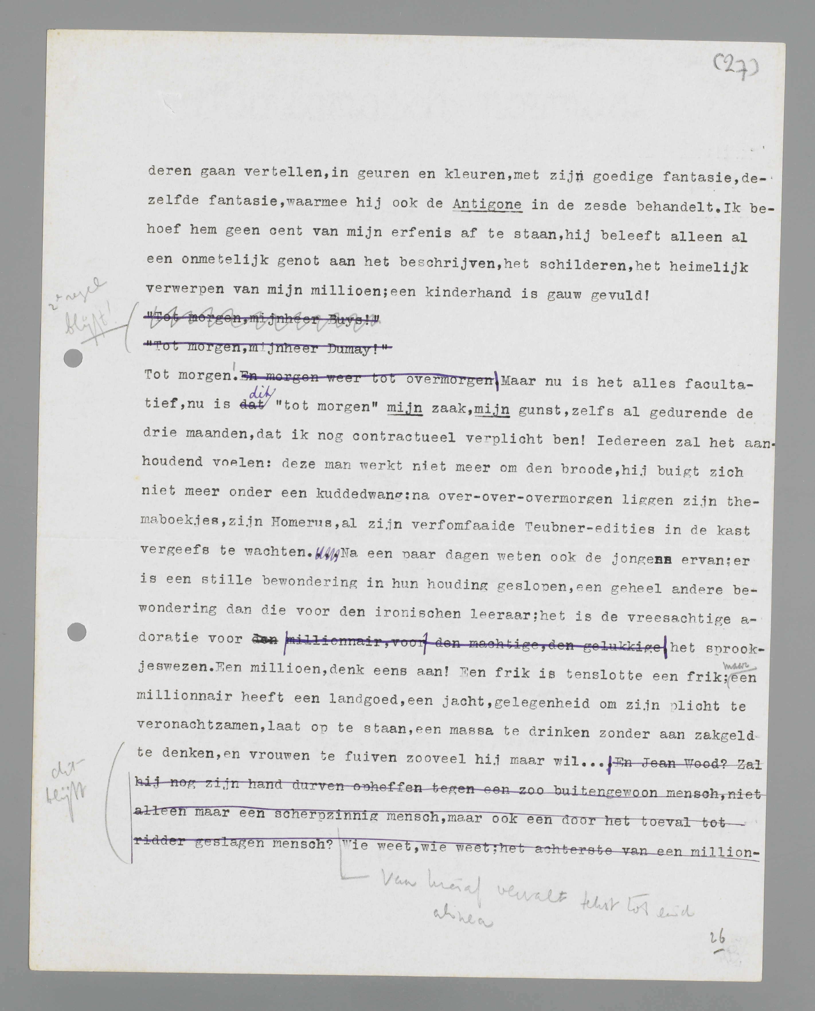 Tot morgen! Maar nu is het alles facultatief, nu is dit “tot morgen” mijn zaak, mijn gunst, zelfs al gedurende de drie maanden, dat ik nog contractueel verplicht ben! Iedereen zal het aanhoudend voelen: deze man werkt niet meer om den broode, hij buigt zich niet meer onder een kuddedwang: na over-over-morgen liggen zijn themaboekjes, zijn Homerus, al zijn verfomfaaide Teubner-edities in de kast vergeefs te wachten. Na een paar dagen weten ook de jongens ervan; er is een stille bewondering in hun houding geslopen, een geheel andere bewondering dan die voor den ironischen leeraar; het is de vreesachtige adoratie voor het sprookjeswezen. Een millioen, denk eens aan! Een frik is tenslotte een frik; maar een millionnair heeft een landgoed, een jacht, gelegenheid om zijn plicht te veronachtzamen, laat op te staan, een massa te drinken zonder aan zakgeld te denken, en vrouwen te fuiven zooveel hij maar wil... En Jean Wood? Zal hij nog zijn hand durven