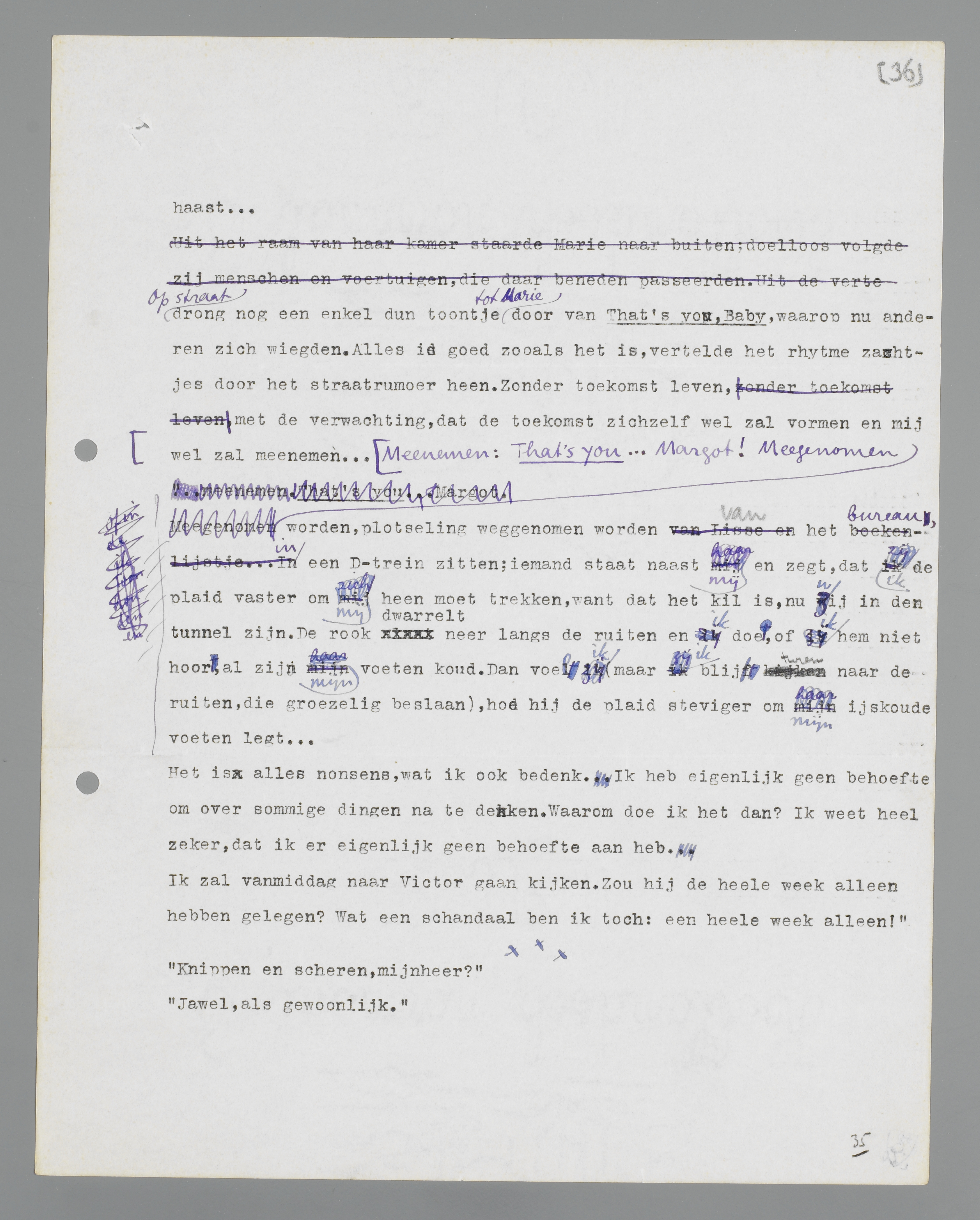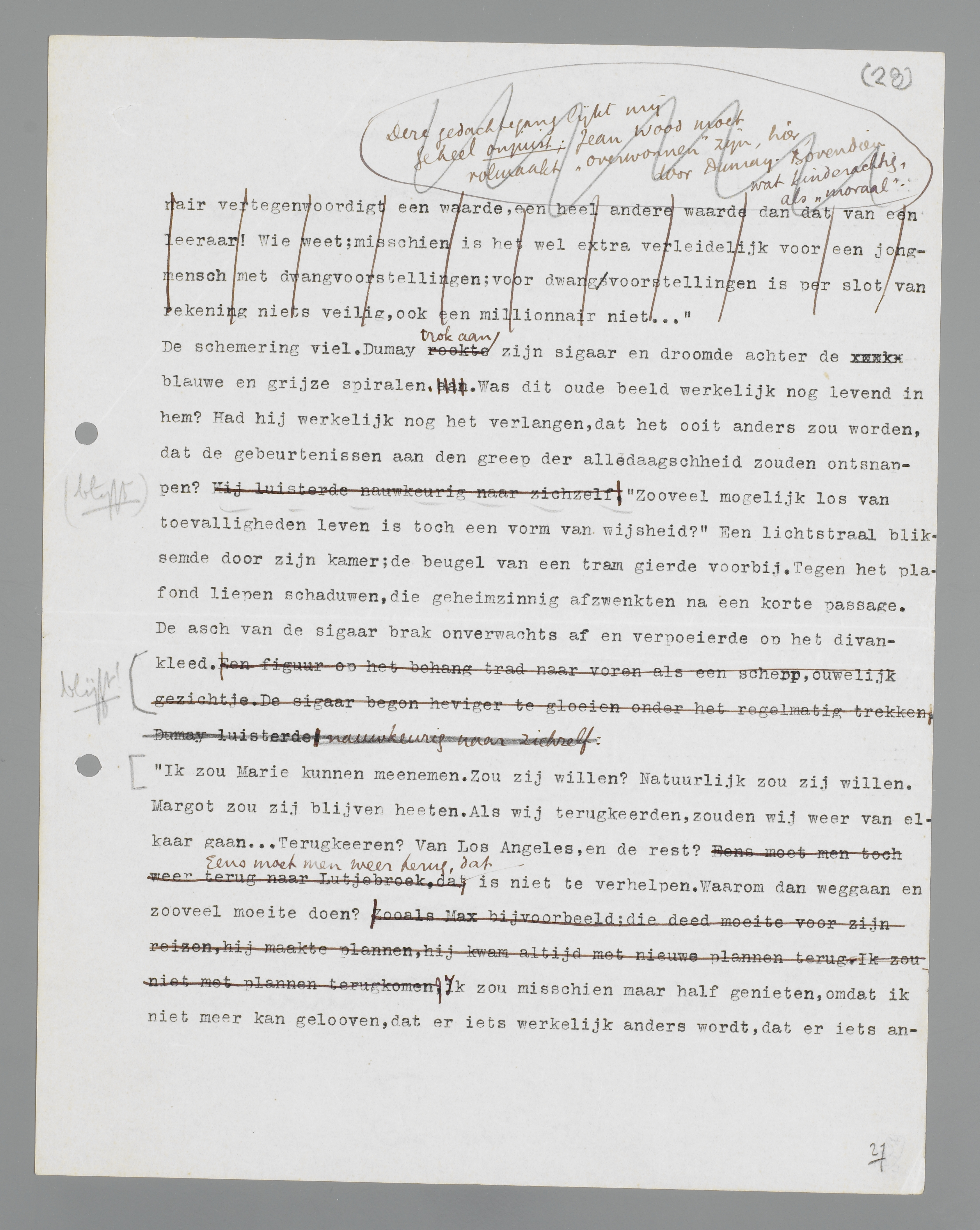 “Ik zou Marie kunnen meenemen. Zou zij willen? Natuurlijk zou zij willen. Margot zou zij blijven heeten. Als wij terugkeerden, zouden wij weer van elkaar gaan... Terugkeeren? Van Los Angeles, en de rest? Eens moet men weer terug, dat is niet te verhelpen. Waarom dan weggaan en zooveel moeite doen? Ik zou misschien maar half genieten, omdat ik niet meer kan gelooven, dat er iets werkelijk anders wordt, dat er iets anders zou kunnen zijn, dat de moeite waard is dan dit beetje gewone tevredenheid. Dit of dat doen: wat komt het er op aan! Ik ben geen avonturier, maar een vier-en-dertigjarige leeraar in de oude talen, ik wil geen poenig afscheid meer nemen. Ik wil voortvegeteeren, diep in mijzelf weggedoken, zoodat