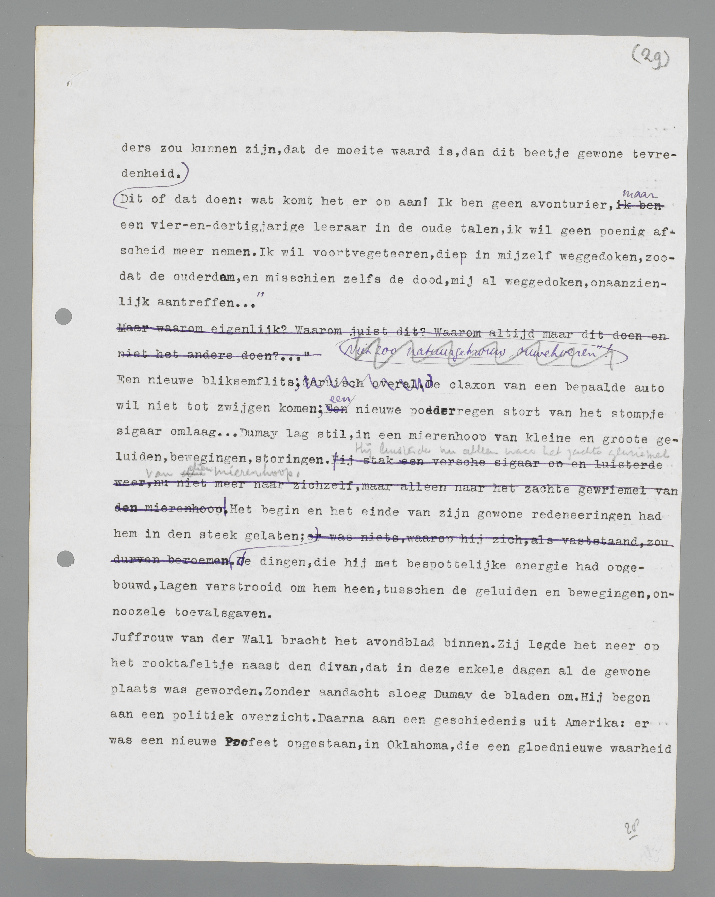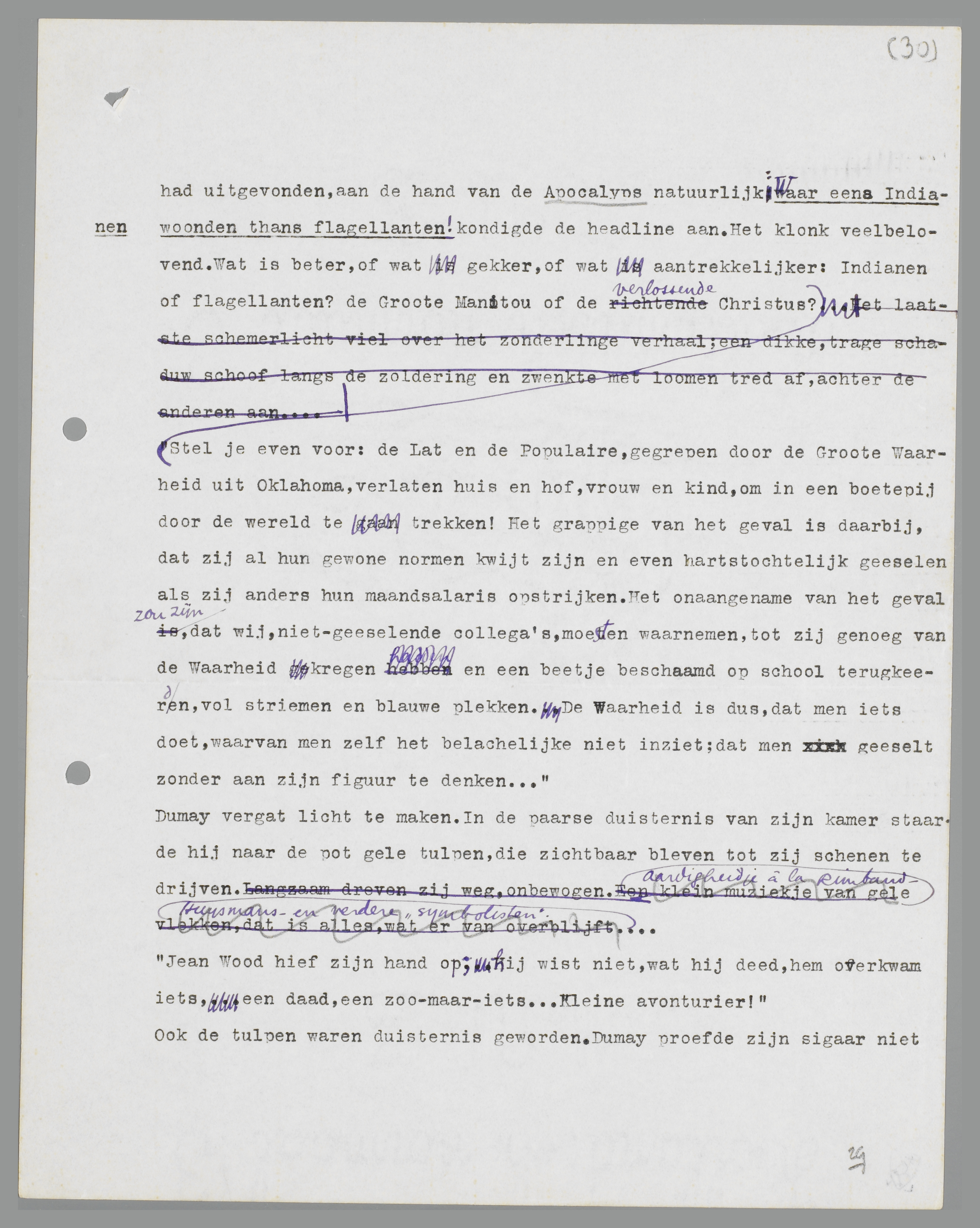 Juffrouw van der Wall bracht het avondblad binnen. Zij legde het neer op het rooktafeltje naast den divan, dat in deze enkele dagen al de gewone plaats was geworden. Zonder aandacht sloeg Dumay de bladen om. Hij begon aan een politiek overzicht. Daarna aan een geschiedenis uit Amerika: er was een nieuwe Profeet opgestaan, in Oklahoma, die een gloednieuwe waarheid had uitgevonden, aan de hand van de Apocalyps natuurlijk: Waar eens Indianen woonden thans flagellanten! kondigde de headline aan. Het klonk veelbelovend. Wat is beter, of wat gekker, of wat aantrekkelijker: Indianen of flagellanten? de Groote Manitou of de verlossende Christus? Stel je even voor: de Lat en de Populaire, gegrepen door de Groote Waarheid uit Oklahoma, verlaten huis en hof, vrouw en kind, om in een boetepij door de wereld te trekken! Het grappige van het geval is daarbij, dat zij al hun gewone normen kwijt zijn en even hartstochtelijk geeselen als zij anders hun maandsalaris opstrijken. Het onaangename van het geval zou zijn, dat wij, niet-geeselende collega's, moesten waarnemen, tot zij genoeg van de Waar-