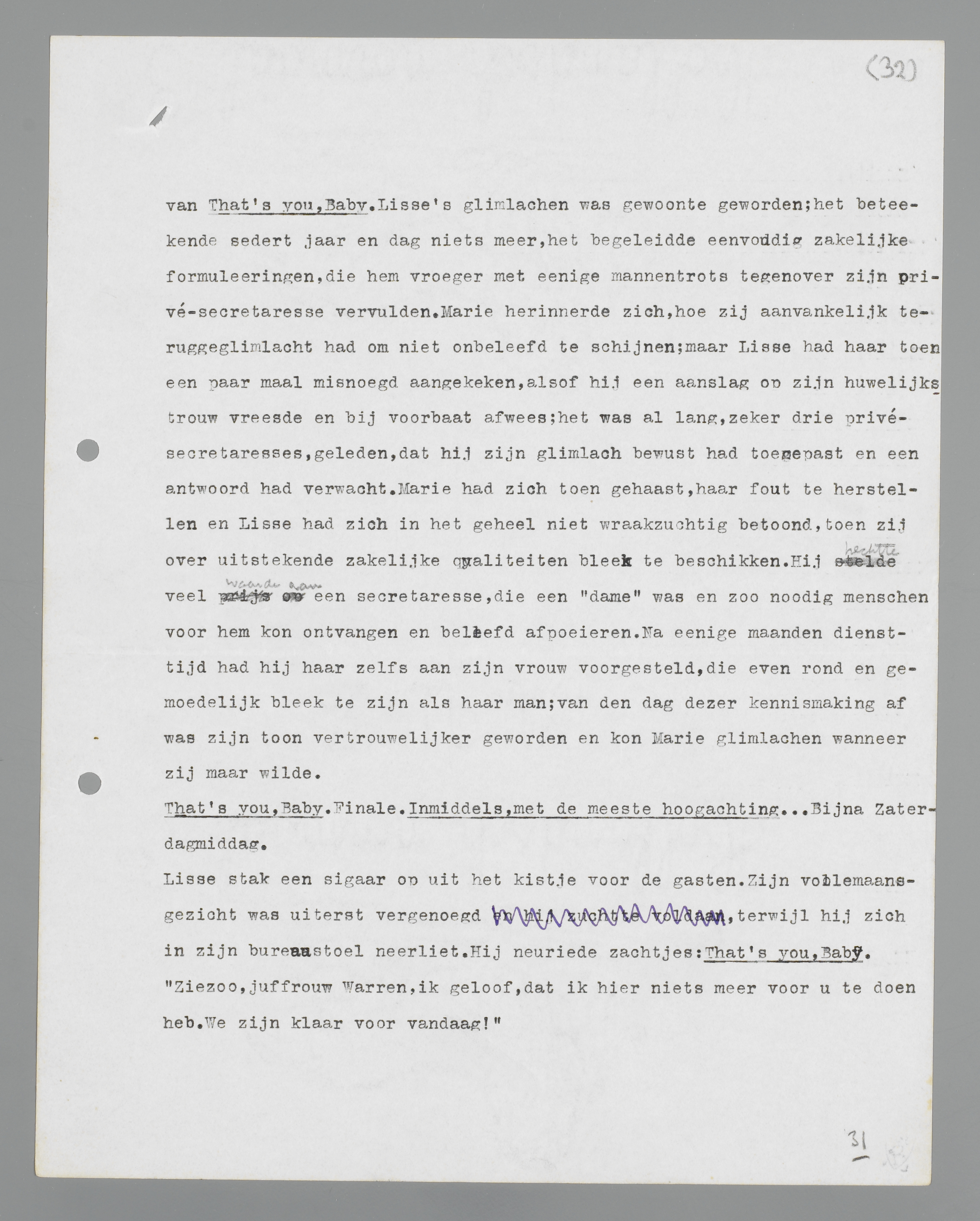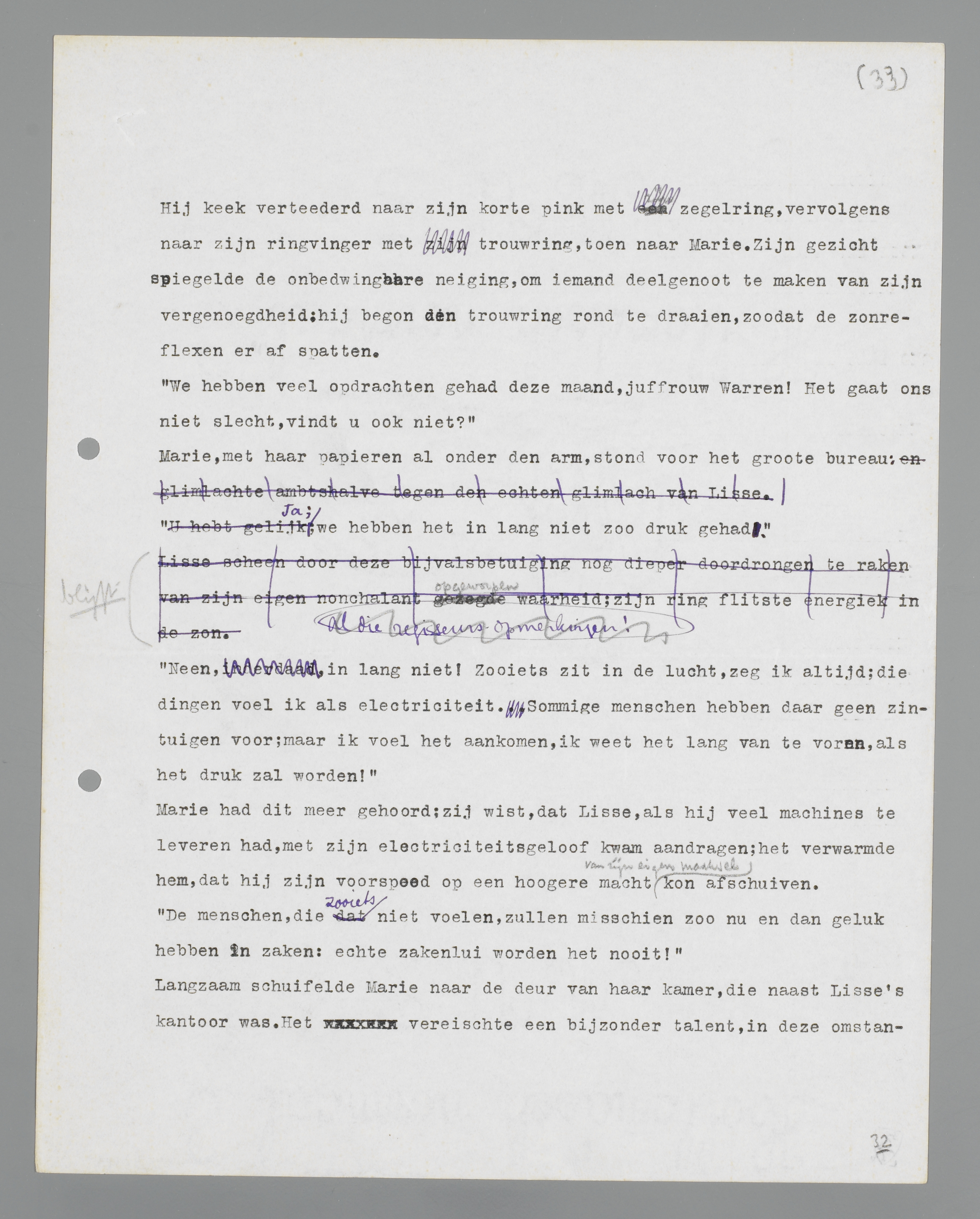 Mechanisch nam Marie den brief op, dien Lisse haar heen en weer loopend dicteerde. Hij glimlachte haar daarbij telkens toe, wanneer hij aan een bijzonder gelukkige zin was gekomen; heimelijk wiegde hij zich op de maat van That's you, Baby. Lisse's glimlachen was gewoonte geworden; het beteekende sedert jaar en dag niets meer, het begeleidde eenvoudig zakelijke formuleeringen, die hem vroeger met eenige mannentrots tegenover zijn privé-secretaresse vervulden. Marie herinnerde zich, hoe zij aanvankelijk teruggeglimlacht had om niet onbeleefd te schijnen; maar Lisse had haar toen een paar maal misnoegd aangekeken, alsof hij een aanslag op zijn huwelijkstrouw vreesde en bij voorbaat afwees; het was al lang, zeker drie privé-secretaresses, geleden, dat hij zijn glimlach bewust had toegepast en een antwoord had verwacht. Marie had zich toen gehaast, haar fout te herstellen en Lisse had zich in het geheel niet wraakzuchtig betoond, toen zij over uitstekende zakelijke qualiteiten bleek te beschikken. Hij hechtte veel waarde aan een secretaresse, die een ‘dame’ was en zoo noodig menschen voor hem kon ontvangen en beleefd afpoeieren. Na eenige maanden diensttijd had hij haar zelfs aan zijn vrouw voorgesteld, die even rond en gemoedelijk bleek te zijn als haar man; van den dag dezer kennismaking af was zijn toon vertrouwelijker geworden