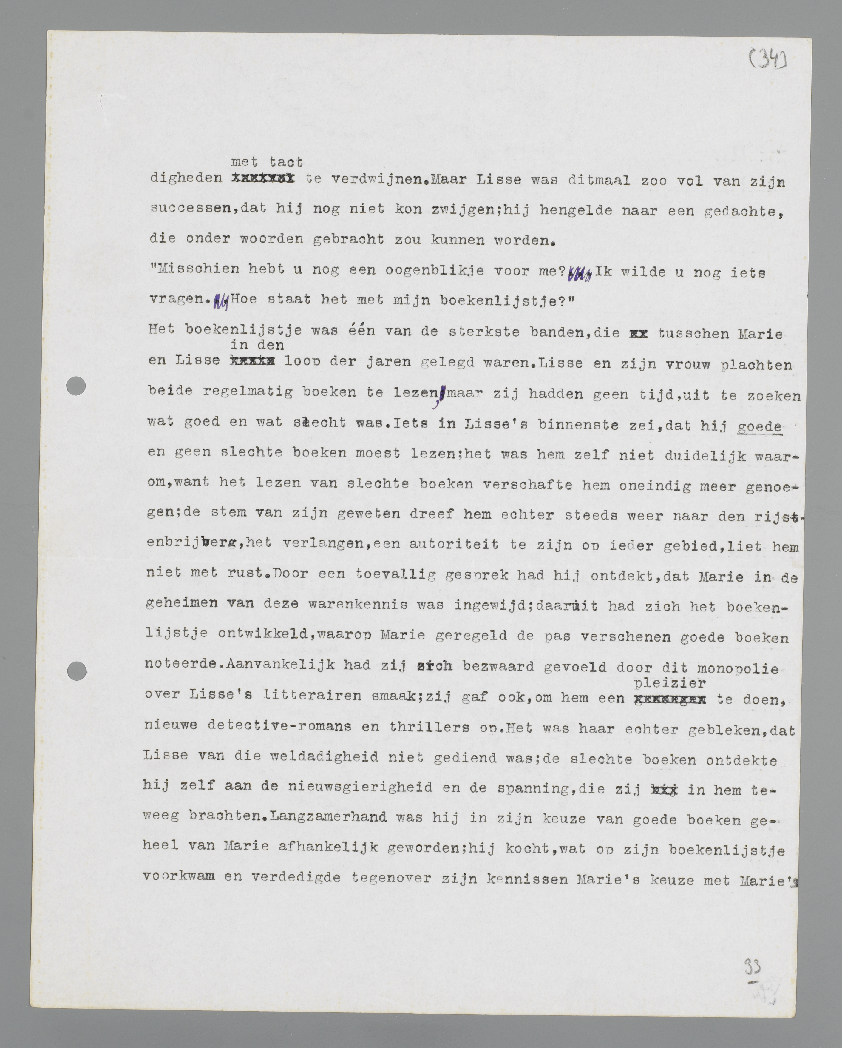 Het boekenlijstje was één van de sterkste banden, die tusschen Marie en Lisse in den loop der jaren gelegd waren. Lisse en zijn vrouw plachten beide regelmatig boeken te lezen, maar zij hadden geen tijd, uit te zoeken wat goed en wat slecht was. Iets in Lisse's binnenste zei, dat hij goede en geen slechte boeken moest lezen; het was hem zelf niet duidelijk waarom, want het lezen van slechte boeken verschafte hem oneindig meer genoegen; de stem van zijn geweten dreef hem echter steeds weer naar den rijstebrijberg; het verlangen om autoriteit te zijn ook op dit gebied, liet hem niet met rust. Door een toevallig gesprek had hij ontdekt, dat Marie in de geheimen van deze warenkennis was ingewijd; daaruit had zich het boekenlijstje ontwikkeld, waarop Marie geregeld de pas verschenen goede boeken noteerde. Aanvankelijk had zij zich bezwaard gevoeld door dit monopolie over Lisse's litterairen smaak; zij gaf ook, om hem een pleizier te doen, nieuwe detective-romans en thrillers op. Het was haar echter ge-