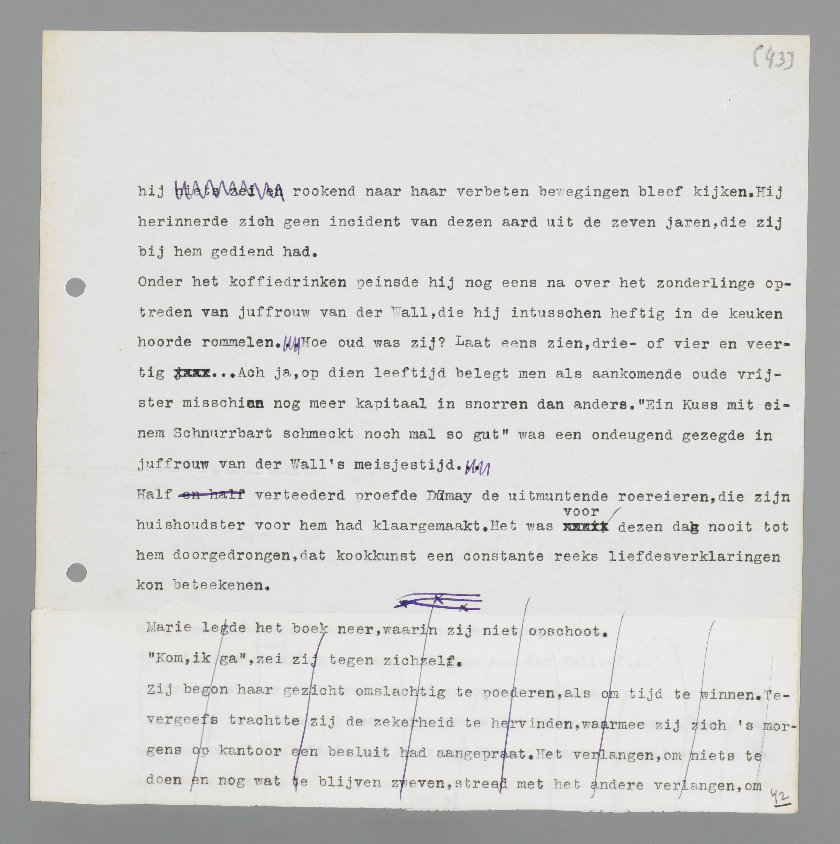 Het voorjaar lokte. Geen betere tijdpasseering denkbaar, dan eerst de brieven te posten en verder den geheelen middag wat om te hangen op een café-terras. Neuriënd zocht Dumay zijn zomerhandschoenen en zijn wandelstok; het gaf hem een pleizierig schokje, dat hij zich in den spiegel naast den kapstok even niet herkende. Voor hij uitging, overhandigde hij juffrouw van der Wall het preekje: