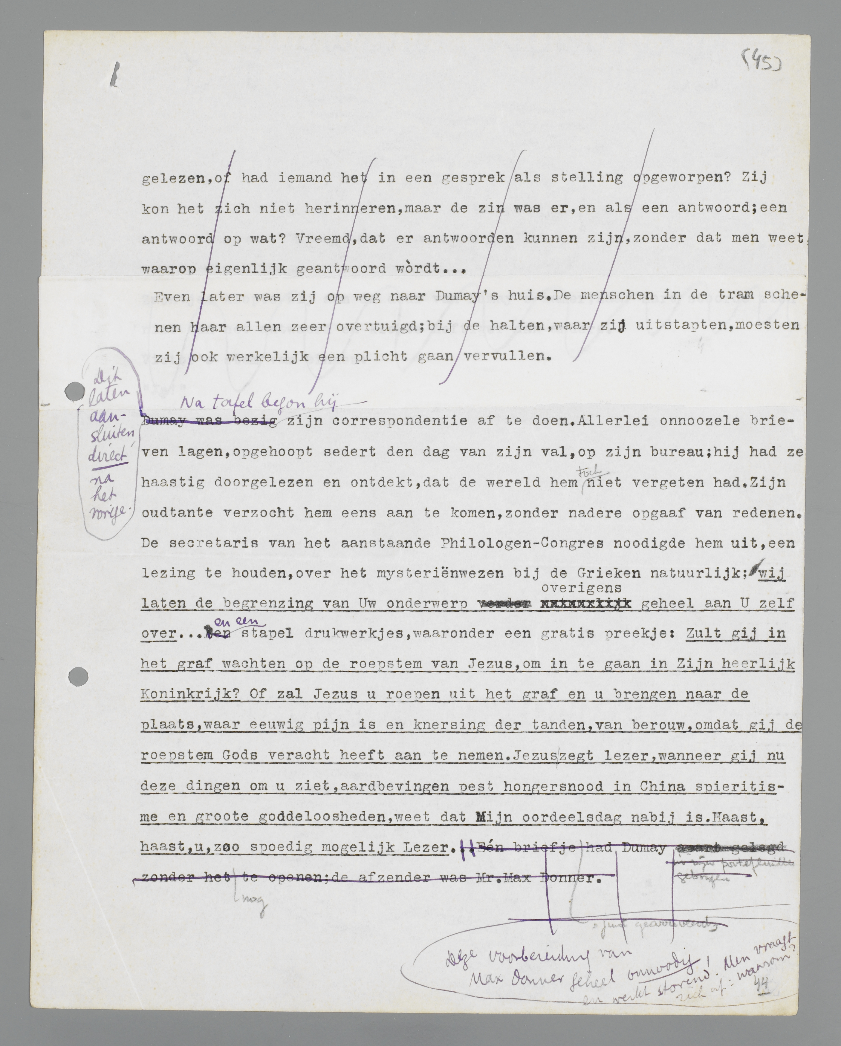 opgaaf van redenen. De secretaris van het aanstaande Philologen-Congres noodigde hem uit, een lezing te houden, over het mysteriënwezen bij de Grieken natuurlijk; wij laten de begrenzing van uw onderwerp overigens geheel aan u zelf over... en een stapel drukwerkjes, waaronder een gratis preekje: Zult gij in het graf wachten op de roepstem van Jezus, om in te gaan in Zijn heerlijk Koninkrijk? Of zal Jezus u roepen uit het graf en u brengen naar de plaats, waar eeuwig pijn is en knersing der tanden, van berouw, omdat gij de roepstem Gods veracht hebt aan te nemen. Jezus zegt, lezer, wanneer gij nu deze dingen om u ziet, aardbevingen, pest, hongersnood in China, spiritisme en groote goddeloosheden, weet dat Mijn oordeelsdag nabij is. Haast, haast u, zoo spoedig mogelijk, Lezer.