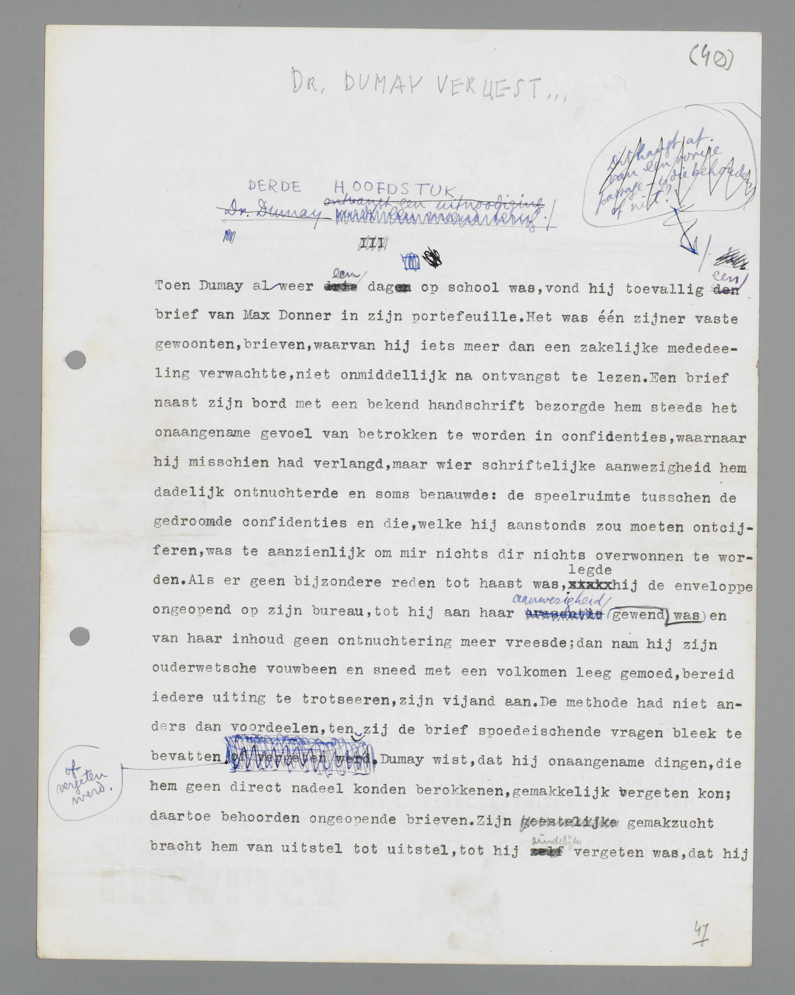 Toen Dumay alweer een dag op school was, vond hij toevallig een brief van Max Donner in zijn portefeuille. Het was één zijner vaste gewoonten, brieven, waarvan hij iets meer dan een zakelijke mededeeling verwachtte, niet onmiddellijk na ontvangst te lezen. Een brief naast zijn bord met een bekend handschrift bezorgde hem steeds het onaangename gevoel van betrokken te worden in confidenties, waarnaar hij misschien had verlangd, maar wier schriftelijke aanwezigheid hem dadelijk ontnuchterde en soms benauwde: de speelruimte tusschen de gedroomde confidenties en die, welke hij aanstonds zou moeten ontcijferen, was te aanzienlijk om mir nichts dir nichts overwonnen te worden. Als er geen bijzondere reden tot haast was, legde hij de enveloppe ongeopend op zijn bureau, tot hij aan haar aanwezigheid was gewend en van haar inhoud geen ontnuchtering meer vreesde; dan nam hij zijn ouderwetsche vouwbeen en sneed met een volkomen leeg gemoed, bereid iedere uiting te trotseeren, zijn vijand aan. De methode had niet anders dan voordeden, tenzij de brief spoedeischende vragen bleek te bevatten of vergeten werd. Dumay wist, dat hij onaangename dingen, die hem geen direct nadeel konden berokkenen, gemakkelijk vergeten kon; daartoe behoorden ongeopende brieven. Zijn gemakzucht bracht hem van uitstel tot uitstel, tot hij eindelijk vergeten was, dat hij iets uitstelde; zelfs de nieuwsgierigheid naar den inhoud van den brief kon hij vergeten. Aan niets was hem meer gelegen dan aan een ongestoord leven; en het was nooit geheel zeker, dat een onschuldige