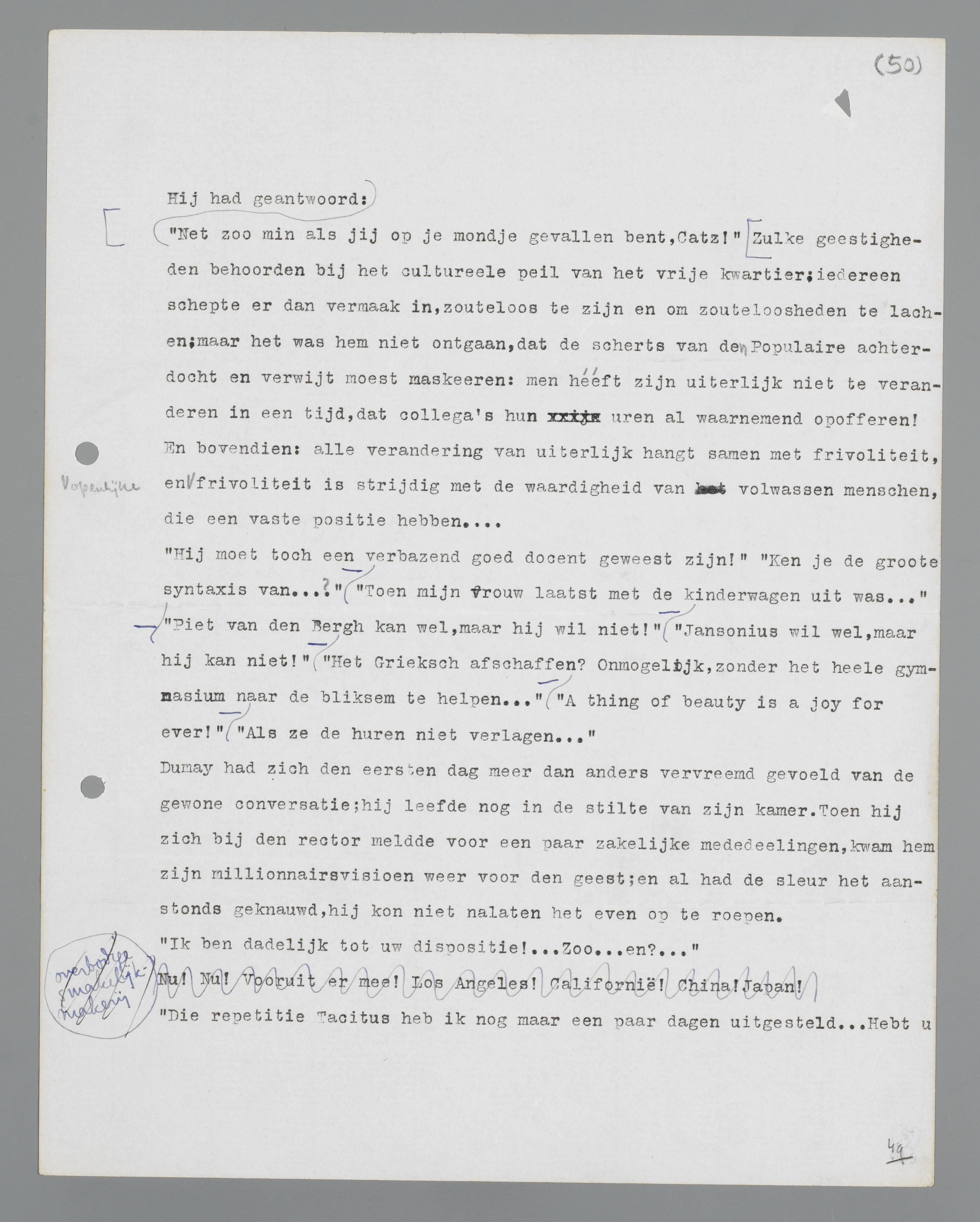 ‘Hij moet toch een verbazend goed docent geweest zijn!’ ‘Ken je de groote syntaxis van...?’ - ‘Toen mijn vrouw laatst met de kinderwagen uit was...’ - ‘Piet van den Bergh kan wel, maar hij wil niet!’ - ‘Jansonius wil wel, maar hij kan niet!’ - ‘Het Grieksch afschaffen? Onmogelijk, zonder het heele gymnasium naar de bliksem te helpen...’ - ‘A thing of beauty is a joy for ever!’ - ‘Als ze de huren niet verlagen...’