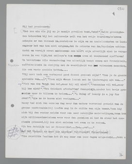 Zulke geestigheden behoorden bij het cultureele peil van het vrije kwartier; iedereen schepte er dan vermaak in, zouteloos te zijn en om zouteloosheden te lachen: maar het was hem niet ontgaan, dat de scherts van den Populaire achterdocht en verwijt moest maskeeren: men hééft zijn uiterlijk niet te veranderen in een tijd, dat collega's hun uren al waarnemend opofferen! En bovendien: alle verandering van uiterlijk hangt samen met frivoliteit, en open-