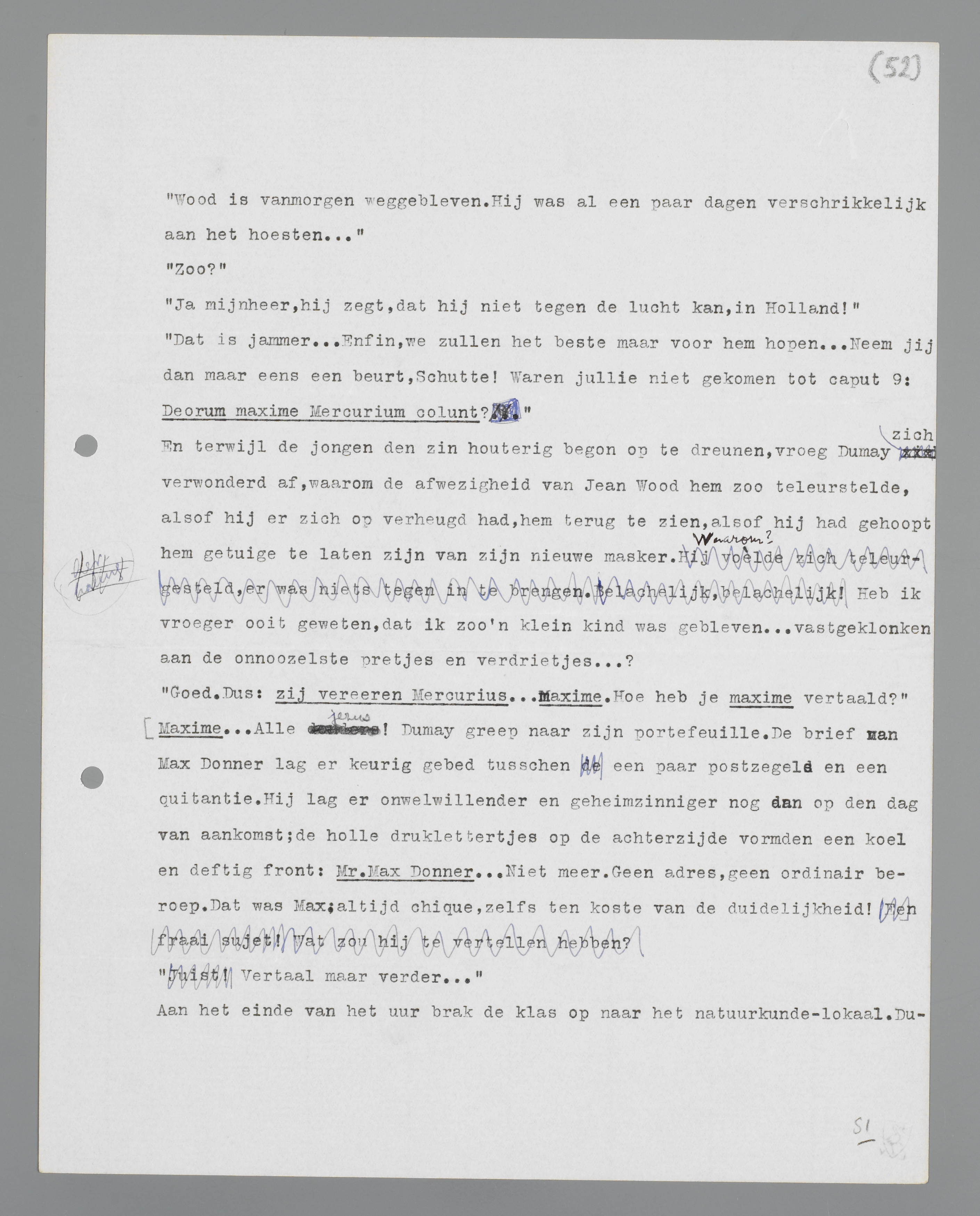 Aan het einde van het uur brak de klas op naar het natuurkunde-lokaal. Dumay bleef achter met de verlaten banken, waarop verstrooide papieren en passers zwierven; met één van de passers ritste hij resoluut het couvert van Donner's brief open.