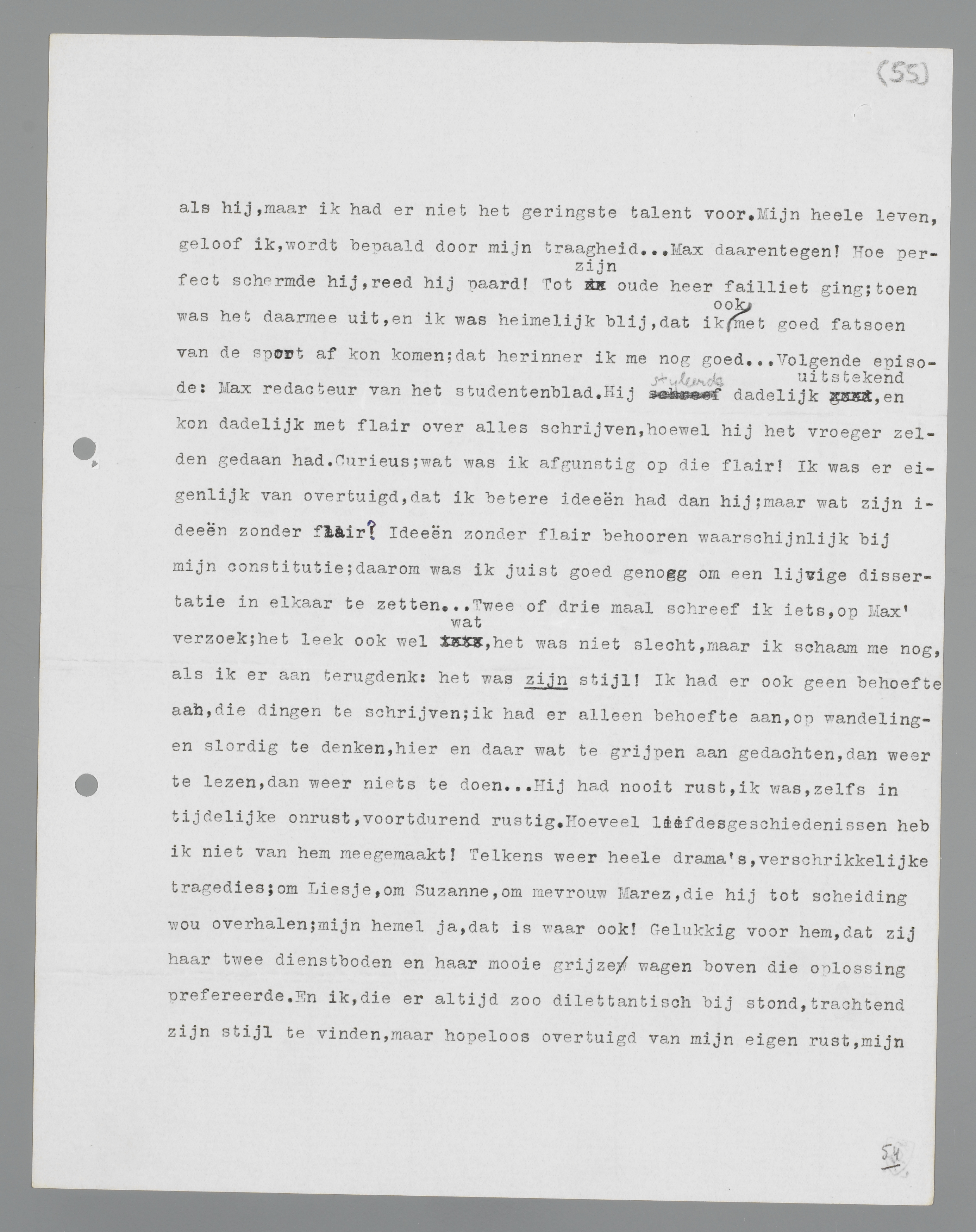 leerend tusschen de schrijvende kinderen liet Dumay zich door de plotseling zoo nabije herinneringen overstroomen; hij zag het bekende duo Donner-Dumay, waarvan buitenstaanders maar niet konden begrijpen, hoe het bij elkaar was gekomen, bij zijn evoluties in de manege, in de café's, op studentenkamers. De onafscheidelijken! De twee D's! Waarom? ‘Het eenige, wat jullie gemeen hebben, is je lengte en je studiejaar,’ had de oude heer Donner eens gezegd; zij hadden er om gelachen en waren voortgegaan elkaar iederen dag te ontmoeten, alsof het vanzelf sprak. Had hij ongelijk, de goede man? dacht Dumay, terwijl hij een jongen, die op zij keek, zachtjes aan zijn oor trok. Max leek werkelijk niets op mij. Hij was een virtuoos, ik was bang voor alle virtuositeit. Het trok mij aan, zoo te zijn als hij, maar ik had er niet het geringste talent voor. Mijn heele leven, geloof ik, wordt bepaald door mijn traagheid... Max daarentegen! Hoe perfect schermde hij, reed hij paard! Tot zijn oude heer failliet ging; toen was het daarmee uit, en ik was heimelijk blij, dat ik ook met goed fatsoen van de sport af kon komen; dat herinner ik me nog goed... Volgende episode: Max redacteur van het studentenblad. Hij styleerde dadelijk uitstekend, en kon dadelijk met flair over alles schrijven, hoewel hij het vroeger zelden gedaan had. Curieus; wat was ik afgunstig op die flair! Ik was er eigenlijk van overtuigd, dat ik betere ideeën had dan hij; maar wat zijn ideeën zonder flair? Ideeën zonder flair behooren waarschijnlijk bij mijn constitutie; daarom was ik juist goed genoeg om een lijvige dissertatie in elkaar te zetten. Twee of drie maal schreef ik iets, op Max' verzoek; het leek ook wel wat, het was niet slecht, maar ik schaam me nog, als ik er aan terugdenk: het was zijn stijl! Ik had er ook geen behoefte aan, die din-