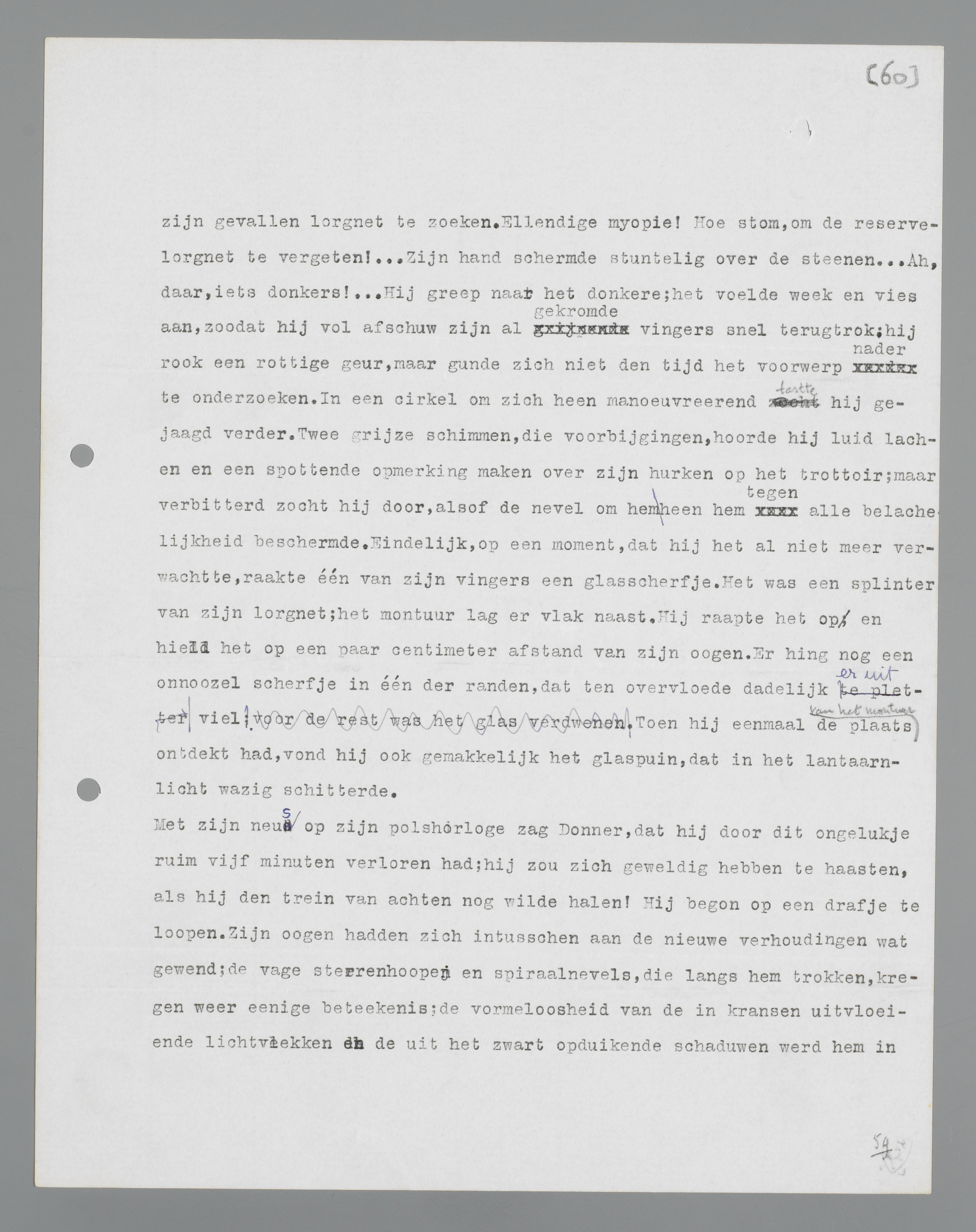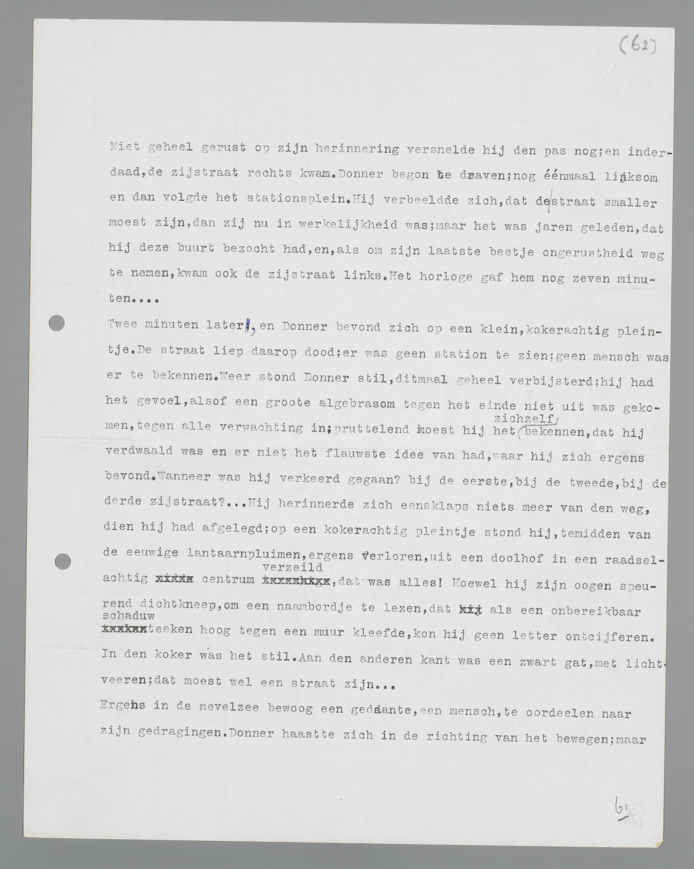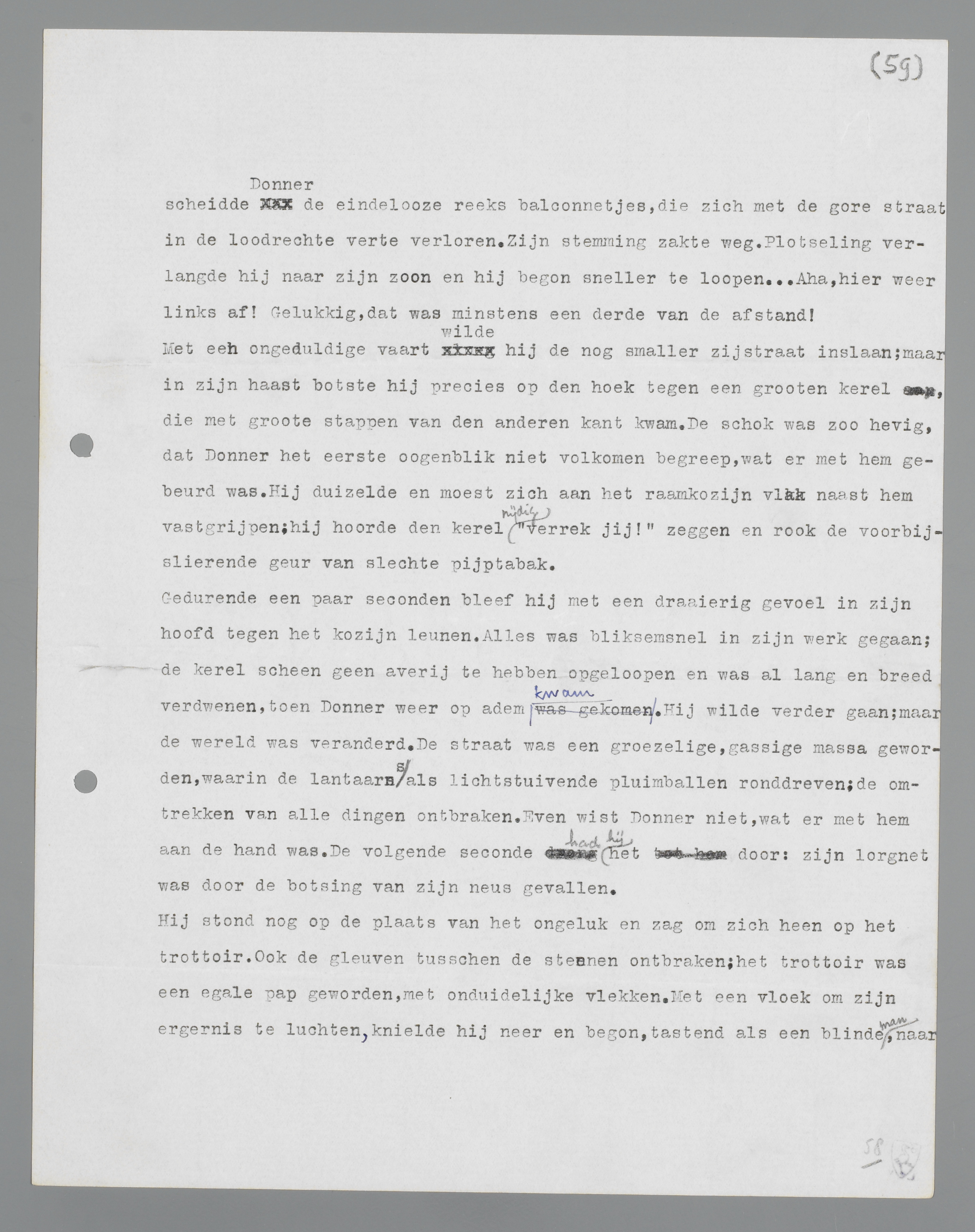 Ergens in de nevelzee bewoog een gedaante, een mensch, te oordeelen naar zijn gedragingen. Donner haastte zich in de richting van het bewegen; maar een deur sloeg dicht en het was weer groezelig en stil. Hij dacht na: zou hij ergens aanbellen en den weg vragen? Welneen, onzin! Laat zien; hij was mogelijk te veel rechts gekomen; alles was heel eenvoudig, wanneer hij maar het zwarte gat tegenover hem inging en dan steeds links aanhield. De trein was natuurlijk niet meer te halen; enfin... Hij wendde zich manmoedig naar het zwarte gat en begon systematisch links aan te houden, straat in, straat uit, de ééne grauwe pijp voor, de andere na. Hij liep met de driestheid van een bezetene, als was hij volkomen zeker van zijn zaak. Eindelijk herkende hij het profiel van een straat aan een lichte bocht. Die bocht! was het een obsessie, of...? Aan het einde lag weer het kleine, kokerachtige pleintje met de grauwe muurvlakken en aan den overkant een zwart gat.