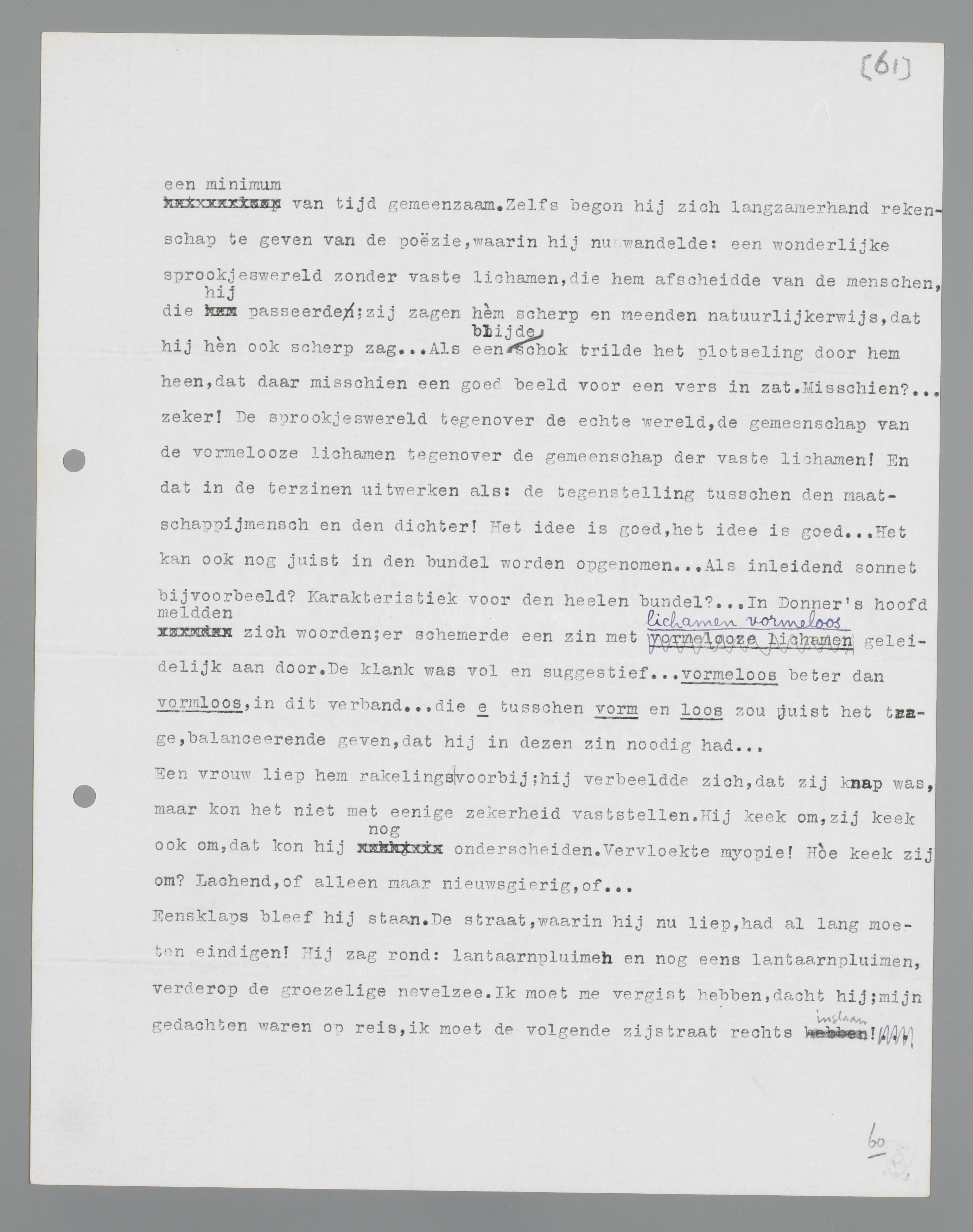 door dit ongelukje ruim vijf minuten verloren had; hij zou zich geweldig hebben te haasten, als hij den trein van achten nog wilde halen! Hij begon op een drafje te loopen. Zijn oogen hadden zich intusschen aan de nieuwe verhoudingen wat gewend; de vage sterrenhoopen en spiraalnevels, die langs hem trokken, kregen weer eenige beteekenis; de vormeloosheid van de in kransen uitvloeiende lichtvlekken en de uit het zwart opduikende schaduwen werd hem in een minimum van tijd gemeenzaam. Zelfs begon hij zich langzamerhand rekenschap te geven van de poëzie, waarin hij nu wandelde: een wonderlijke sprookjeswereld zonder vaste lichamen, die hem afscheidde van de menschen, die hij passeerde; zij zagen hèm scherp en meenden natuurlijkerwijs, dat hij hèn ook scherp zag... Als een blijde schok trilde het plotseling door hem heen, dat daar misschien een goed beeld voor een vers in zat. Misschien?... zeker! De sprookjeswereld tegenover de echte wereld, de gemeenschap van de vormelooze lichamen tegenover de gemeenschap der vaste lichamen! En dat in de terzinen uitwerken als: de tegenstelling tusschen den maatschappijmensch en den dichter! Het idee is goed, het idee is goed... Het kan ook nog juist in den bundel worden opgenomen. Als inleidend sonnet bijvoorbeeld? Karakteristiek voor den heelen bundel?... In Donners hoofd meldden zich woorden; er schemerde een zin met lichamen vormeloos geleidelijk aan door. De klank was vol en suggestief... vormeloos beter dan vormloos, in dit verband... die e tusschen vorm en loos zou juist het trage, balanceerende geven, dat hij in deze strophe noodig had...