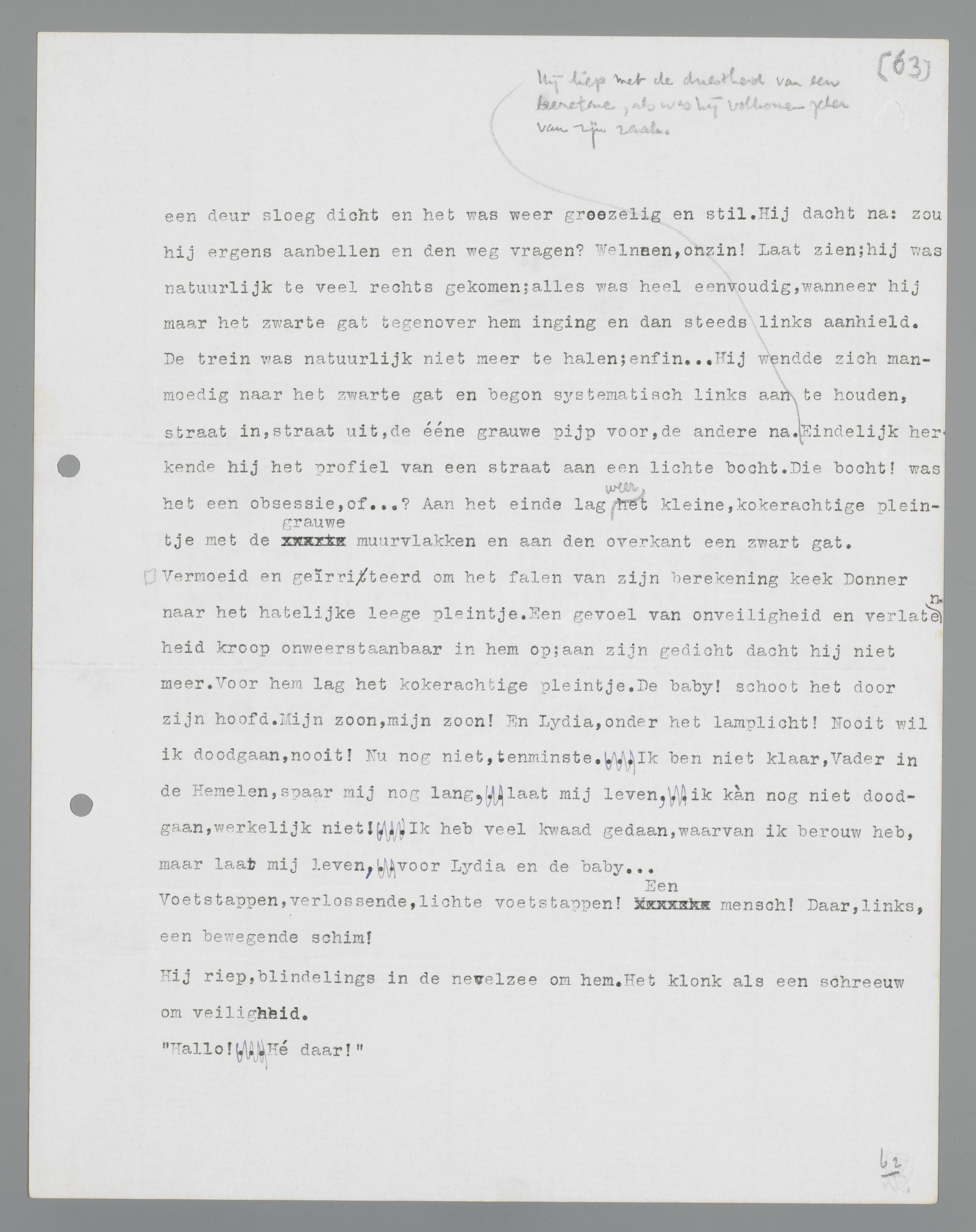 Vermoeid en geïrriteerd om het falen van zijn berekening keek Donner naar het hatelijke leege pleintje. Een gevoel van onveiligheid en verlatenheid kroop onweerstaanbaar in hem op; aan zijn gedicht dacht hij niet meer. Voor hem lag het kokerachtige pleintje, waaruit de nevels dreigend naar hem toe schenen te groeien... De baby! schoot het door zijn hoofd. Mijn zoon, mijn zoon! En Lydia, onder het lamplicht! Nooit wil ik doodgaan, nooit! Nu nog niet, tenminste. Ik ben niet klaar, Vader in de Hemelen, spaar mij nog lang, laat mij leven, ik kàn nog niet doodgaan, werkelijk niet! Ik heb veel kwaad gedaan, waarvan ik be-
