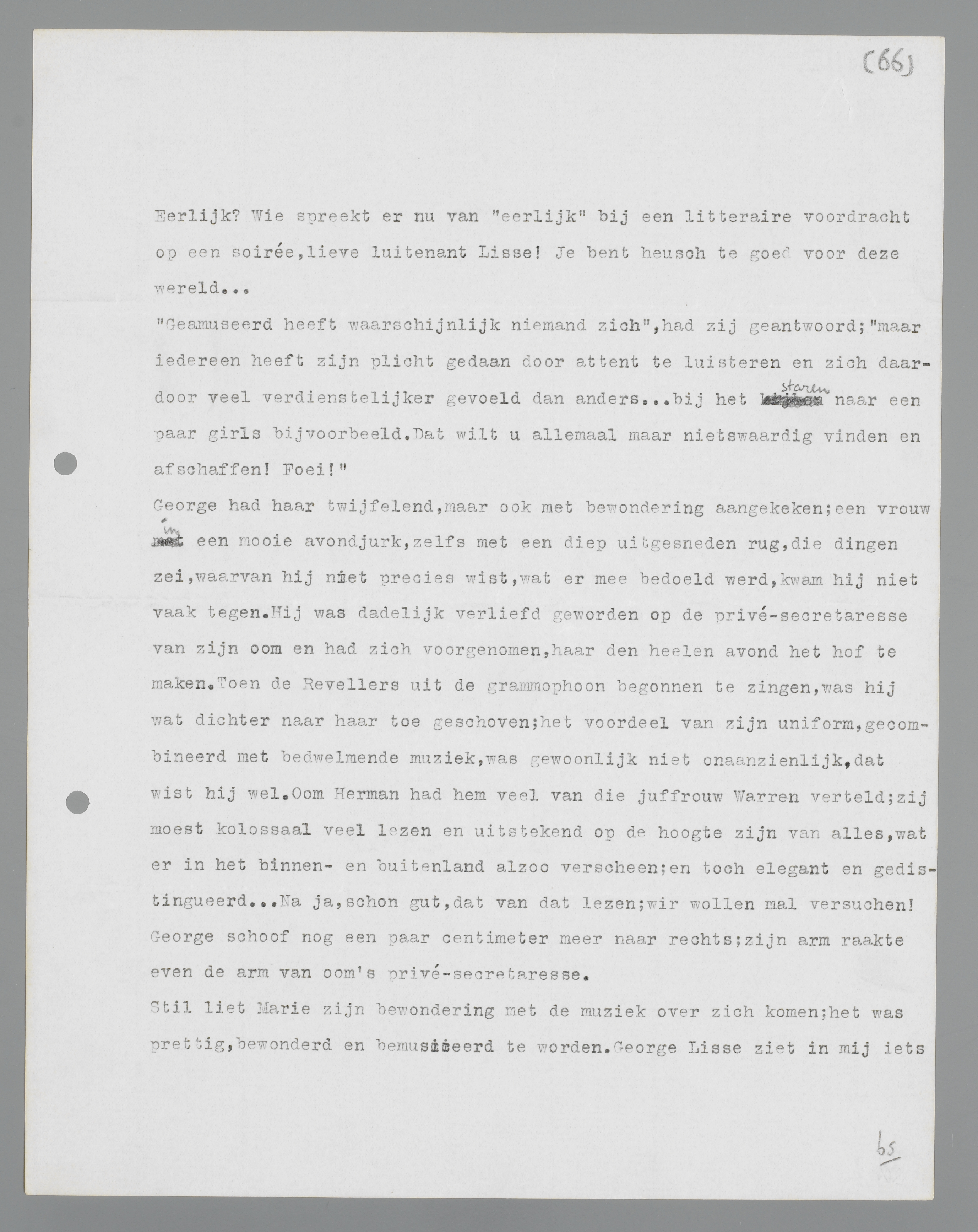 George had haar twijfelend, maar ook met bewondering aangekeken; een vrouw in een mooie avondjurk, zelfs met een diep uitgesneden rug, die dingen zei, waarvan hij niet precies wist, wat er mee bedoeld werd, kwam hij niet vaak tegen. Hij was dadelijk verliefd geworden op de privé-secretaresse van zijn oom en had zich voorgenomen, haar den heelen avond het hof te maken. Toen de Revellers uit de gramophoon begonnen te zingen, was hij wat dichter naar haar toe geschoven; het voordeel van zijn uniform, gecombineerd met bedwelmende muziek, was gewoonlijk niet onaanzienlijk, dat wist hij wel. Oom Herman had hem veel van die juffrouw Warren verteld; zij moest kolossaal veel lezen en uitstekend op de hoogte zijn van alles, wat er in het binnen- en buitenland alzoo verscheen; en toch elegant en gedistingeerd... Na ja, schon gut, dat van dat lezen; wir wollen mal versuchen! George schoof nog een