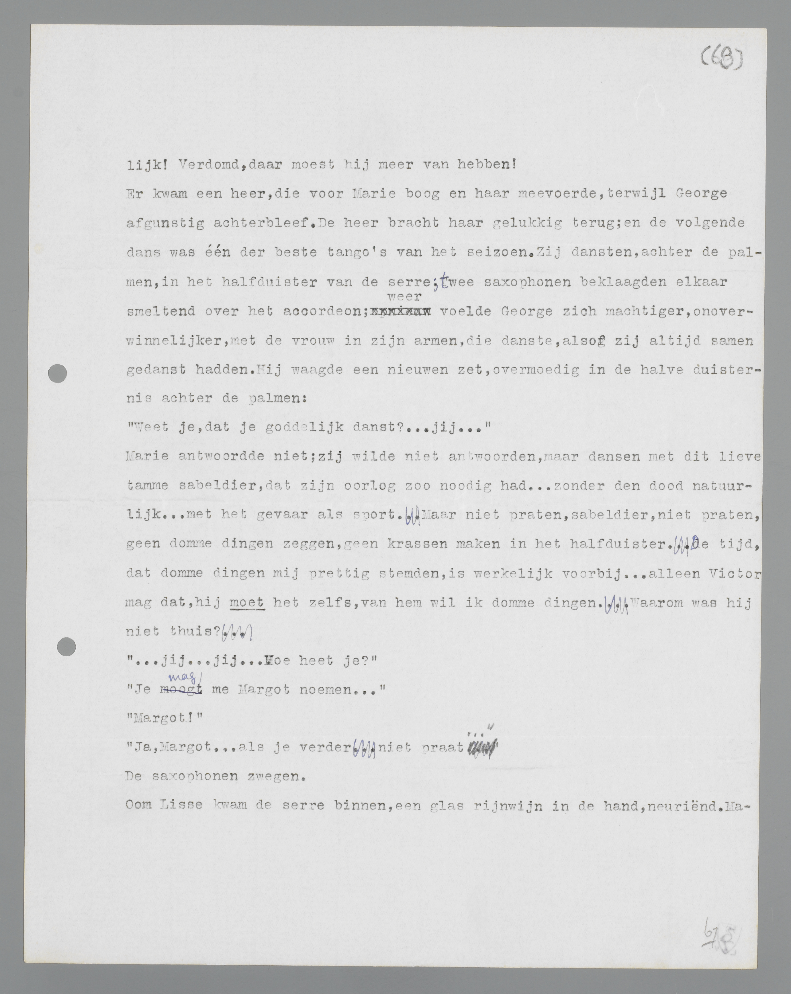 Er kwam een heer, die voor Marie boog en haar meevoerde, terwijl George afgunstig achterbleef. De heer bracht haar gelukkig terug; en de volgende dans was één der beste tango's van het seizoen. Zij dansten, achter de palmen, in het halfduister van de serre; twee saxophonen beklaagden elkaar smeltend over het accordeon; weer voelde George zich machtiger, onoverwinnelijker, met de vrouw in zijn armen, die danste, alsof zij altijd samen gedanst hadden. Hij waagde een nieuwen zet, overmoedig in de halve duisternis: