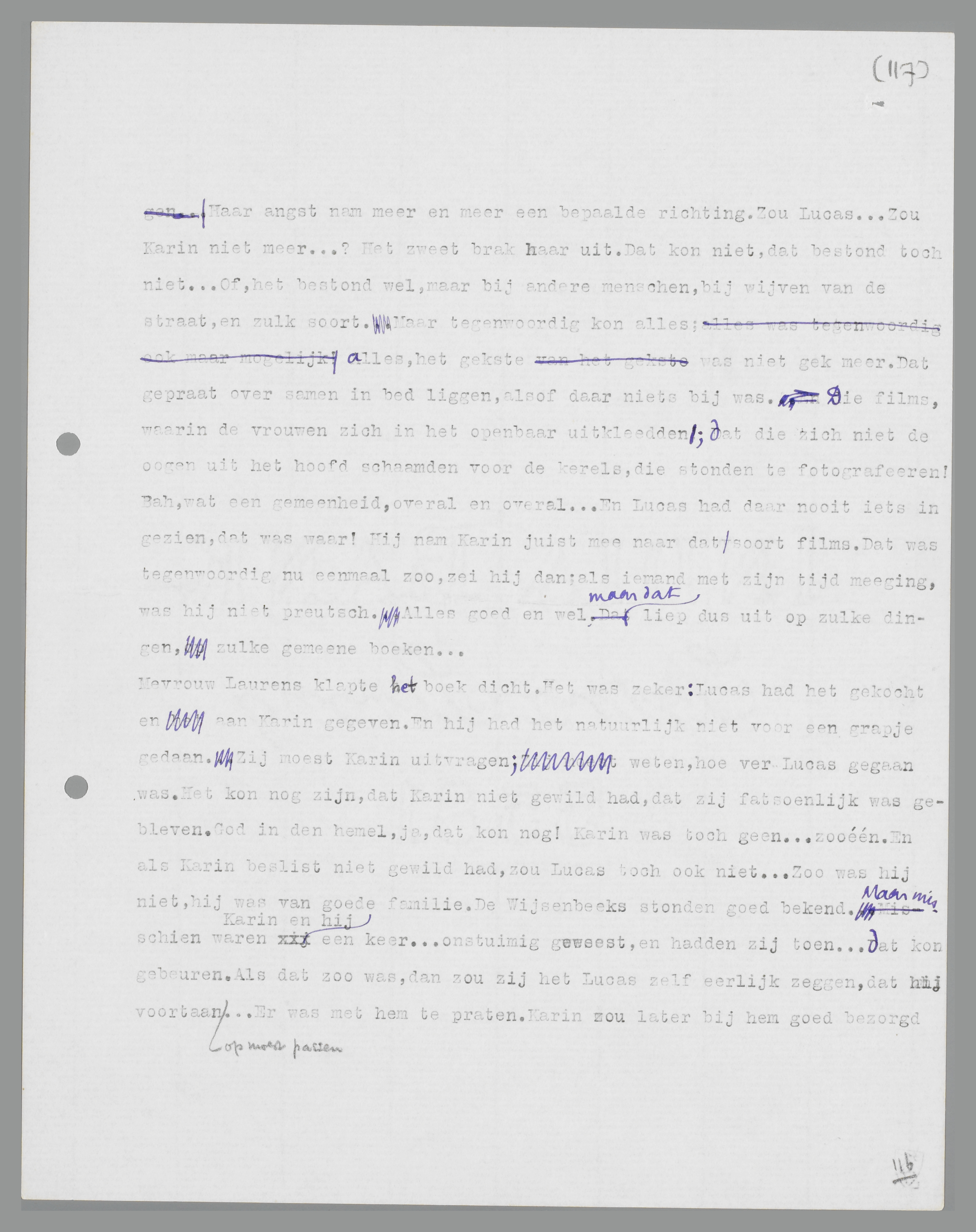Mevrouw Laurens klapte het boek dicht. Het was zeker: Lucas had het gekocht en aan Karin gegeven. En hij had het natuurlijk niet voor een grapje gedaan. Zij moest Karin uitvragen; weten, hoe ver Lucas gegaan was. Het kon nog zijn, dat Karin niet gewild had, dat zij fatsoenlijk was gebleven. God in den hemel, ja, dat kon nog! Karin was toch geen...zooéén. En als Karin beslist niet gewild had, zou Lucas toch ook niet... Zoo was hij niet, hij was van goede familie. De Wijsenbeeks stonden goed bekend. Maar misschien waren Karin en hij een keer... onstuimig geweest, en hadden zij toen... dat kon gebeuren. Als dat zoo was, dan zou zij het Lucas zelf eerlijk zeggen, dat hij voortaan op moest passen... Er was met hem te praten. Karin zou later bij hem goed bezorgd zijn. Maar tot het huwelijk kon hij wachten. Dat moest hij beloven; hij was acht jaar ouder dan Karin, hij kon weten, dat er in het leven nog iets anders te koop is dan alleen maar dàt.