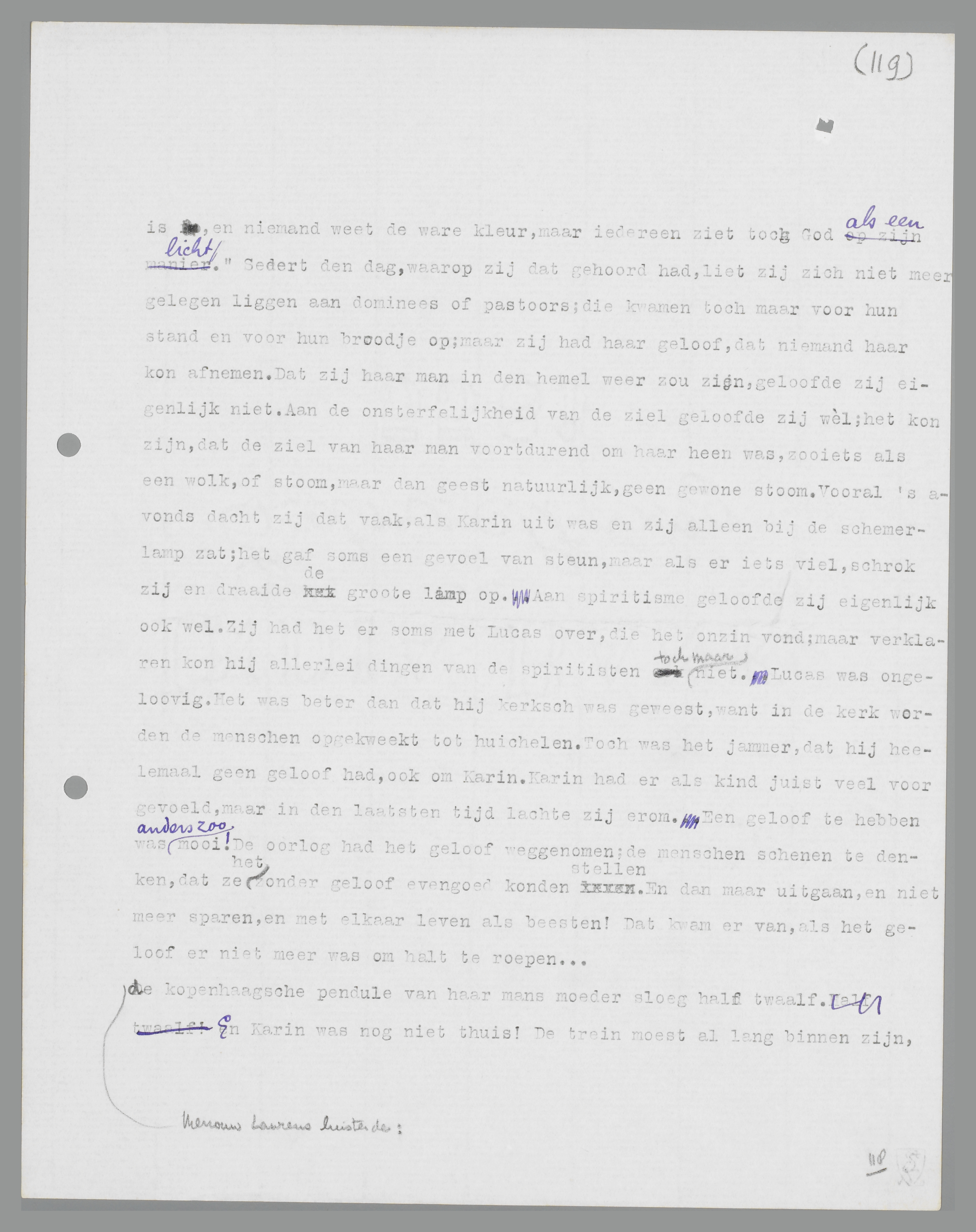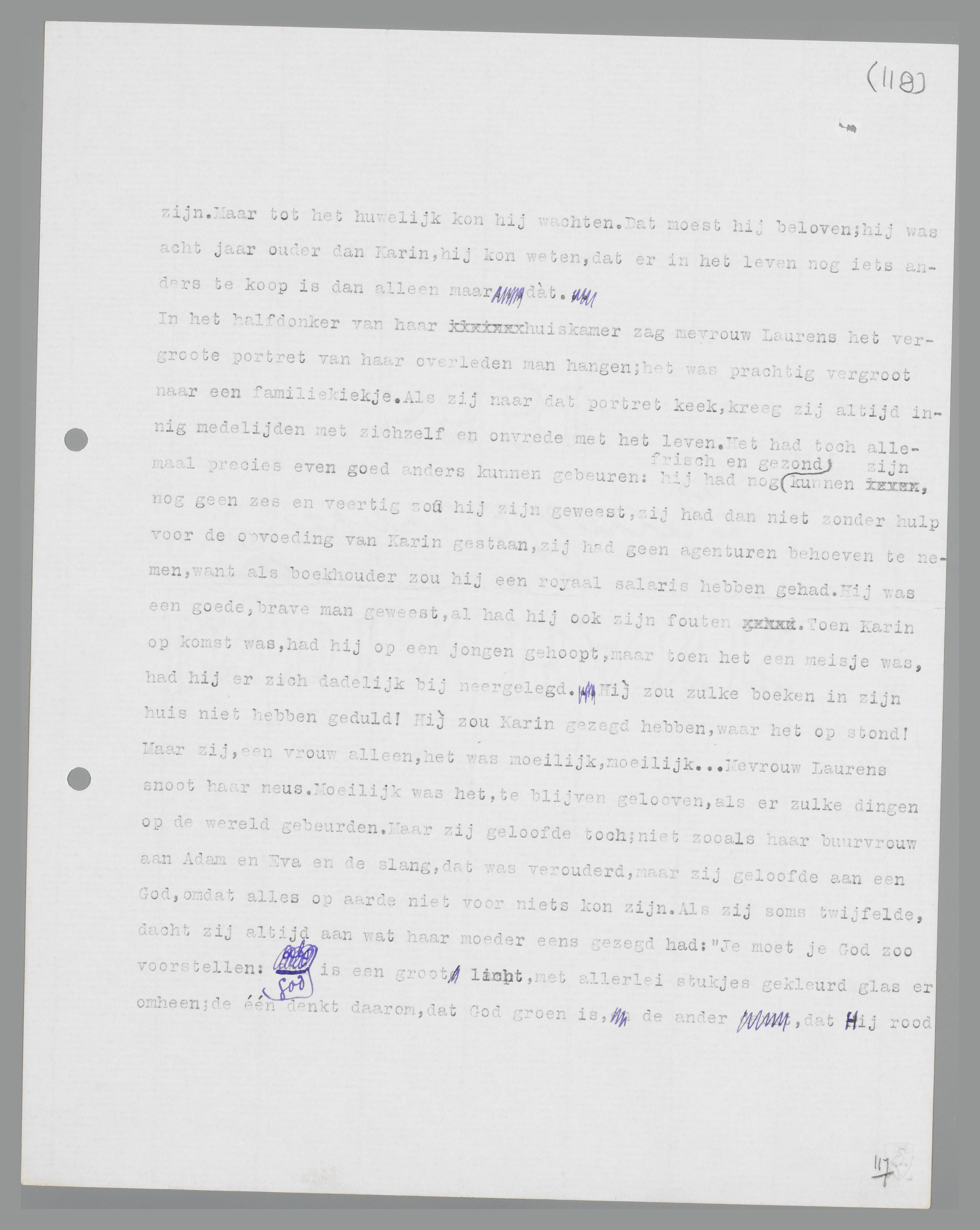allemaal precies even goed anders kunnen gebeuren: hij had nog frisch en gezond kunnen zijn, nog geen zes en veertig zou hij zijn geweest, zij had dan niet zonder hulp voor de opvoeding van Karin gestaan, zij had geen agenturen behoeven te nemen, want als boekhouder zou hij een royaal salaris hebben gehad. Hij was een goede, brave man geweest, al had hij ook zijn fouten. Toen Karin op komst was, had hij op een jongen gehoopt, maar toen het een meisje was, had hij er zich dadelijk bij neergelegd. Hìj zou zulke boeken in zijn huis niet hebben geduld! Hìj zou Karin gezegd hebben, waar het op stond! Maar zij, een vrouw alleen, het was moeilijk, moeilijk... Mevrouw Laurens snoot haar neus. Moeilijk was het, te blijven gelooven, als er zulke dingen op de wereld gebeurden. Maar zij geloofde toch; niet zooals haar buurvrouw aan Adam en Eva en de slang, dat was verouderd, maar zij geloofde aan een God, omdat alles op aarde niet voor niets kon zijn. Als zij soms twijfelde, dacht zij altijd aan wat haar moeder eens gezegd had: ‘Je moet je God zoo voorstellen: God is een groot licht, met allerlei stukjes gekleurd glas er omheen; de één denkt daarom, dat God groen is, de ander, dat Hij rood is, en niemand weet de ware kleur, maar iedereen ziet toch God als een licht.’ Sedert den dag, waarop zij dat gehoord had, liet zij zich niet meer gelegen liggen aan dominees of pastoors; die kwamen toch maar voor hun stand en voor hun broodje op; maar zij had haar geloof, dat niemand haar kon afnemen. Dat zij haar man in den hemel weer zou zien, geloofde zij eigenlijk niet. Aan de onsterfelijkheid van de ziel geloofde zij wèl; het kon zijn, dat de ziel van haar man voortdurend om haar heen was, zooiets als een wolk, of stoom, maar dan geest natuurlijk, geen gewone stoom. Vooral 's avonds