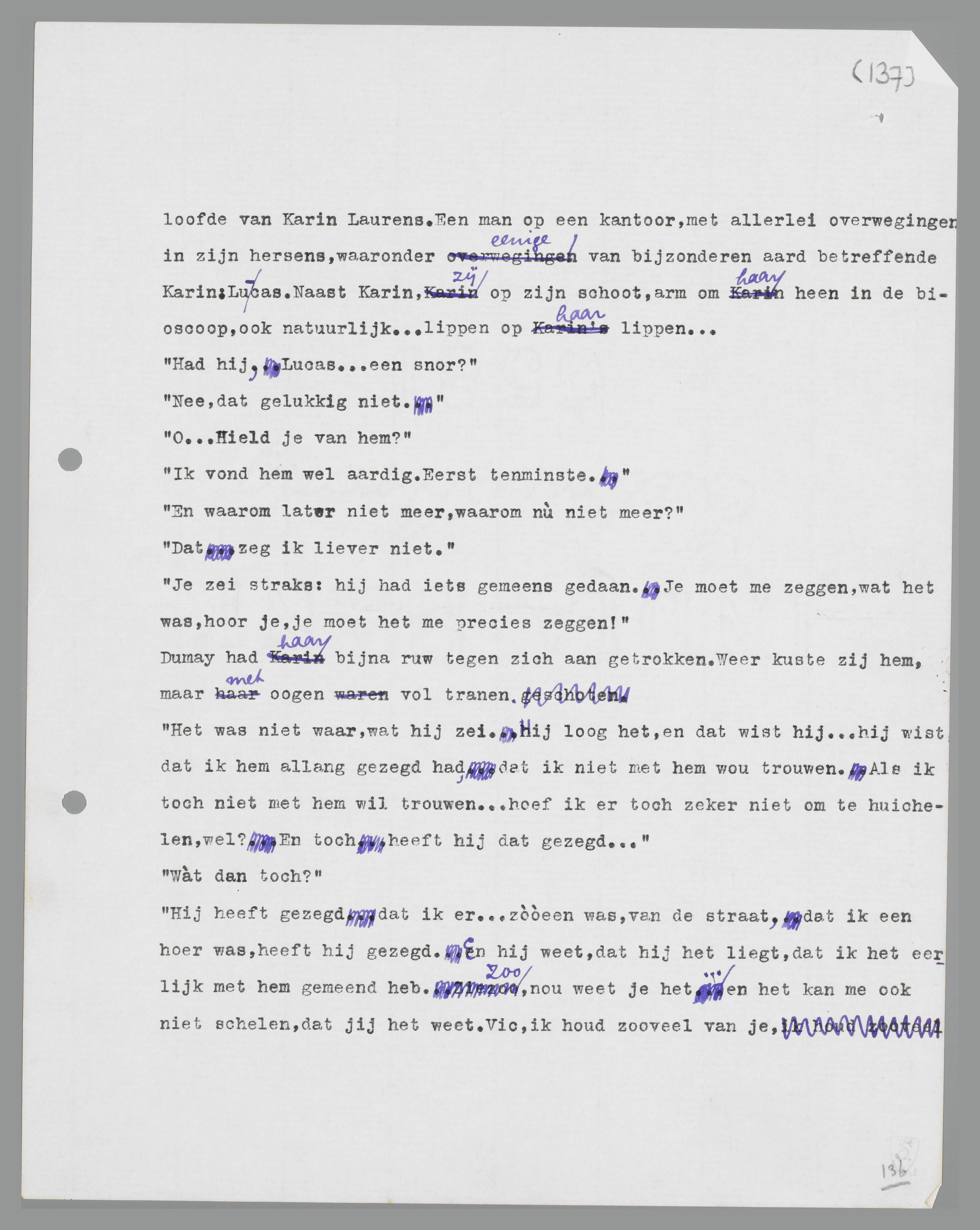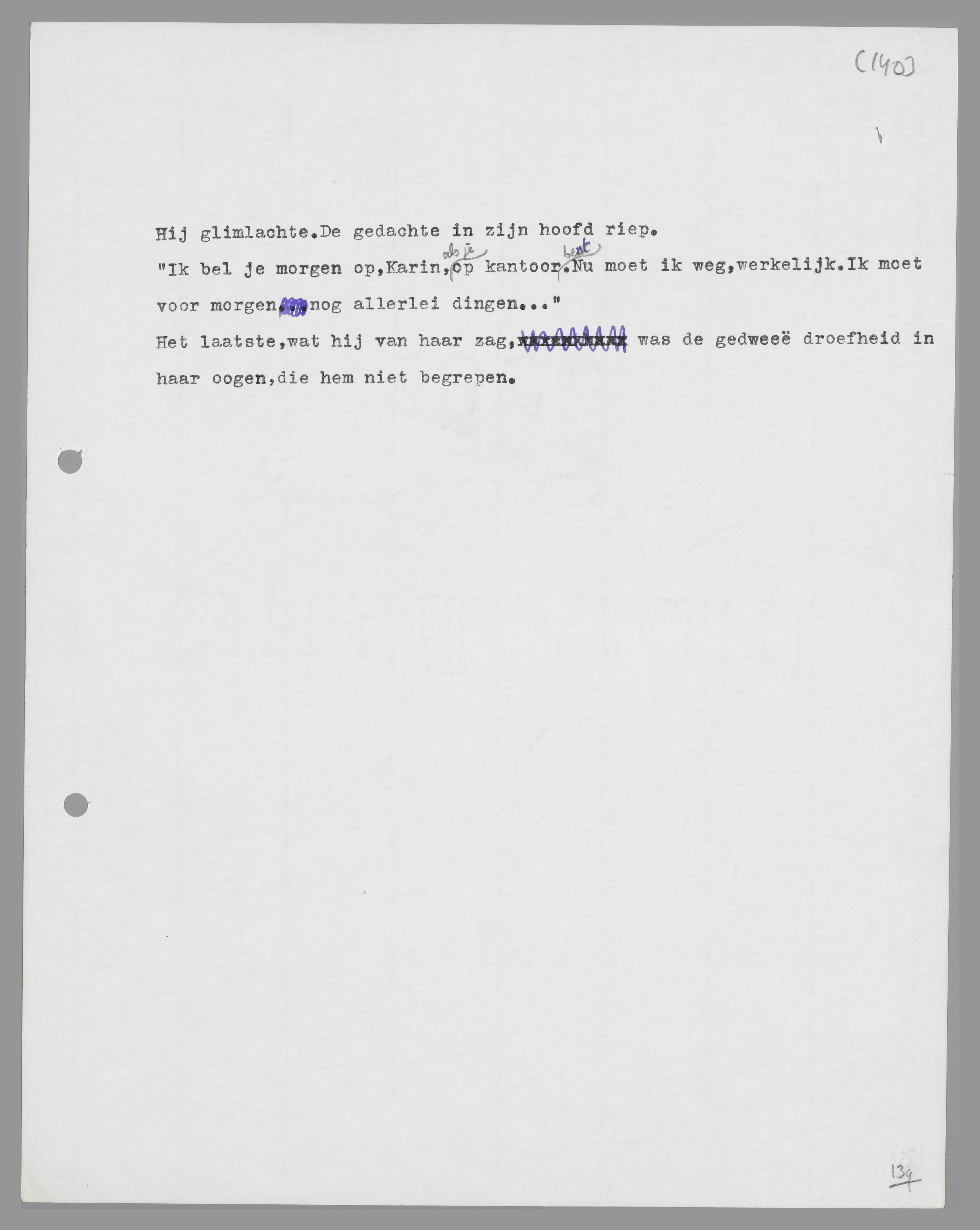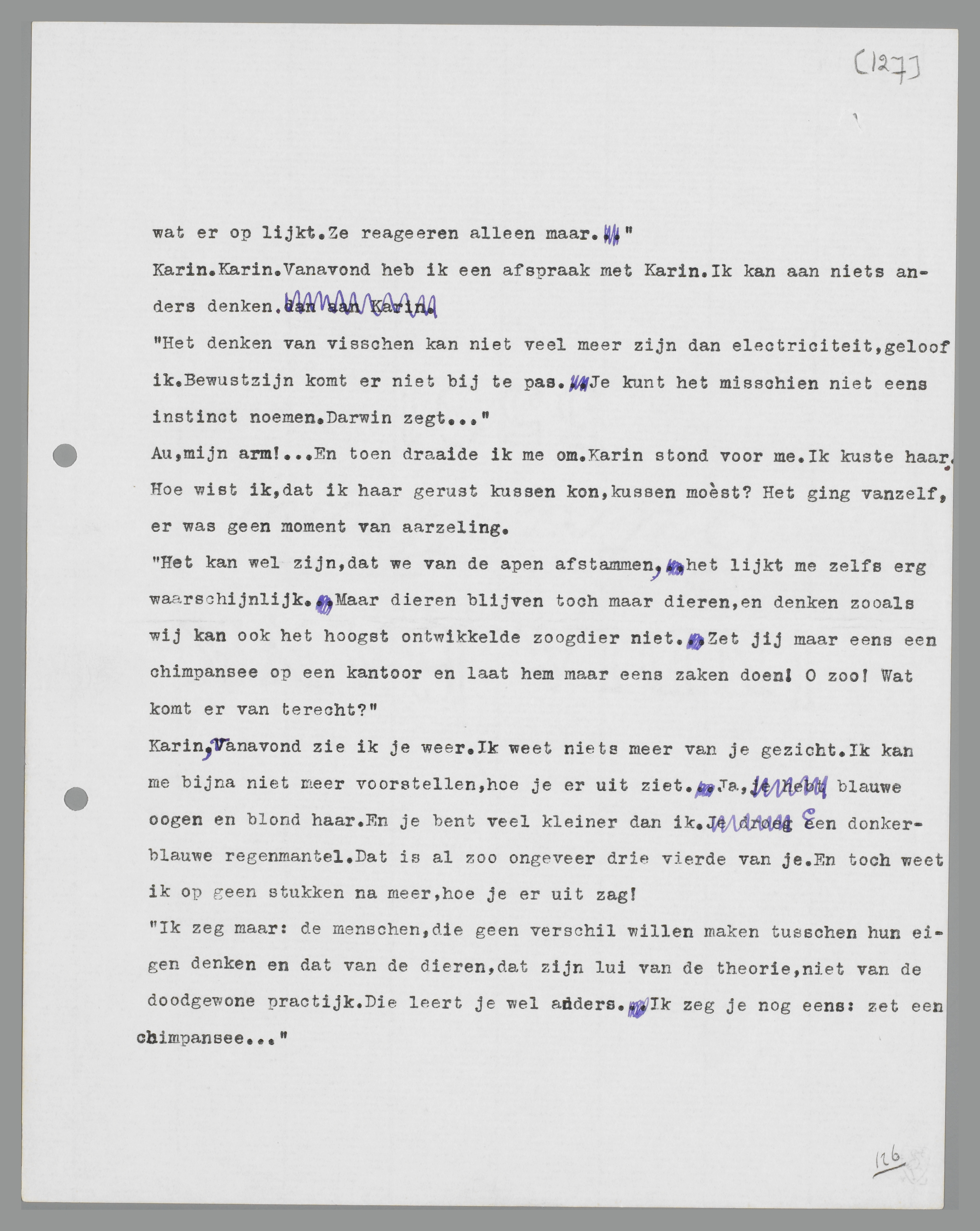 Karin, vanavond zie ik je weer. Ik weet niets meer van je gezicht. Ik kan me bijna niet meer voorstellen, hoe je er uitziet. Ja, blauwe oogen en blond haar. En je bent veel kleiner dan ik. Een donkerblauwe regenmantel. Dat is al zoo ongeveer drie vierde van je. En toch weet ik op geen stukken na meer, hoe je er uitzag!