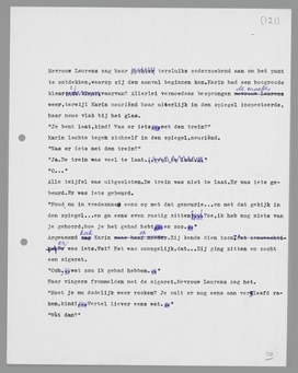 Mevrouw Laurens luisterde: de Kopenhaagsche pendule van haar mans moeder sloeg halftwaalf. En Karin was nog niet thuis! De trein moest al lang binnen zijn, zelfs al was er door den Zondagavond een kleine vertraging geweest... En plotseling viel haar blik weer op den omslag van het boek, op dat portret van die vrouw met bloemen in het haar, die het geschreven had. Haar angst golfde weer op: vanavond natuurlijk, juist vanavond, is er iets gebeurd! iets met Lucas en Karin... Gejaagd begon zij te loopen, heen en terug naar het tafeltje met de schemerlamp. ‘God, God, God, God, God, God,’ prevelde zij zachtjes voor zich heen. Was er al iets onherstelbaars gebeurd?... Zij bleef voor het portret staan en trachtte een voorbeschikking in de oogen te lezen, maar die staarden opgewekt langs haar heen. Op hetzelfde oogenblik