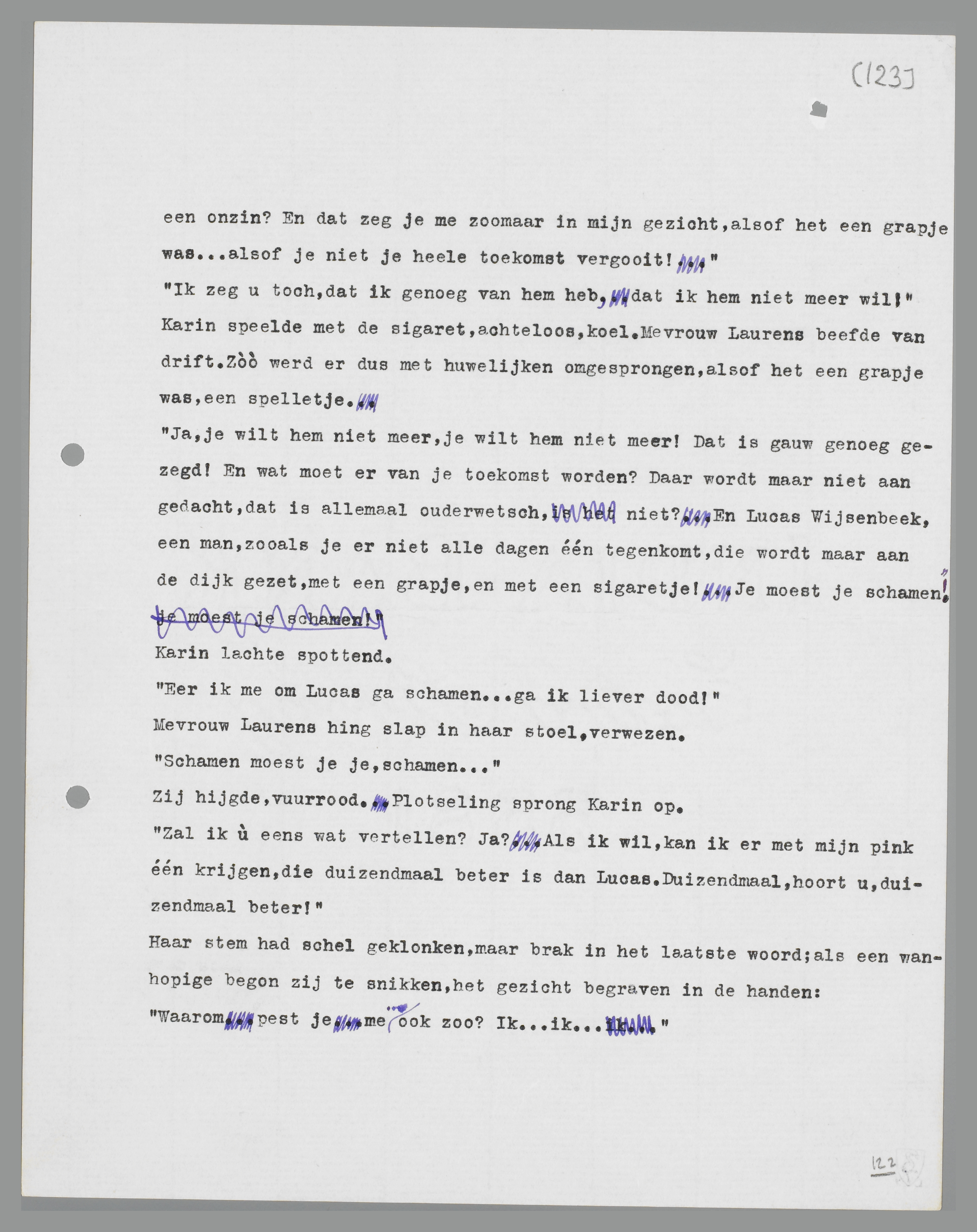 ‘Ja, je wilt hem niet meer, je wilt hem niet meer! Dat is gauw genoeg gezegd! En wat moet er van je toekomst worden? Daar wordt maar niet aan gedacht, dat is allemaal ouderwetsch, niet? En Lucas Wijsenbeek, een man, zooals je er niet alle dagen één tegenkomt, die wordt maar aan de dijk gezet, met een grapje, en met een sigaretje! Je moest je schamen!’