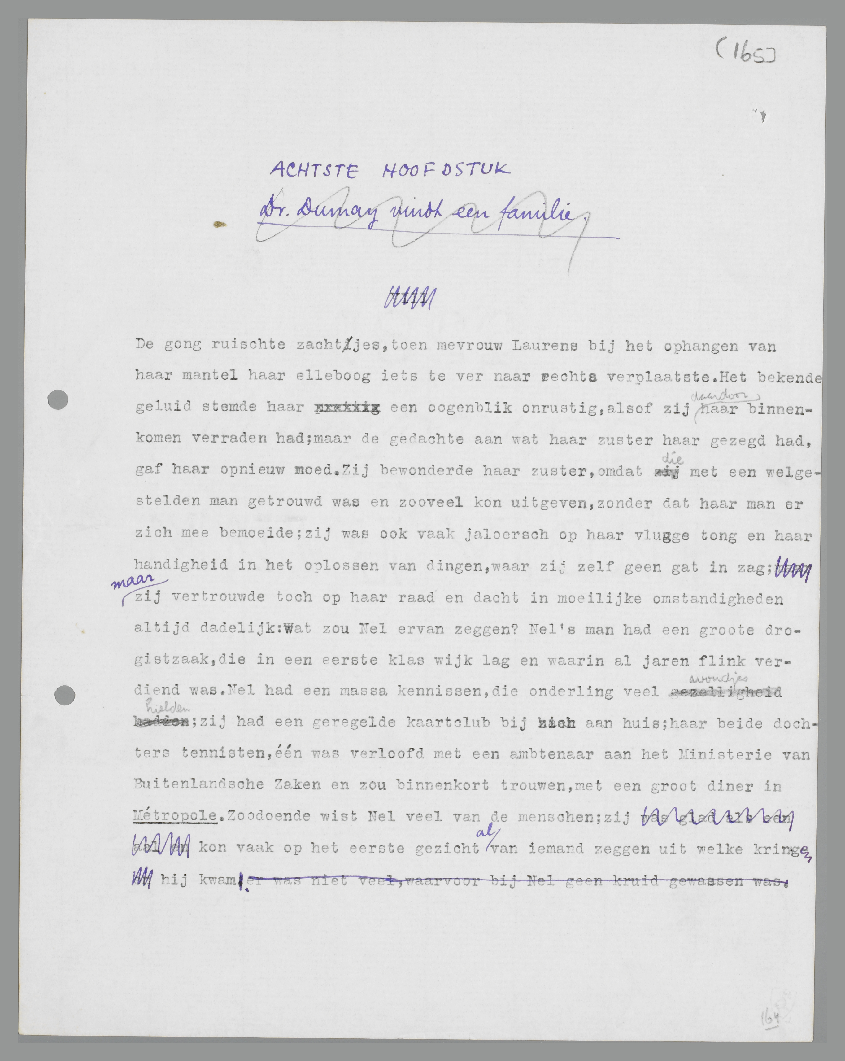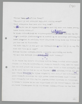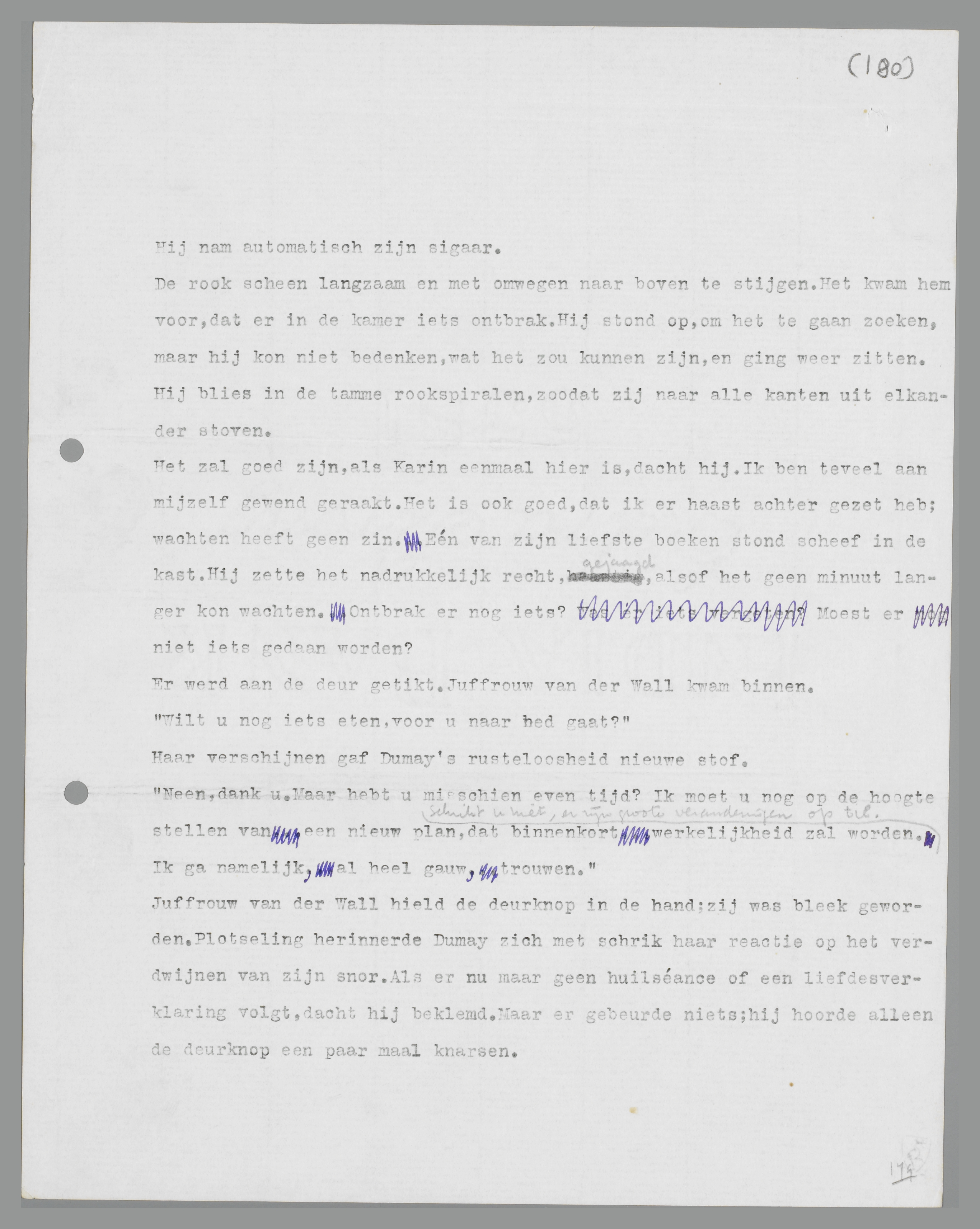 Juffrouw van der Wall hield den deurknop in de hand; zij was bleek geworden. Plotseling herinnerde Dumay zich met schrik haar reactie op het verdwijnen van zijn snor. Als er nu maar geen huilséance of een liefdesverklaring volgt, dacht hij beklemd. Maar er gebeurde niets; hij hoorde alleen dien deurknop een paar maal knarsen.