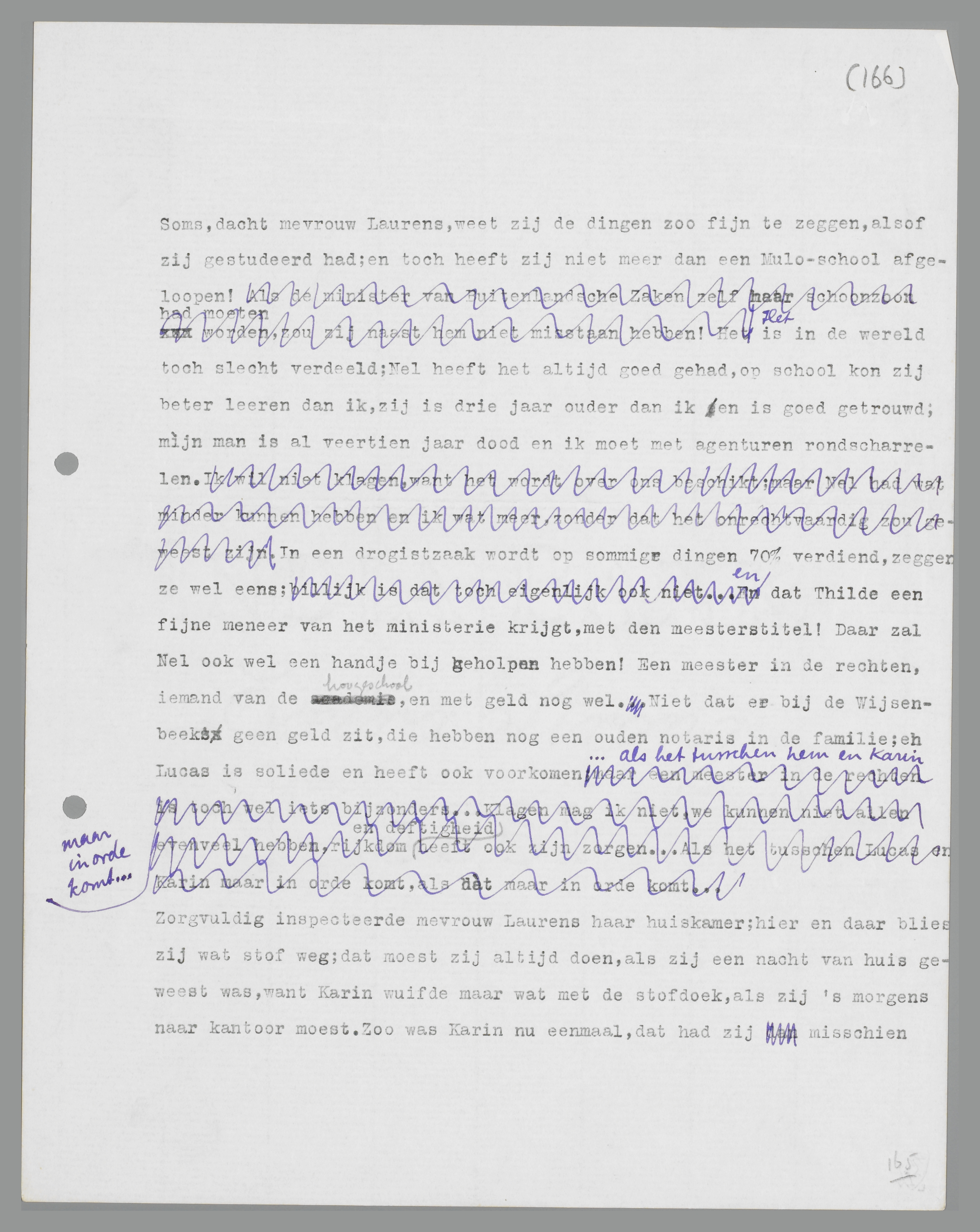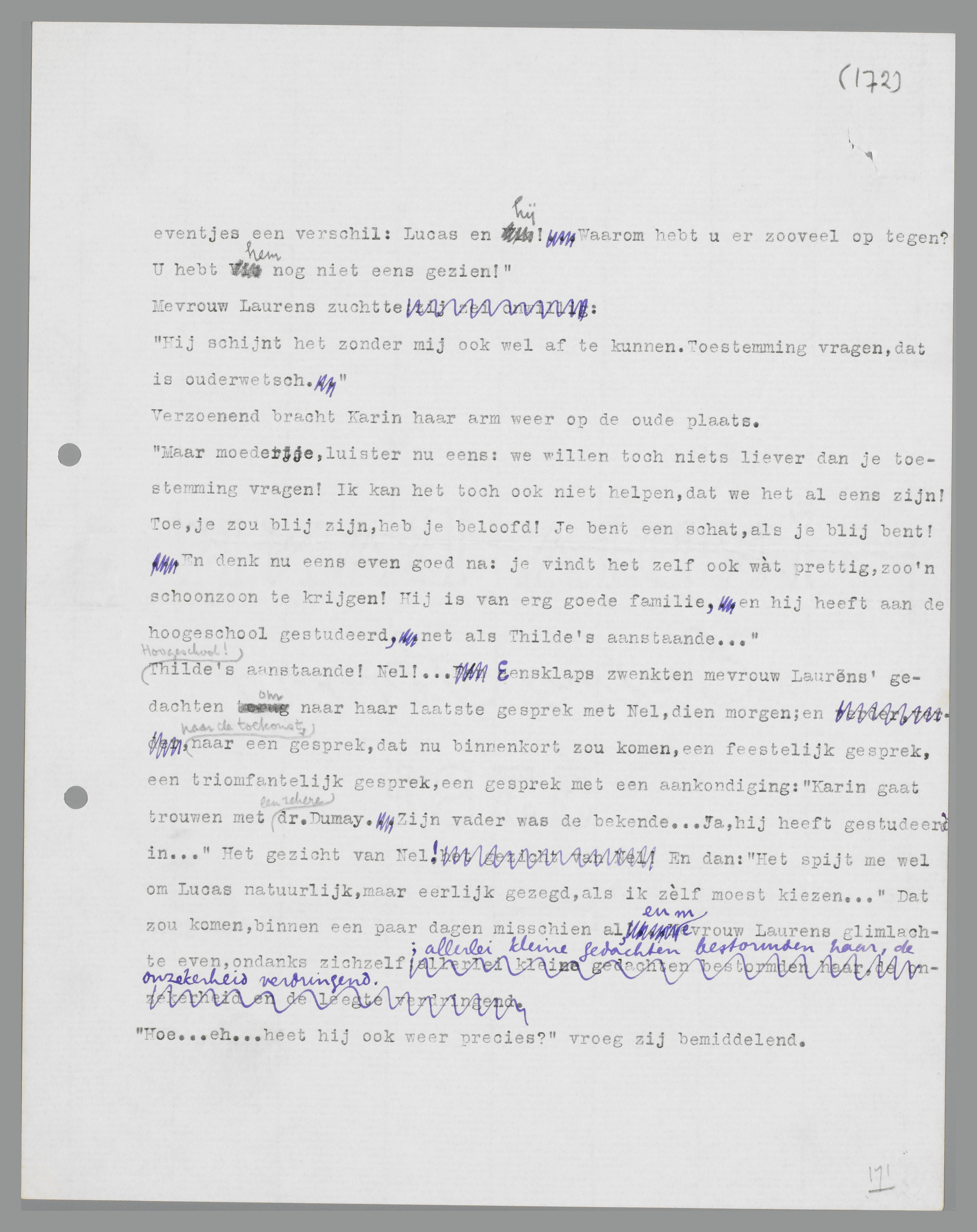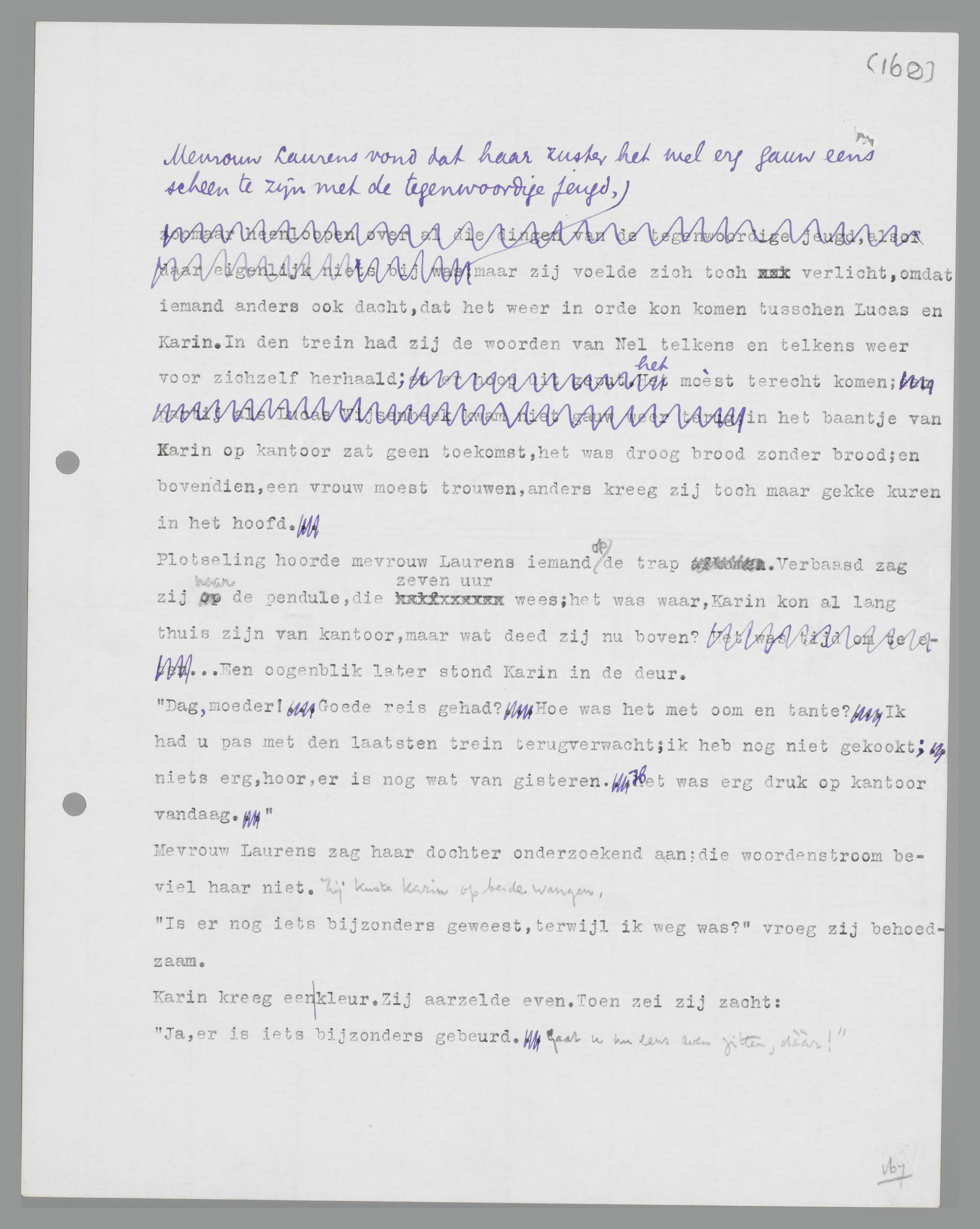 Mevrouw Laurens vond dat haar zuster het wel erg gauw eens scheen te zijn met de tegenwoordige jeugd, maar zij voelde zich toch verlicht, omdat iemand anders ook dacht, dat het weer in orde kon komen tusschen Lucas en Karin. In den trein had zij de woorden van Nel telkens en telkens weer voor zichzelf herhaald; het moèst terecht komen; in het baantje van Karin op kantoor zat geen toekomst, het was droog brood zonder brood; en bovendien