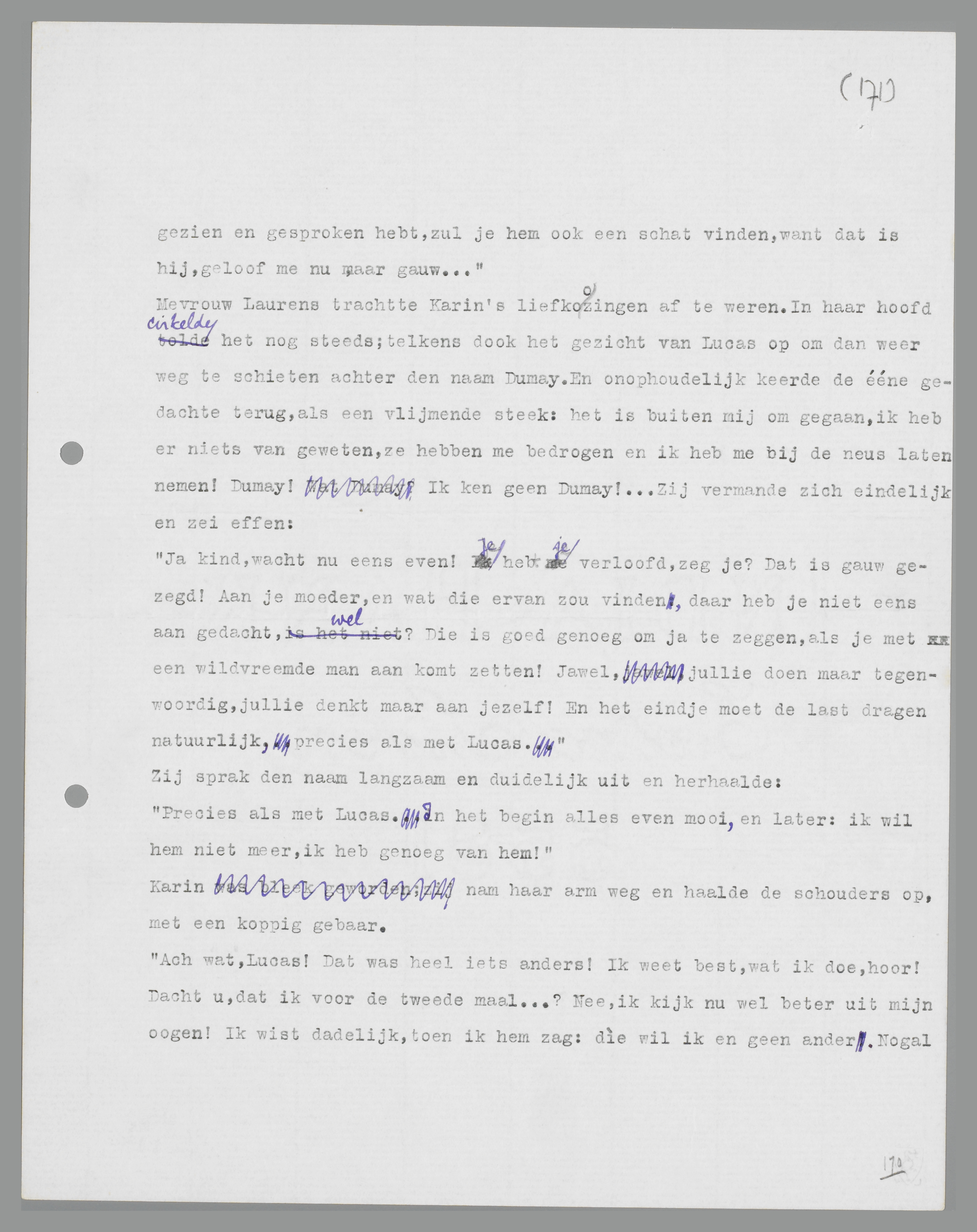 Met glazige oogen staarde mevrouw Laurens voor zich uit; bij Karin's eerste woorden was iets in haar met een knal kapotgesprongen en in scherven naar beneden gerinkeld; zij was in een groote leegte gezonken, waarin het draaide en cirkelde; de woorden van Karin drongen niet verder tot haar door. Zij hoorde ze wel, maar achter het hameren van een raren naam, een beleedigend onbekenden naam, die eensklaps in de plaats van Lucas was getreden zonder ook maar even te hebben gewaarschuwd. Vol doffen haat hoorde zij dien naam bonzen, die haar in één minuut was aangepraat: Dumee... Dumee... Wat Dumee? Wie is Dumee? Is dàt een manier van doen? Gaat dat tegenwoordig zóó? En dat wil trouwen? Maar ik ben er ook nog, ìk moet mijn toestemming geven, ìk laat maar niet alles over mijn kant gaan, ìk... Zij voelde de leegte nader tollen, haar in een kolk zuigen; toen zat