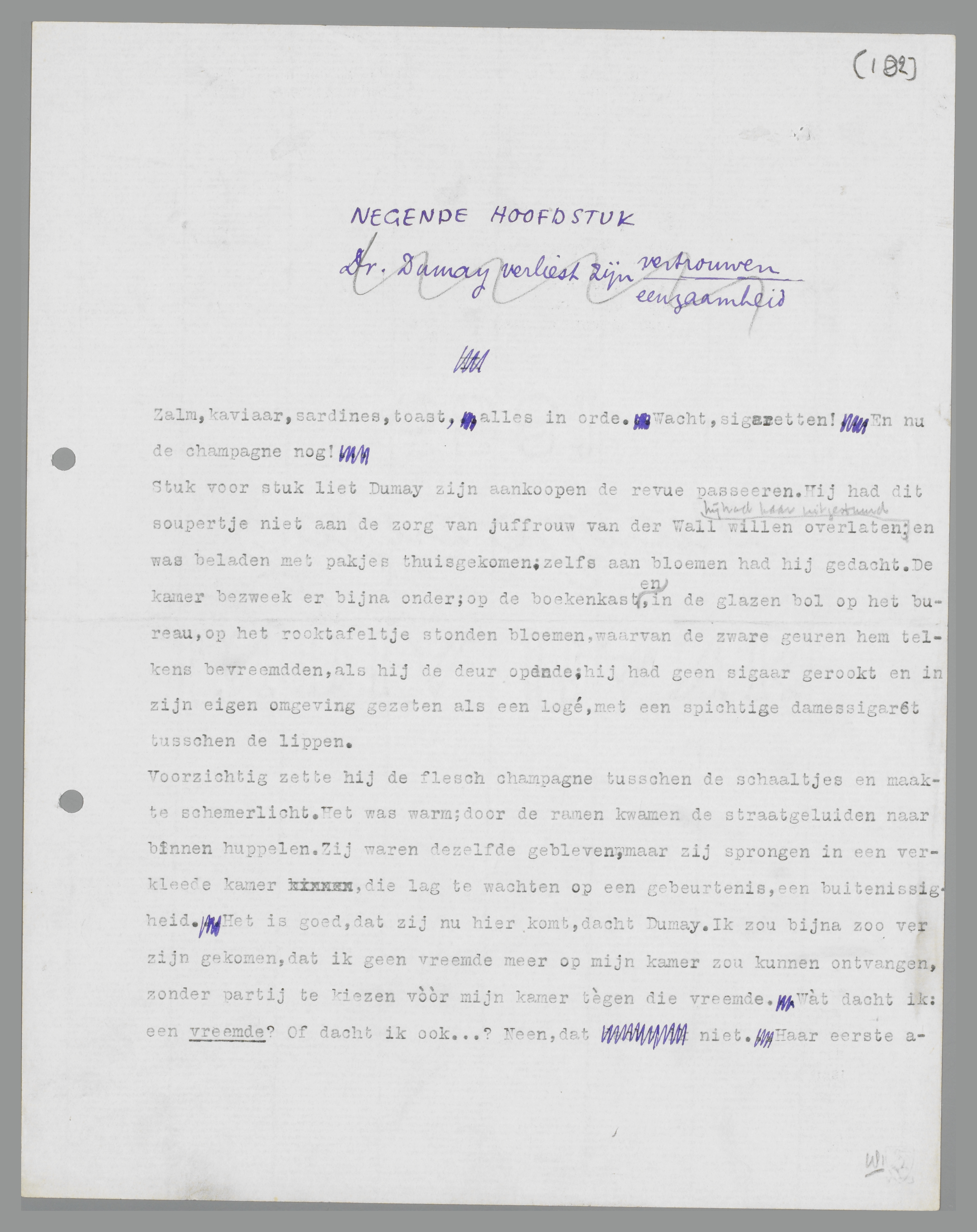 Voorzichtig zette hij de flesch champagne tusschen de schaaltjes en maakte schemerlicht. Het was warm; door de ramen kwamen de straatgeluiden naar binnen huppelen. Zij waren dezelfde gebleven, maar zij sprongen in een verkleede kamer, die lag te wachten op een gebeurtenis, een buitenissigheid. Het is goed, dat zij nu hier komt, dacht Dumay. Ik zou bijna zoo ver zijn gekomen, dat ik geen vreemde meer op mijn kamer zou kunnen ontvangen, zonder partij te kiezen vóór mijn kamer tégen die vreemde. Wàt dacht ik: een vreemde? Of dacht ik ook...? Neen, dat niet. Haar eerste avond hier zal een feest voor haar zijn; zij moet haar toekomstig huis de eerste maal zien als een feestelijk, ongewoon iets, niet als een normaal bovenhuis. Straks zullen wij samen champagne drinken, en het zal het begin zijn van een nieuw leven.