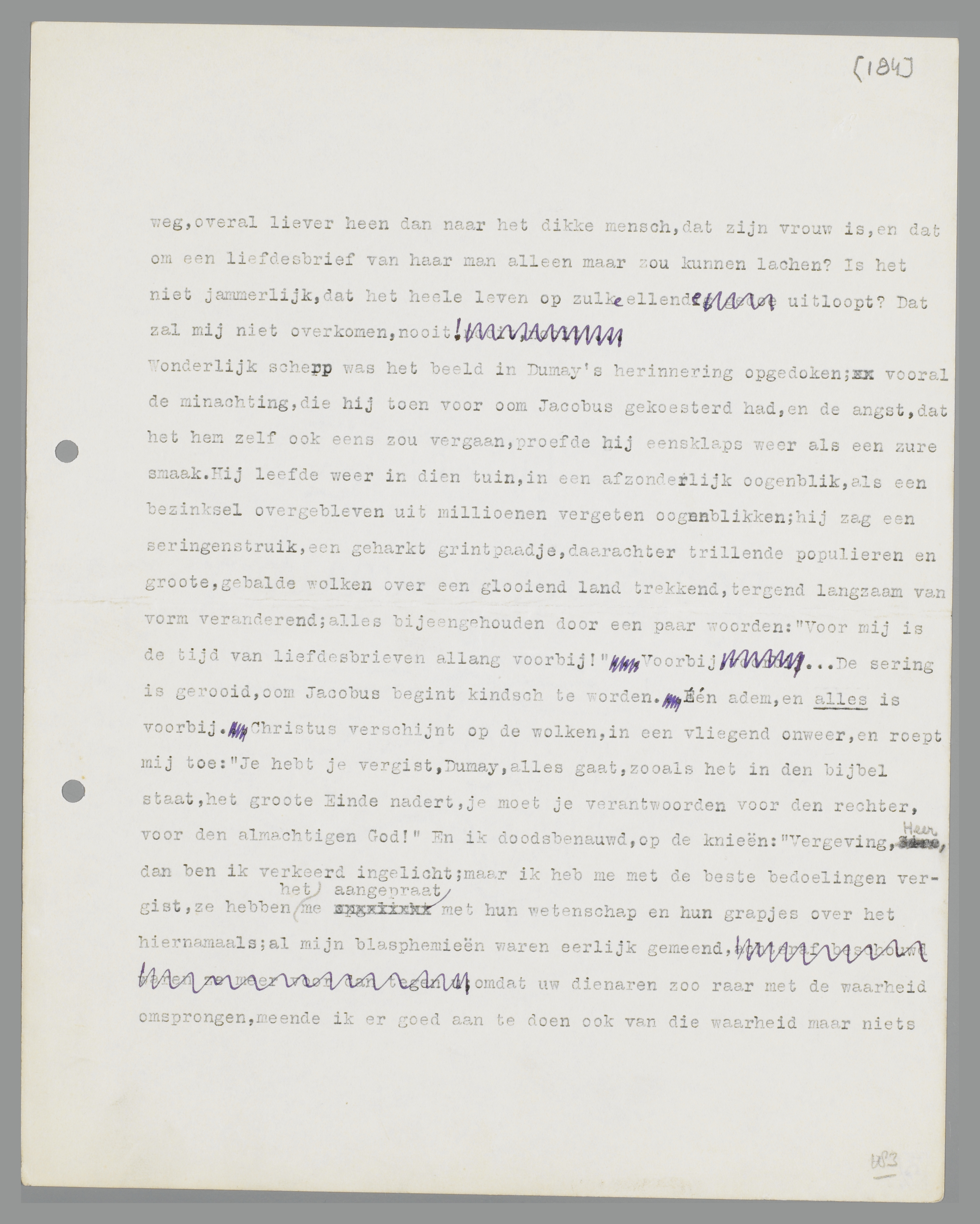 een zuren smaak. Hij leefde weer in dien tuin, in een afzonderlijk oogenblik, als een bezinksel overgebleven uit millioenen vergeten oogenblikken; hij zag een seringestruik, een geharkt grintpaadje, daarachter trillende populieren en groote, gebalde wolken over een glooiend land trekkend, tergend langzaam van vorm veranderend; alles bijeengehouden door een paar woorden: ‘Voor mij is de tijd van liefdesbrieven allang voorbij!’ Voorbij... De sering is gerooid, oom Jacobus begint kindsch te worden. Eén adem, en alles is voorbij. Christus verschijnt op de wolken, in een vliegend onweer, en roept mij toe: ‘Je hebt je vergist, Dumay, alles gaat, zooals het in den bijbel staat, het groote Einde nadert, je moet je verantwoorden voor den rechter, voor den almachtigen God!’ En ik doodsbenauwd, op de knieën: ‘Vergeving, Heer, dan ben ik verkeerd ingelicht; maar ik heb me met de beste bedoelingen vergist, ze hebben het me aangepraat met hun wetenschap en hun grapjes over het hiernamaals; al mijn blasphemieën waren eerlijk gemeend ; omdat uw dienaren zoo raar met de waarheid omsprongen, meende ik er goed aan te doen ook van die waarheid maar niets meer te gelooven. Zonder bewijzen handelen leek mij altijd lofwaardig; nu het anders blijkt te zijn, soit, maar verwerp niet de eerlijkheid van iemand die het eerlijk zonder u meende te kunnen stellen.’ Zou dit dilemma ontvankelijk worden verklaard? zou...
