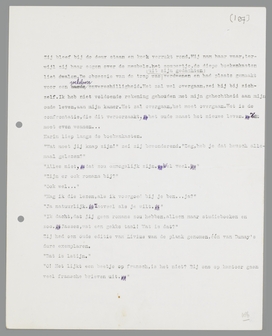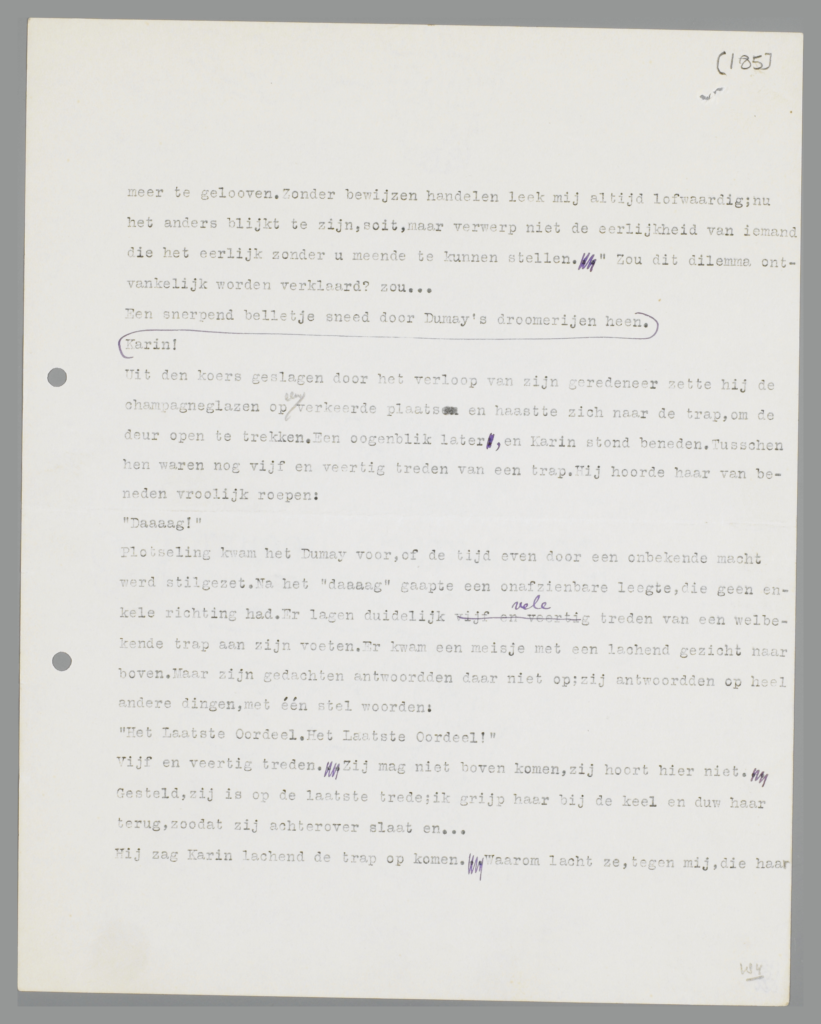 Hij zag Karin lachend de trap op komen. Waarom lacht ze, tegen mij, die haar verfoeit?... Trap, trap, trap... Het is mìjn trap, je hebt hier niets te maken... trap, trap, trap... blijf waar je bent, laat me eerst nadenken, doordenken, nadenken, doordenken... trap, trap, trap... zet alles stil, tot ik weet, hoe of wat; remmen!... trap, trap, trap... ik heb alles verkeerd gedaan, ik heb gezondigd... trap, trap, trap... en zij làcht, tegen mij, mij, mij!... trap, trap, trap, trap...